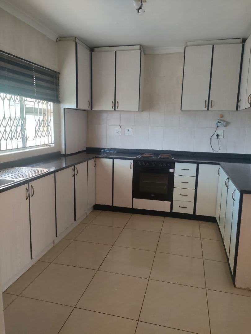 Step inside and discover a spacious lounge and a dedicated dining room, both featuring easy-to-clean tiled floors and plenty of natural light. The home is equipped with air conditioning to keep you cool, and you'll appreciate the modern ceiling light fixtures. The kitchen is practical and well-appointed, boasting ample white cabinetry, dark countertops, an integrated oven, and a double sink, all illuminated by a window with security grilles.