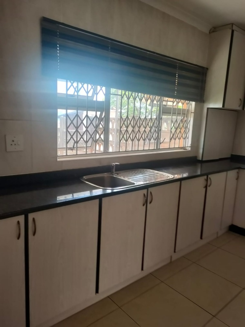 Step inside and discover a spacious lounge and a dedicated dining room, both featuring easy-to-clean tiled floors and plenty of natural light. The home is equipped with air conditioning to keep you cool, and you'll appreciate the modern ceiling light fixtures. The kitchen is practical and well-appointed, boasting ample white cabinetry, dark countertops, an integrated oven, and a double sink, all illuminated by a window with security grilles.