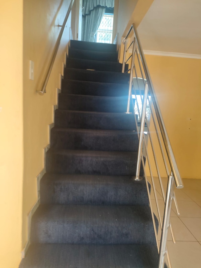 Upstairs, you'll find the bedrooms, each with tiled flooring and windows fitted with security bars for added safety. The staircase features modern stainless steel railings, adding a touch of contemporary style. This home is a fantastic opportunity to create your ideal living space in a vibrant South African community.