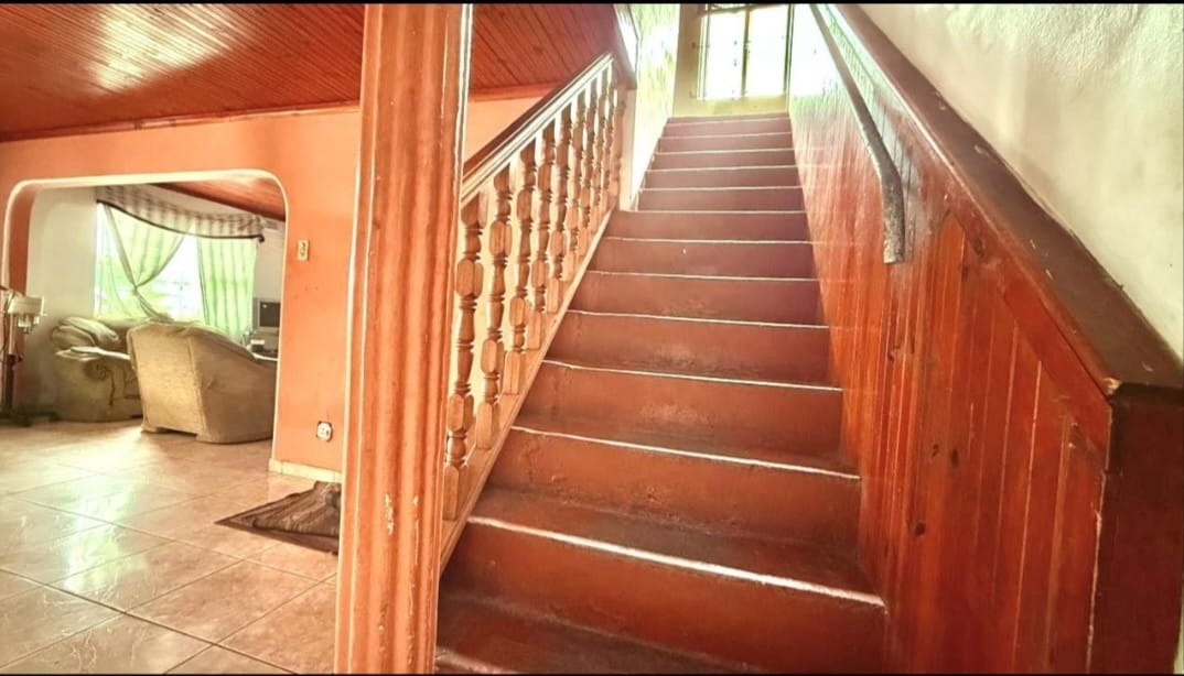 The property features three well-sized bedrooms with wooden flooring, an upstairs bathroom with a tub and hand shower, and a second bathroom downstairs with a shower, basin, and toilet for added convenience. The lounge and dining area offer a solid living space with tiled floors and a wooden ceiling, while the kitchen is ready to be updated to suit your personal style.