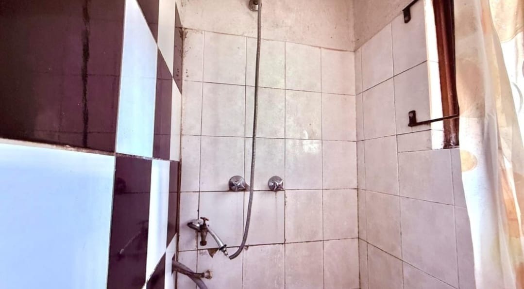 The property features three well-sized bedrooms with wooden flooring, an upstairs bathroom with a tub and hand shower, and a second bathroom downstairs with a shower, basin, and toilet for added convenience. The lounge and dining area offer a solid living space with tiled floors and a wooden ceiling, while the kitchen is ready to be updated to suit your personal style.
