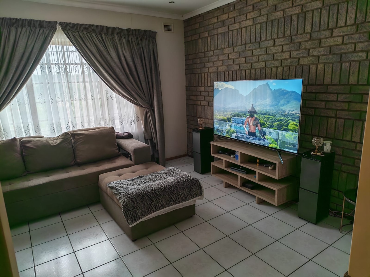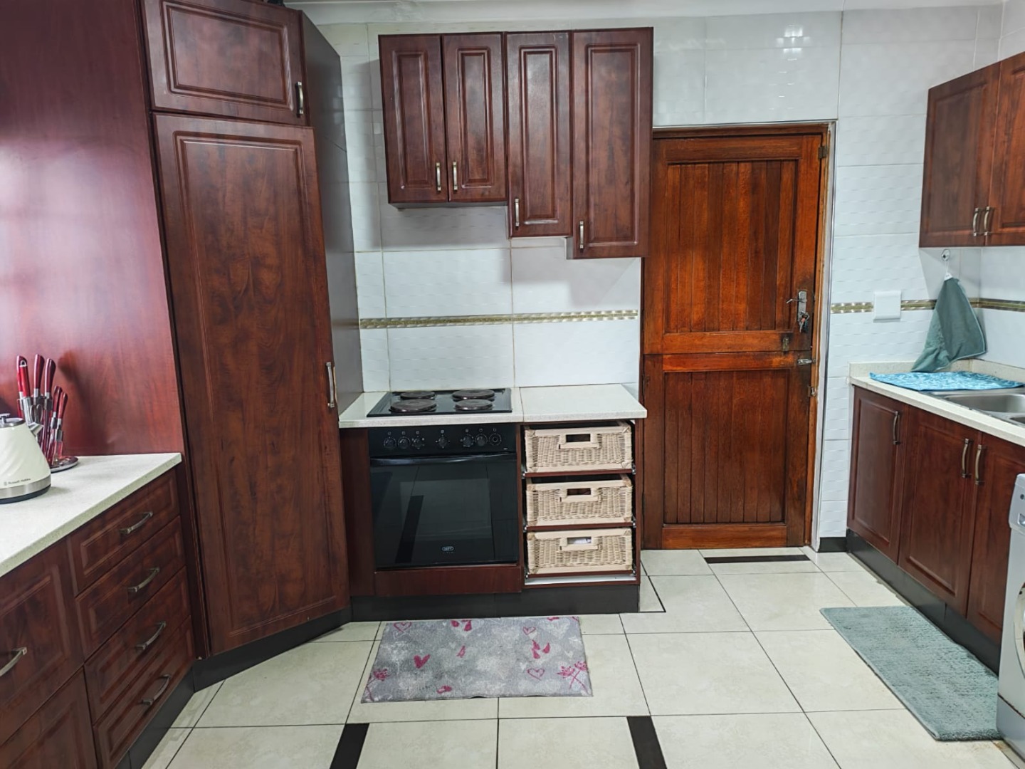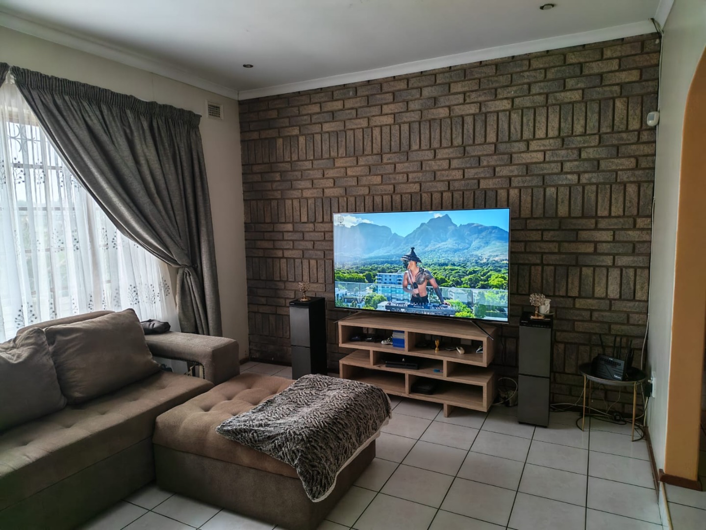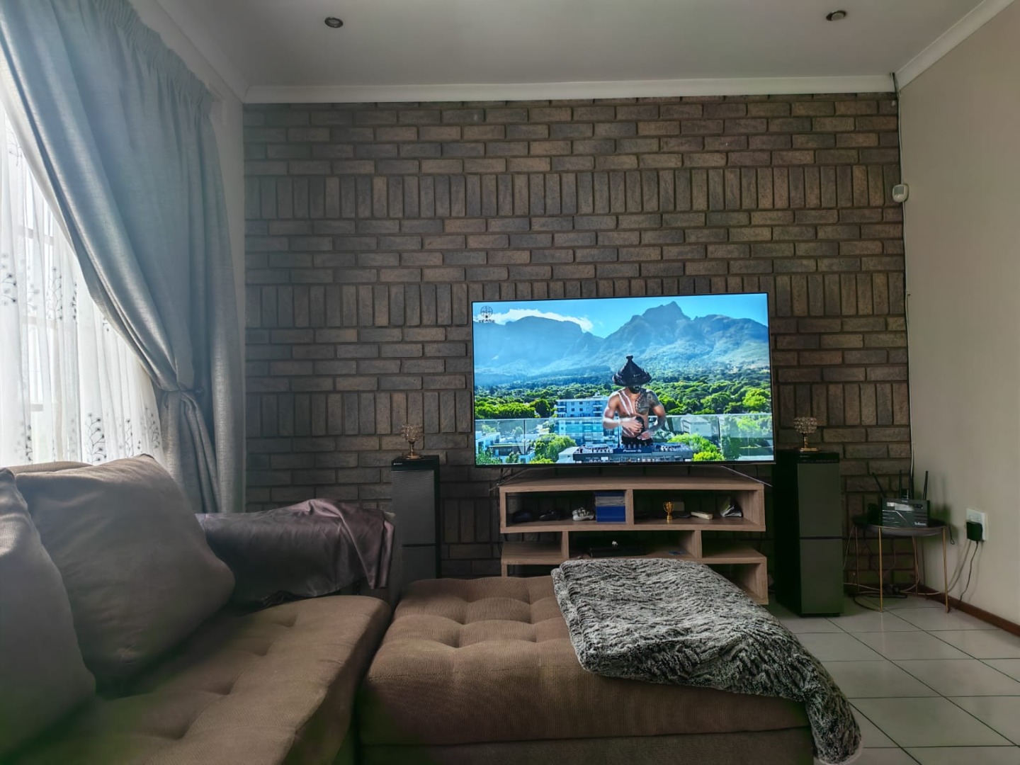 Step inside and discover a warm, inviting atmosphere. The heart of the home is the open-plan kitchen and dining area, perfect for family meals and social gatherings. The kitchen boasts ample dark wood cabinetry, modern appliances including an oven and gas hob, plus a handy breakfast bar for quick bites. You'll find two comfortable lounges, each featuring durable tiled flooring and large windows that let in lots of natural light. One lounge even has a cool brick accent wall and a modern TV setup, making it a great spot to relax.