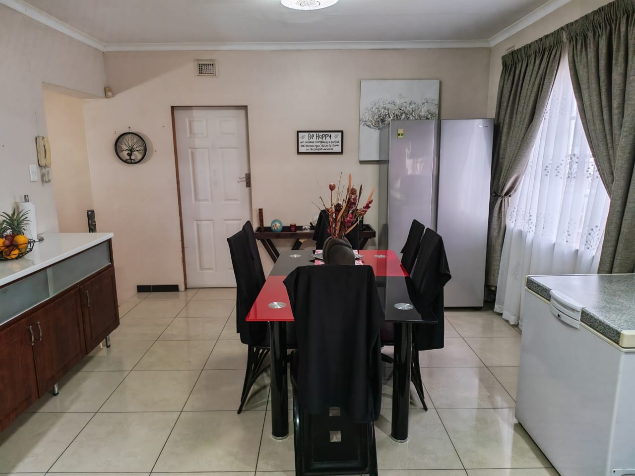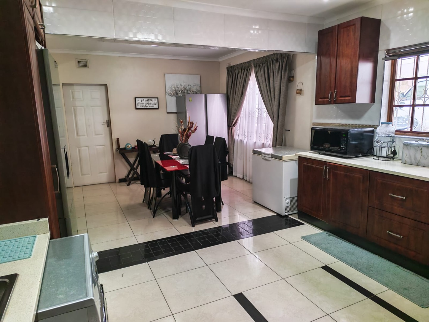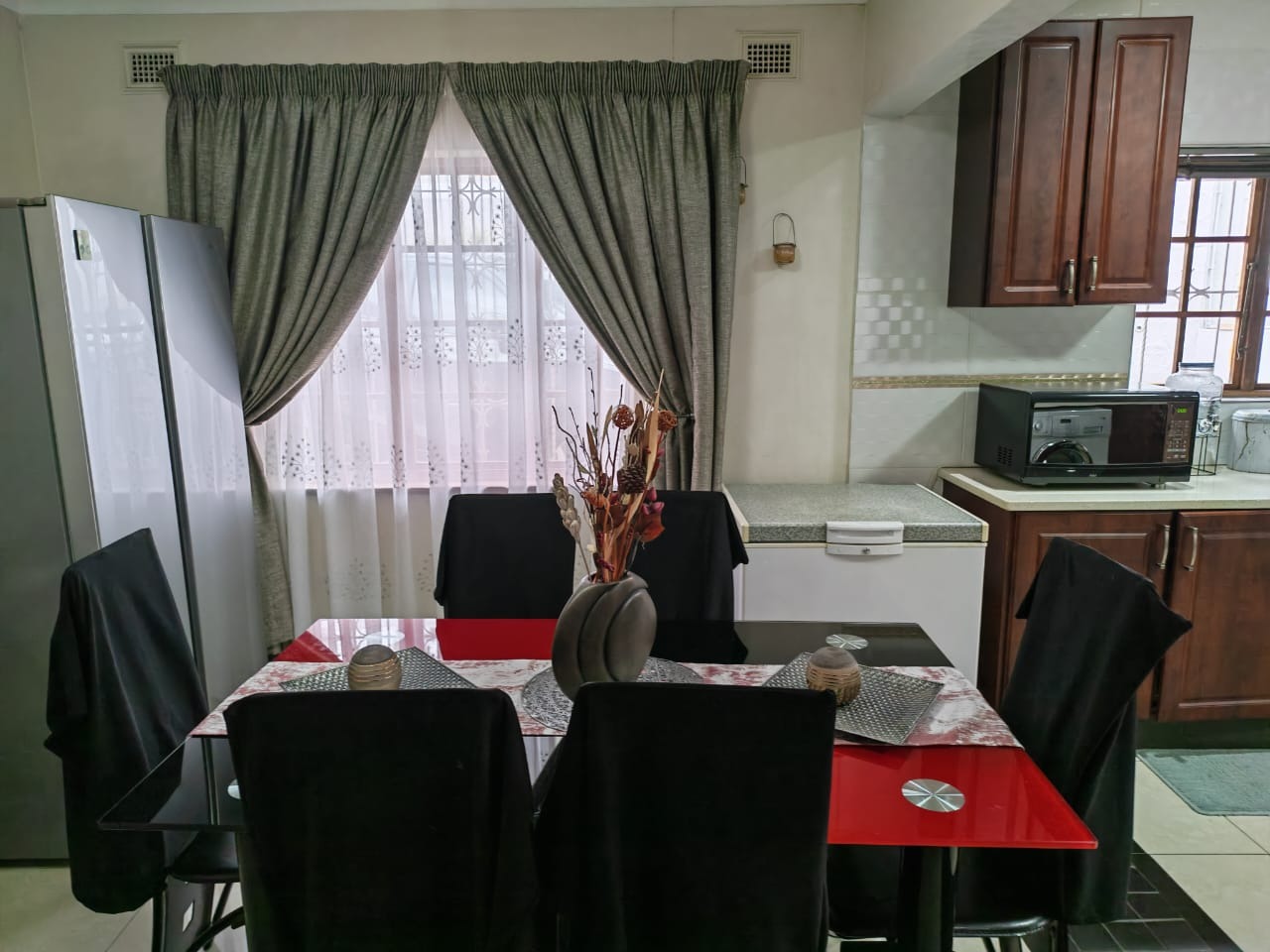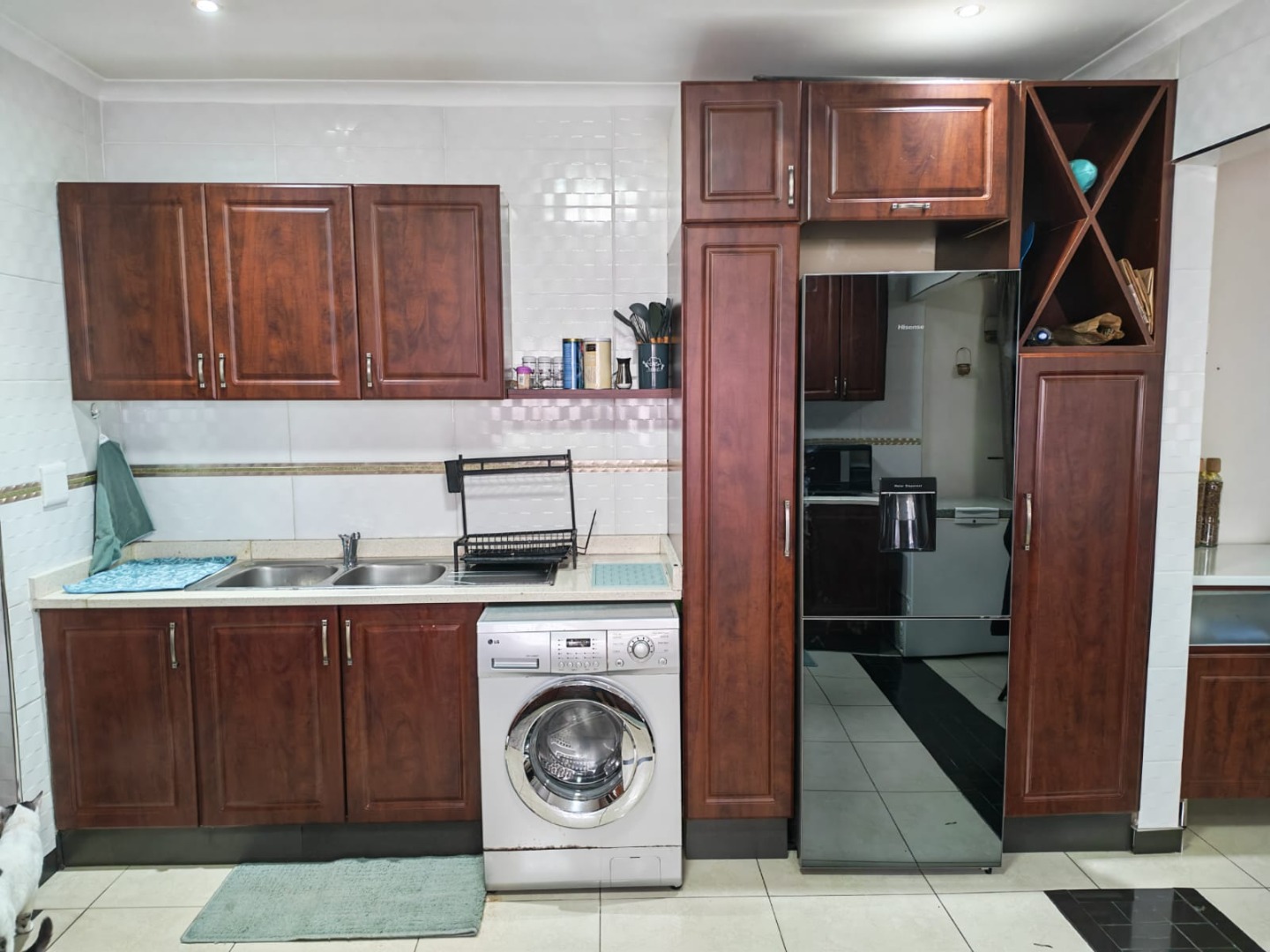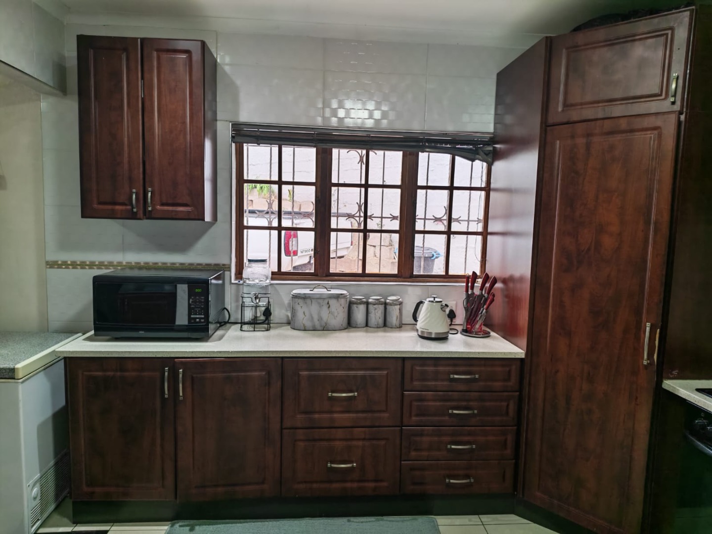 Step inside and discover a warm, inviting atmosphere. The heart of the home is the open-plan kitchen and dining area, perfect for family meals and social gatherings. The kitchen boasts ample dark wood cabinetry, modern appliances including an oven and gas hob, plus a handy breakfast bar for quick bites. You'll find two comfortable lounges, each featuring durable tiled flooring and large windows that let in lots of natural light. One lounge even has a cool brick accent wall and a modern TV setup, making it a great spot to relax.