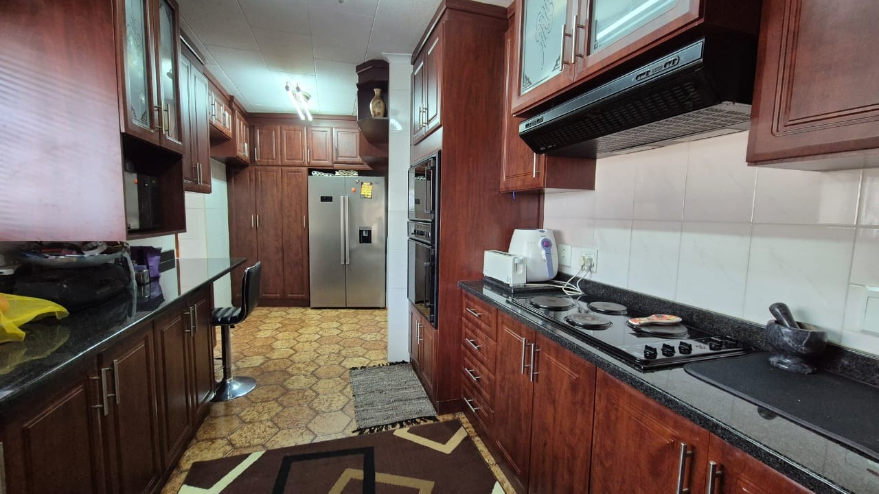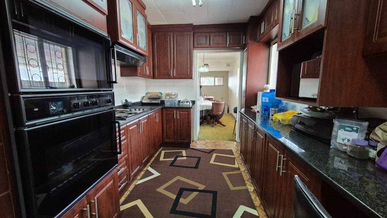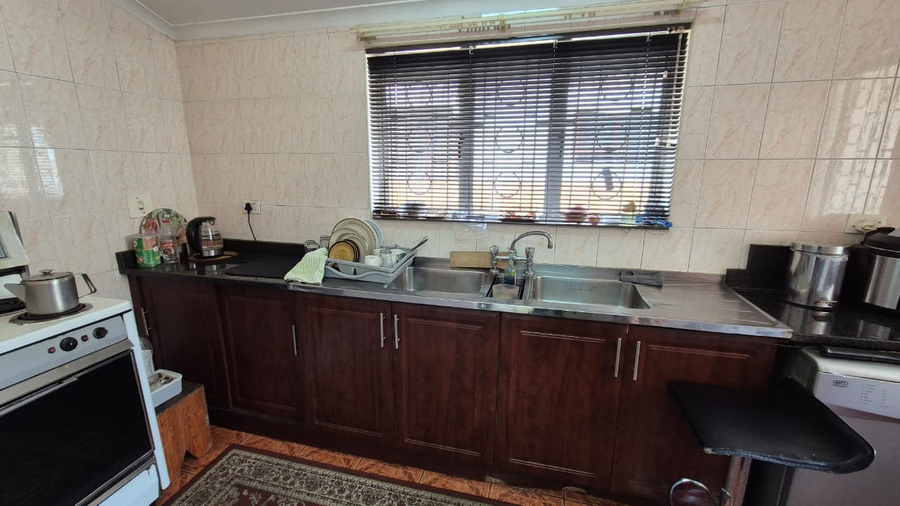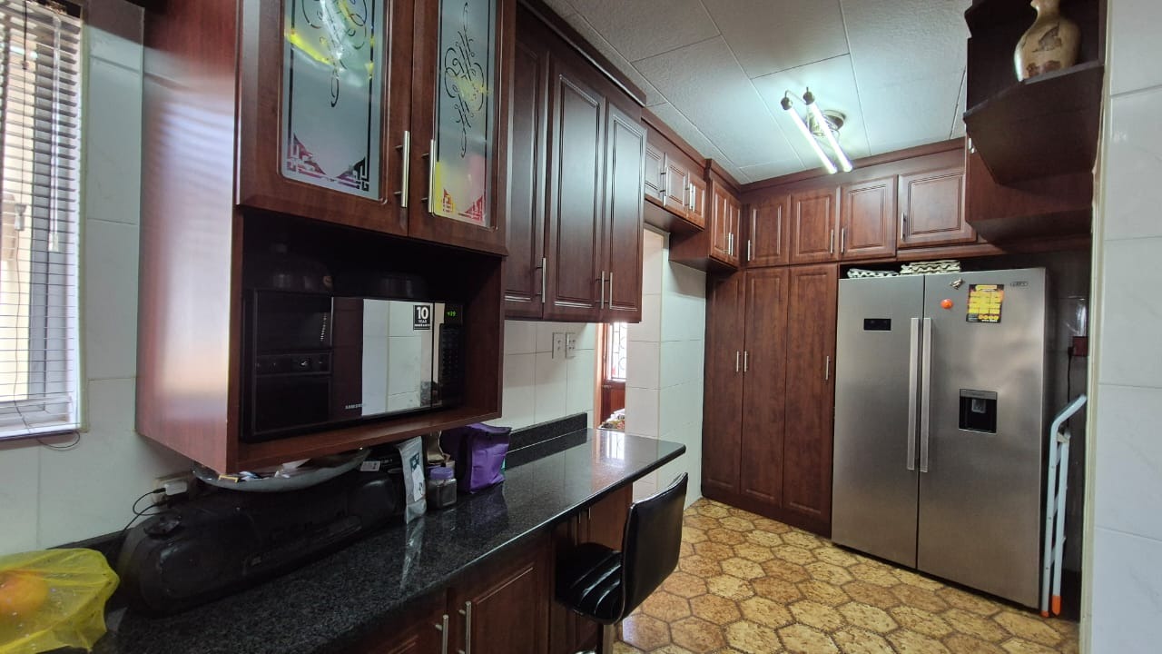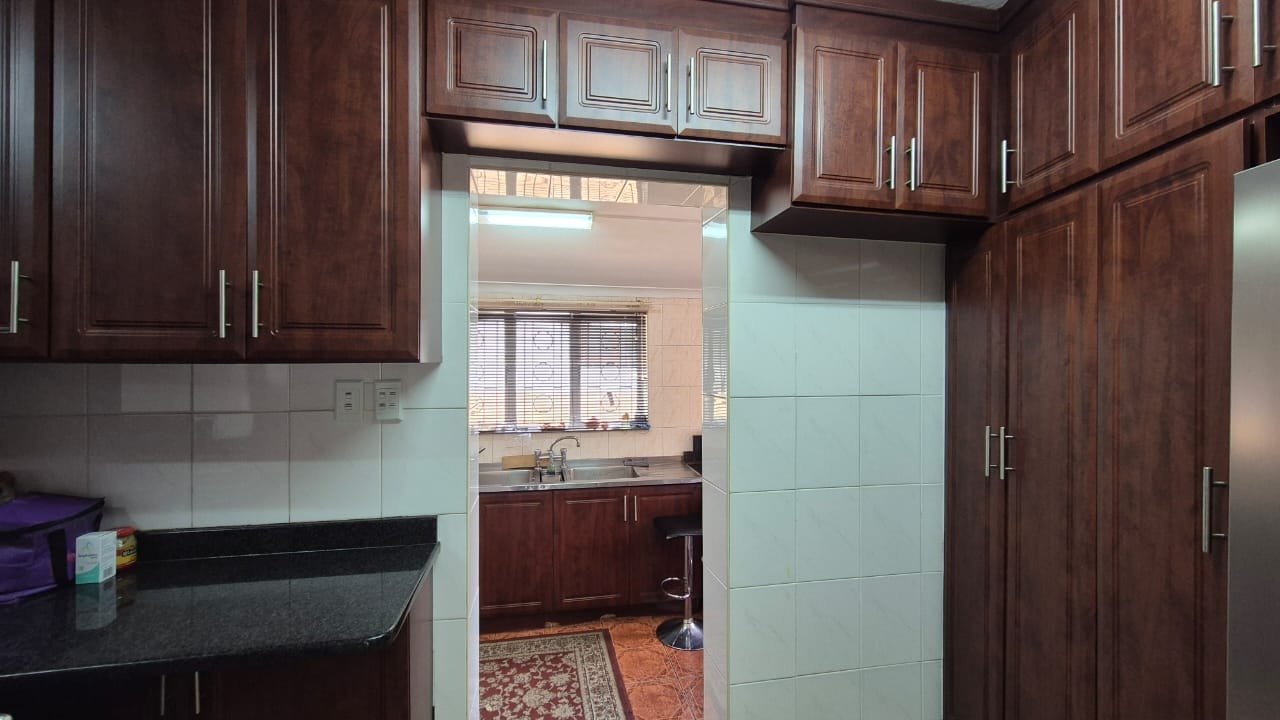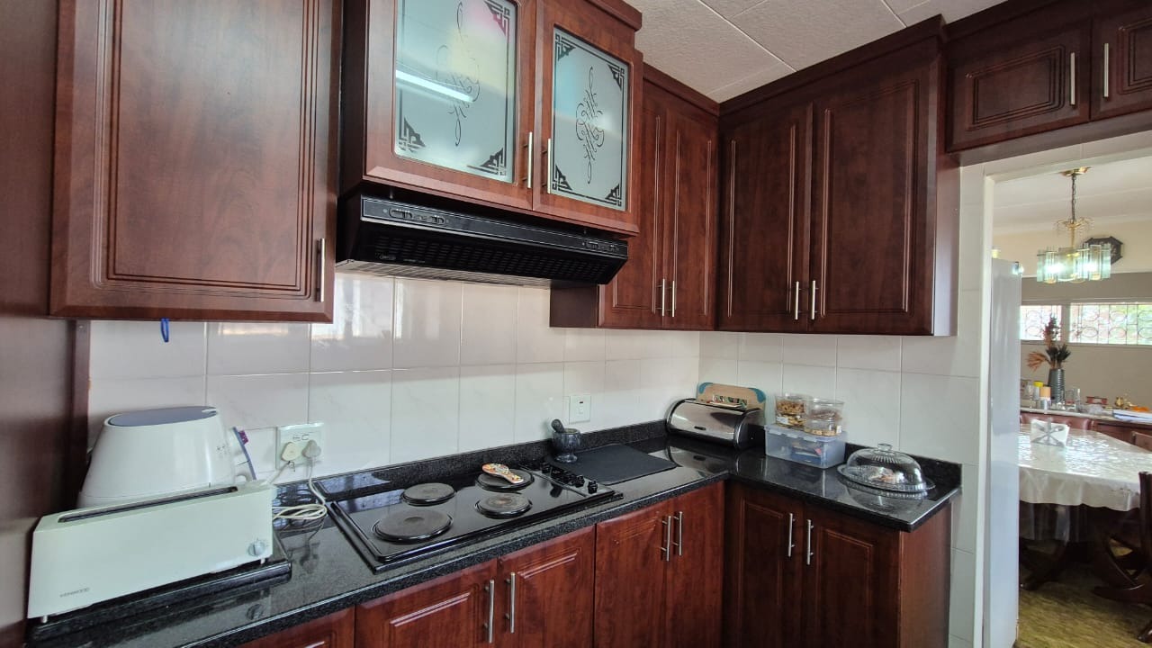 The kitchen is modern and practical, boasting granite countertops, ample cupboard space, a hob, and an eye-level oven. A separate scullery adds extra convenience, while the dining area features a staircase leading down to a flatlet – currently blocked off but easily accessible if required.