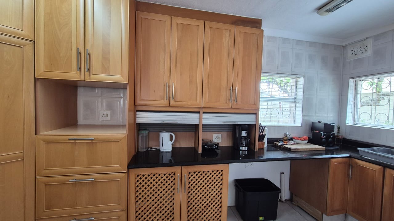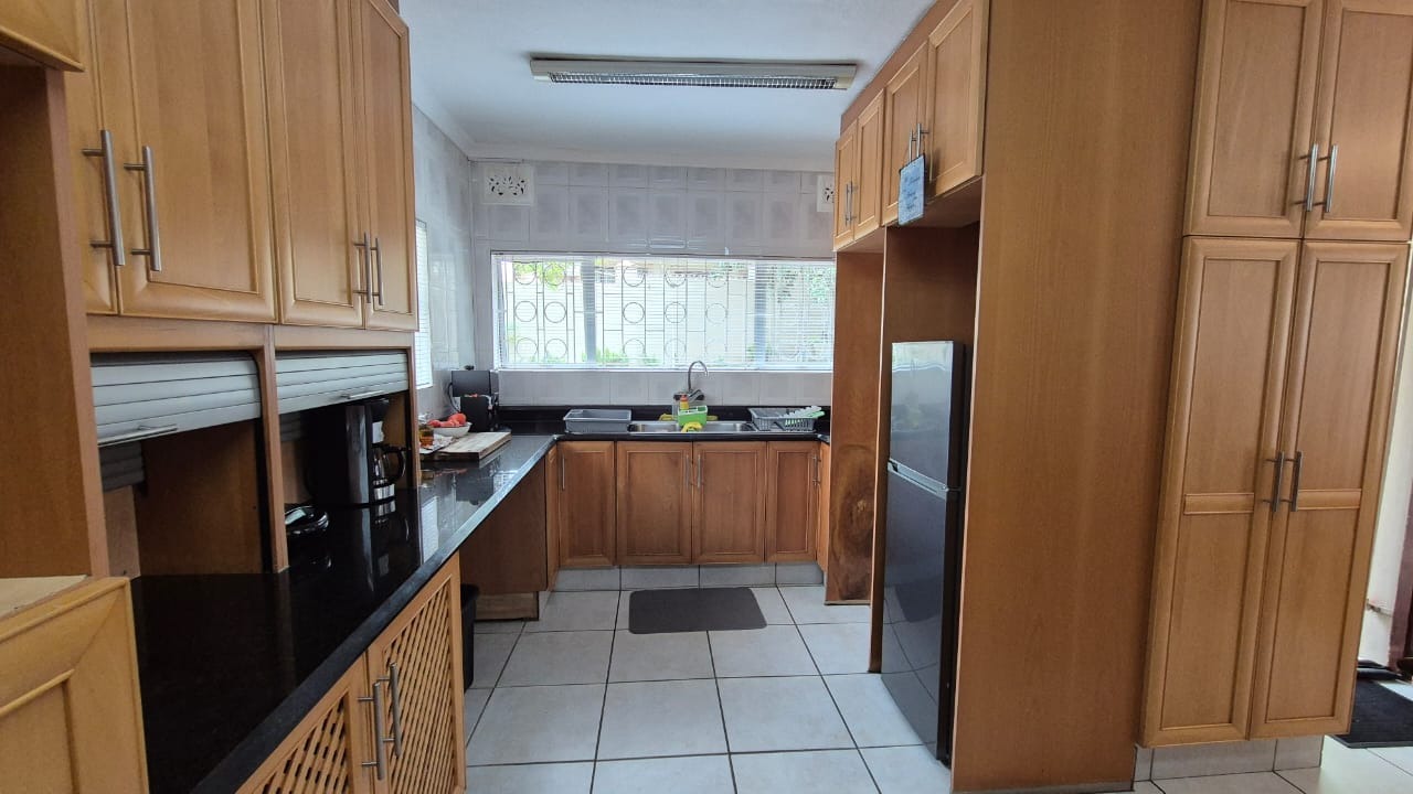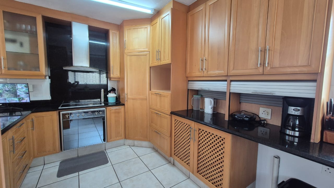 The interior boasts a thoughtfully designed layout, commencing with a well-appointed kitchen featuring extensive solid Beechwood cabinetry, sleek black granite countertops, and modern stainless steel cooking appliances. Ample storage is provided through various cabinet types, including integrated appliance garages. The expansive living areas, including a dedicated lounge and family TV room, are characterised by distinctive wooden ceilings, durable tiled flooring, and large windows and sliding doors that afford abundant natural light and panoramic views. A formal dining room further enhances the property's functional elegance. this conveniently leads out through a sliding door into the garden or braai area.