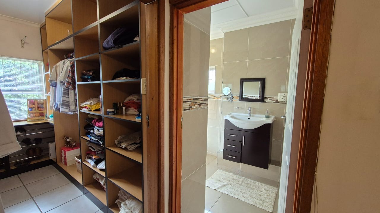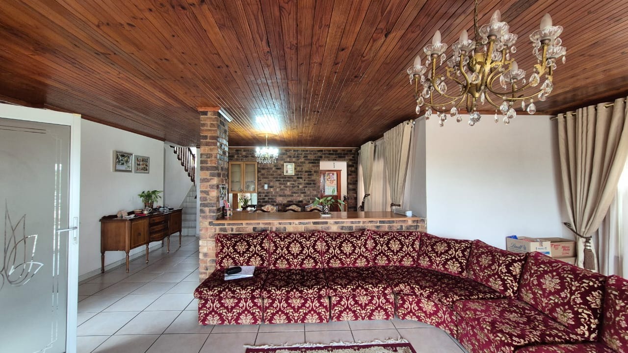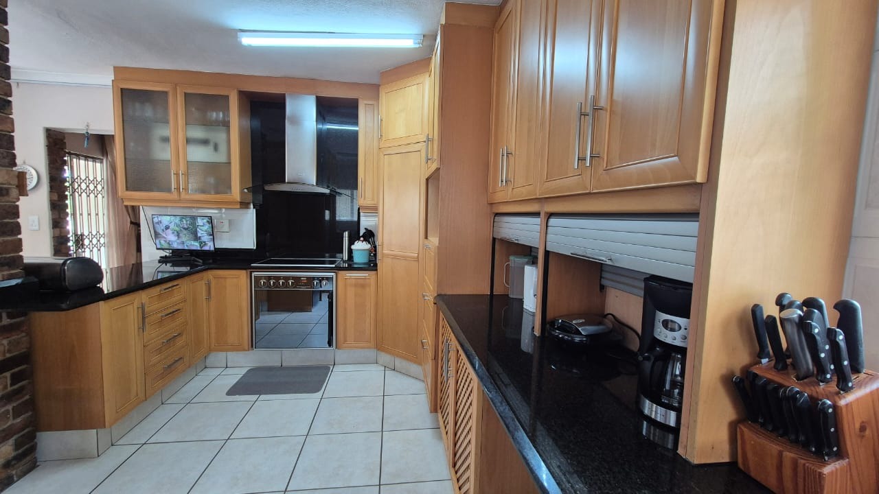 The interior boasts a thoughtfully designed layout, commencing with a well-appointed kitchen featuring extensive solid Beechwood cabinetry, sleek black granite countertops, and modern stainless steel cooking appliances. Ample storage is provided through various cabinet types, including integrated appliance garages. The expansive living areas, including a dedicated lounge and family TV room, are characterised by distinctive wooden ceilings, durable tiled flooring, and large windows and sliding doors that afford abundant natural light and panoramic views. A formal dining room further enhances the property's functional elegance. this conveniently leads out through a sliding door into the garden or braai area.