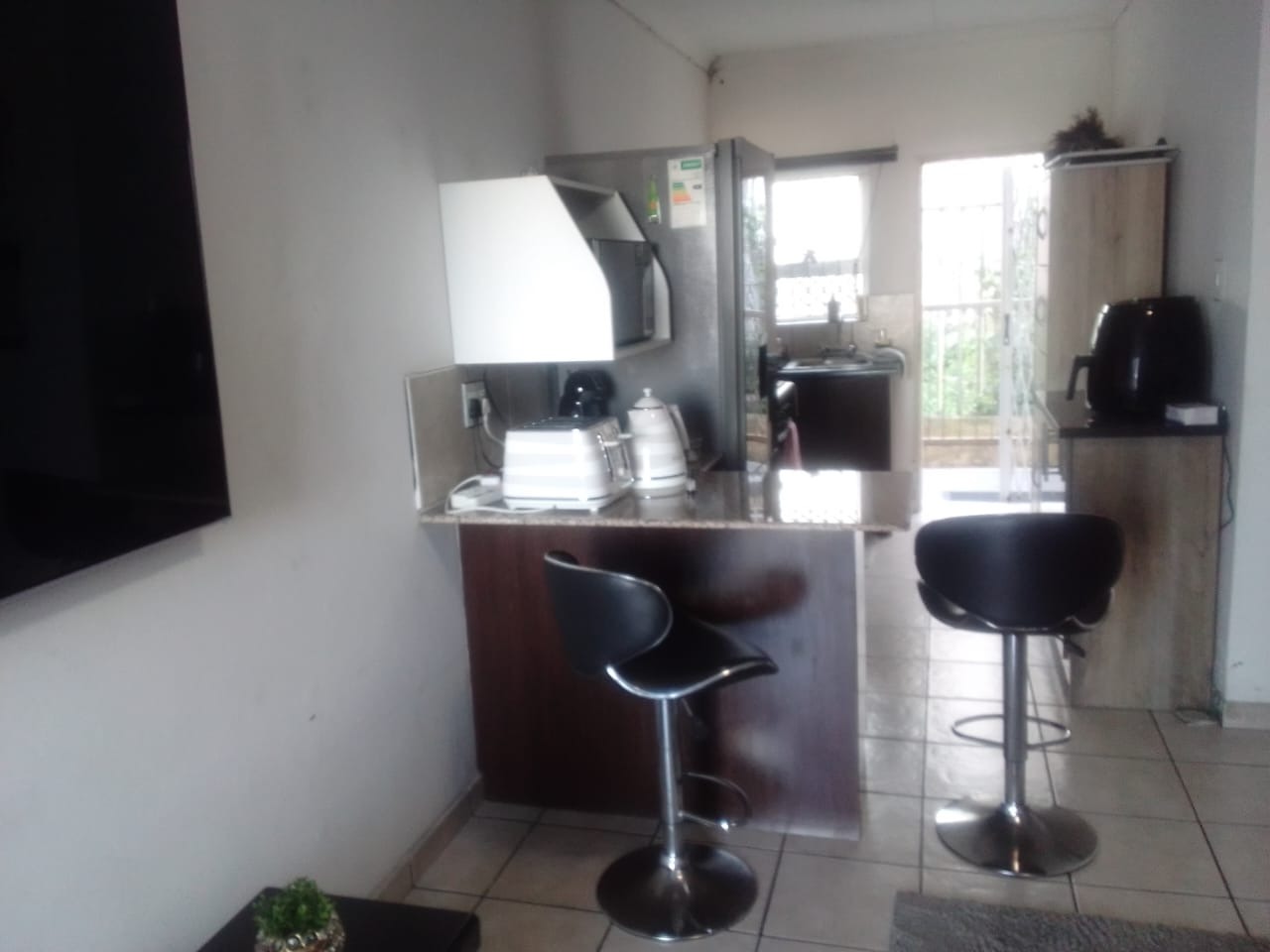 Inside, you'll find a neat open-plan living and kitchen area that feels really welcoming with a cosy living area. The kitchen is compact but super functional. You'll also appreciate the granite-look countertops and dark cabinetry, plus a handy breakfast bar for quick meals or entertaining. Tiled flooring throughout makes cleaning a breeze.