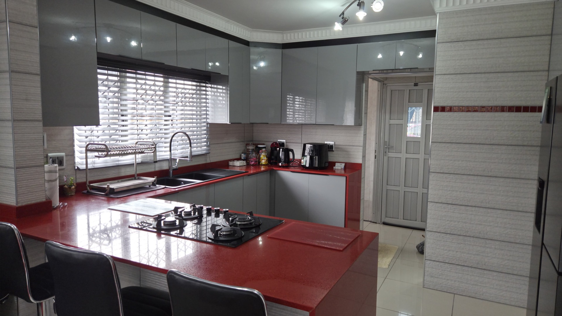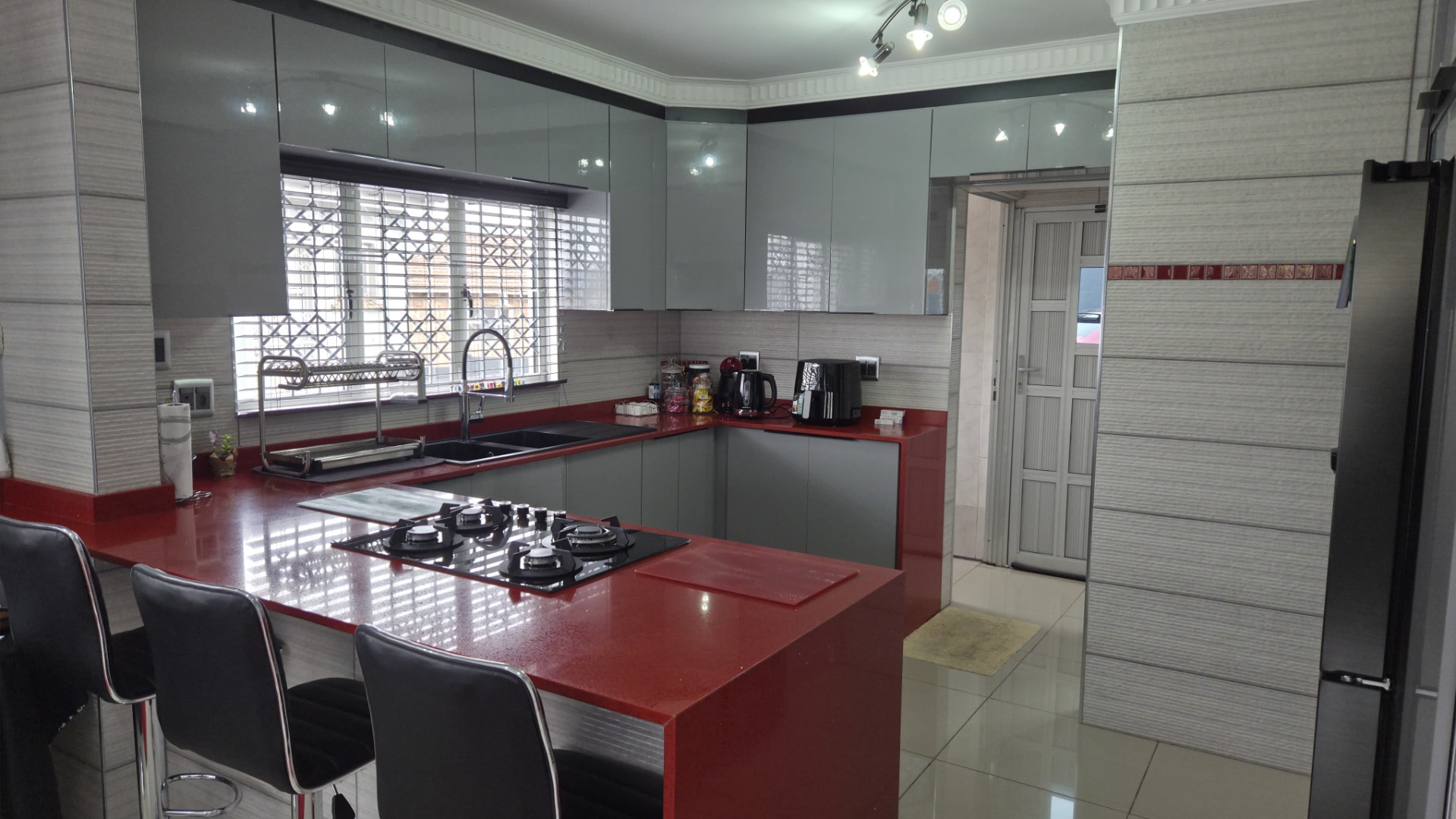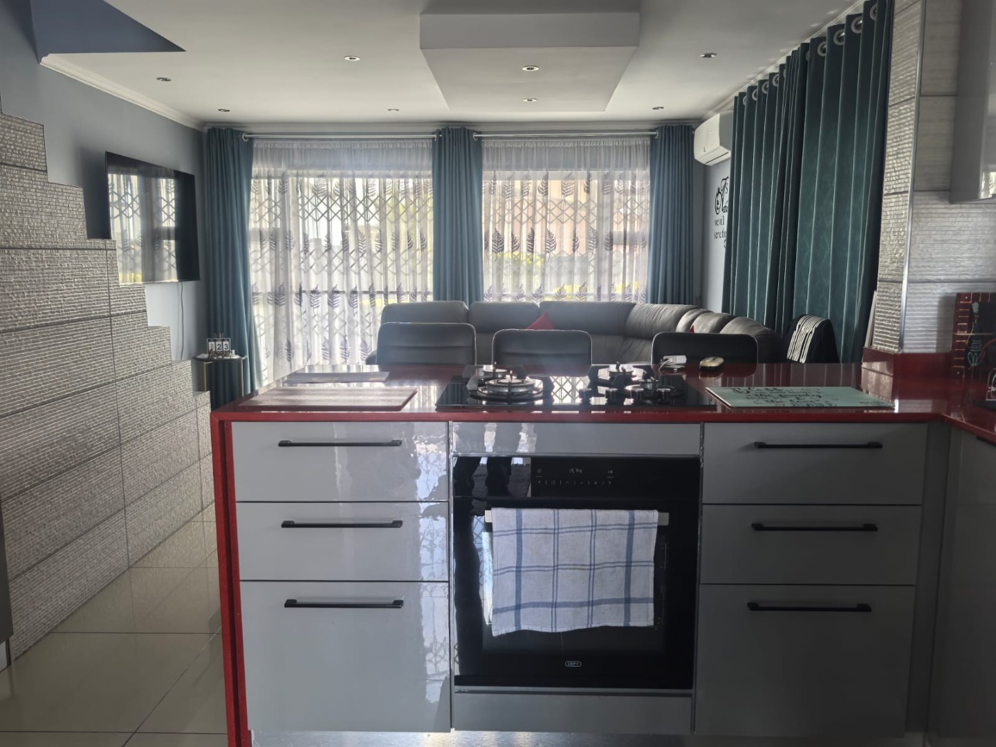 Step inside to a modern and spacious living area, featuring tiled flooring and abundant natural light from large windows. Recessed lighting and an air conditioning unit enhance comfort. The contemporary kitchen is a highlight, boasting sleek, glossy grey cabinetry and vibrant red countertops in a functional U-shaped layout. An island with an integrated gas hob and breakfast bar seating creates a central hub for cooking and entertaining. This open-plan design seamlessly connects the kitchen to the lounge, fostering a cohesive living experience.
