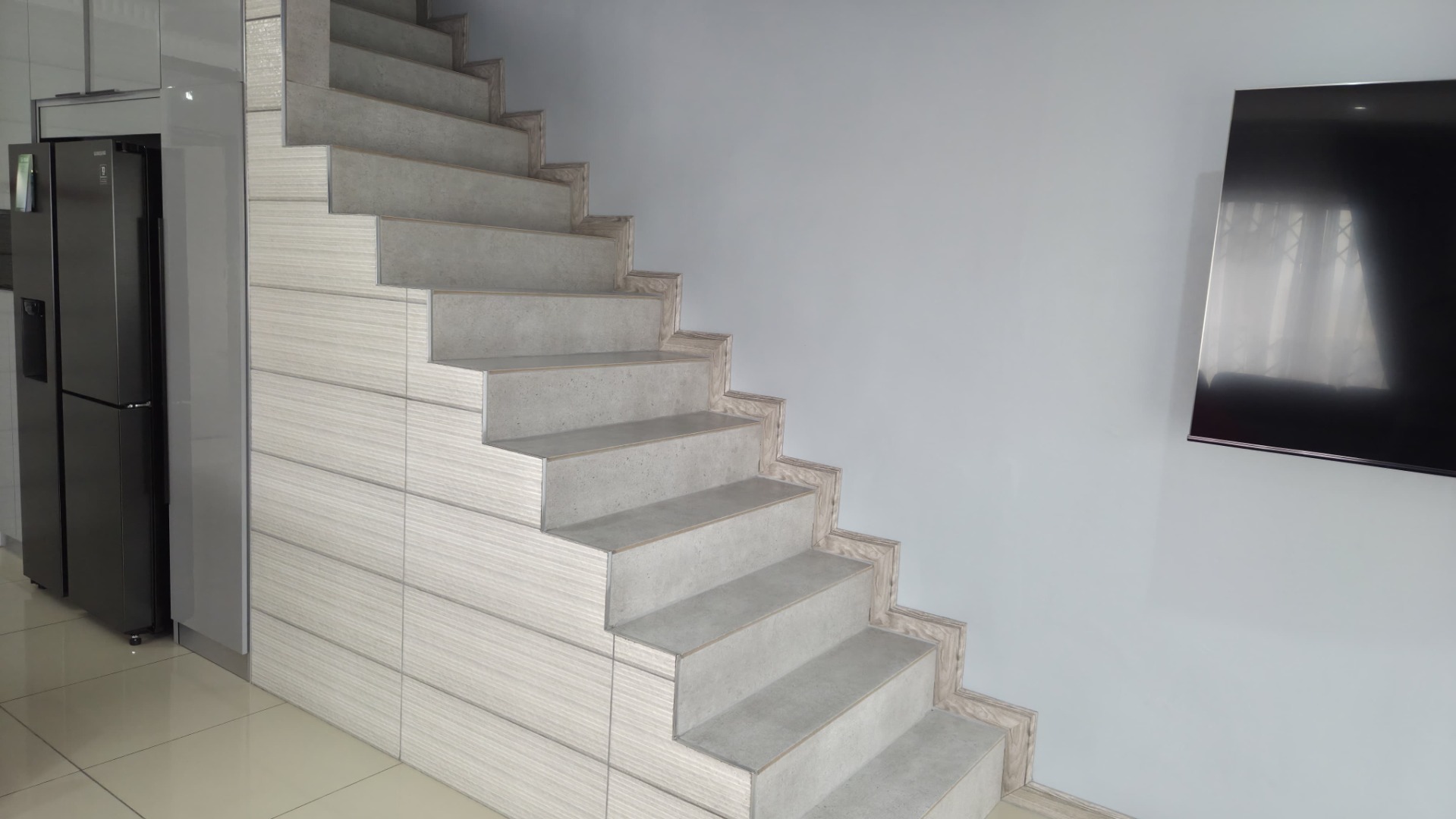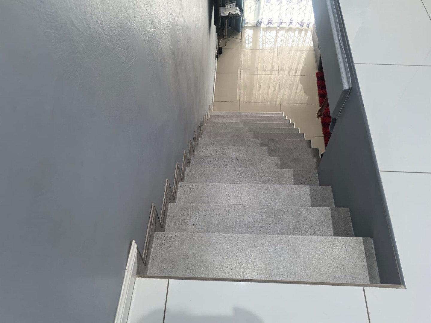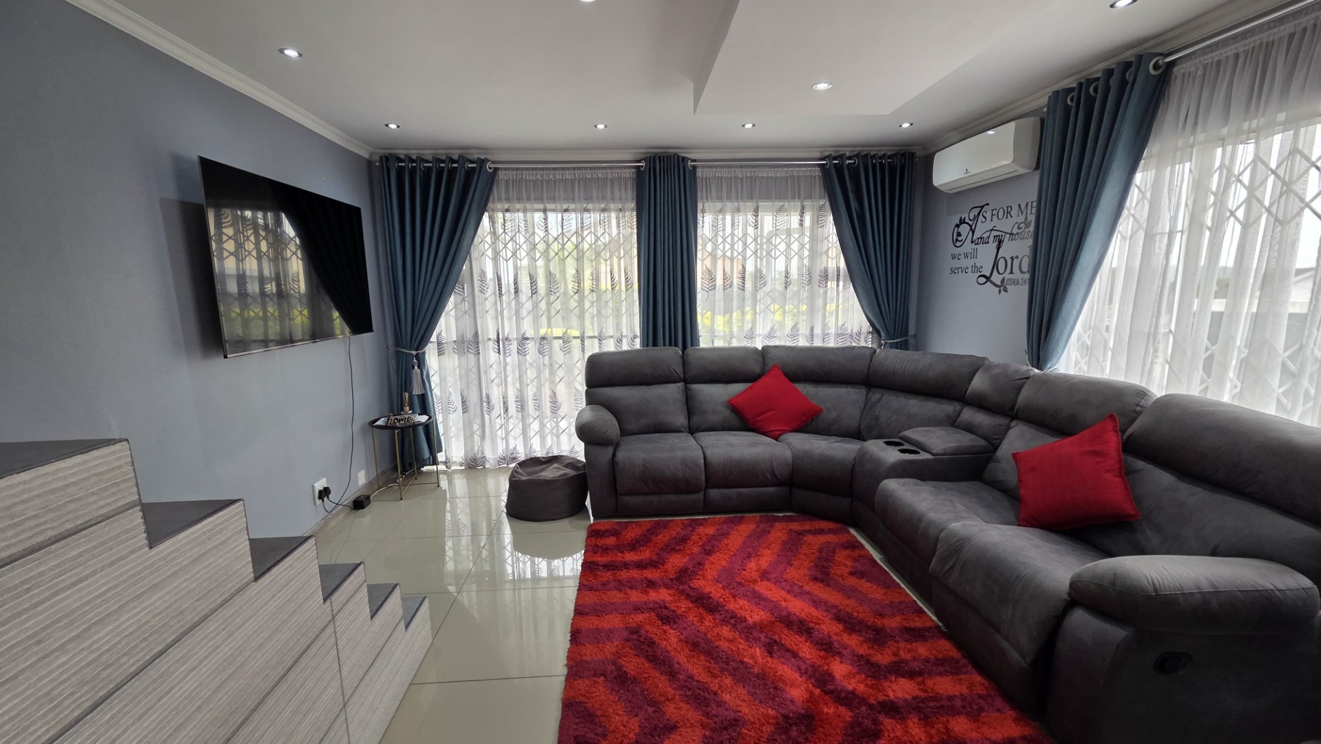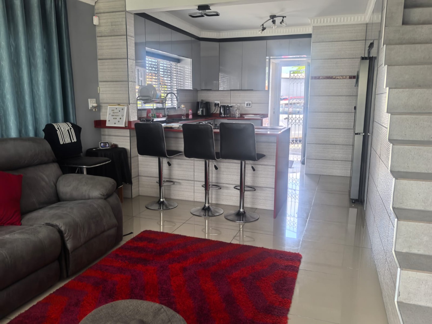 Step inside to a modern and spacious living area, featuring tiled flooring and abundant natural light from large windows. Recessed lighting and an air conditioning unit enhance comfort. The contemporary kitchen is a highlight, boasting sleek, glossy grey cabinetry and vibrant red countertops in a functional U-shaped layout. An island with an integrated gas hob and breakfast bar seating creates a central hub for cooking and entertaining. This open-plan design seamlessly connects the kitchen to the lounge, fostering a cohesive living experience.