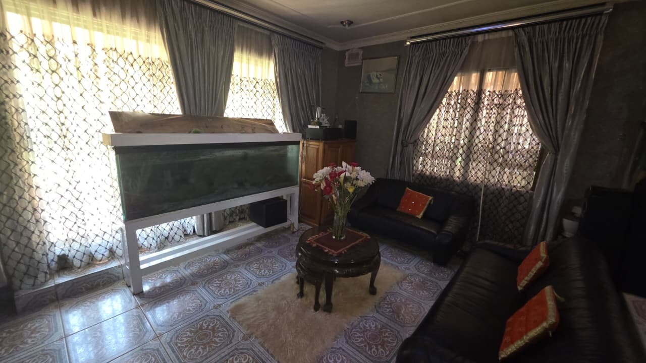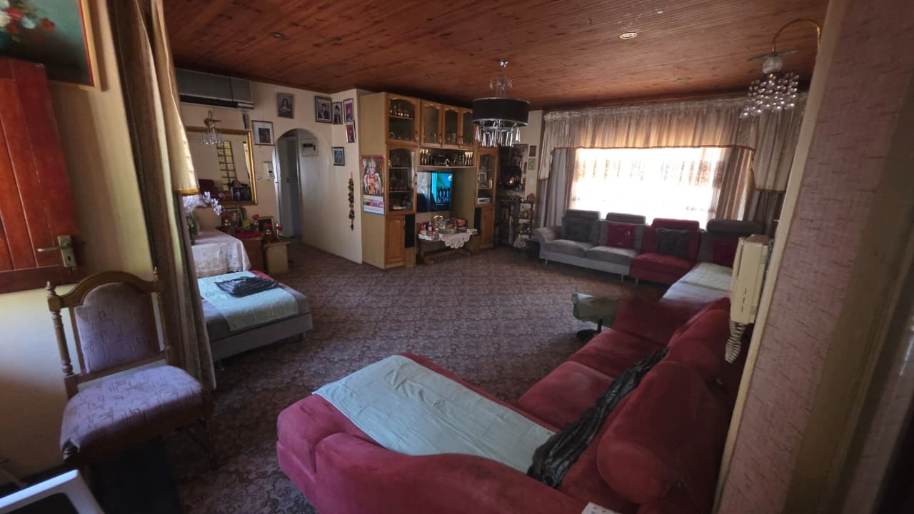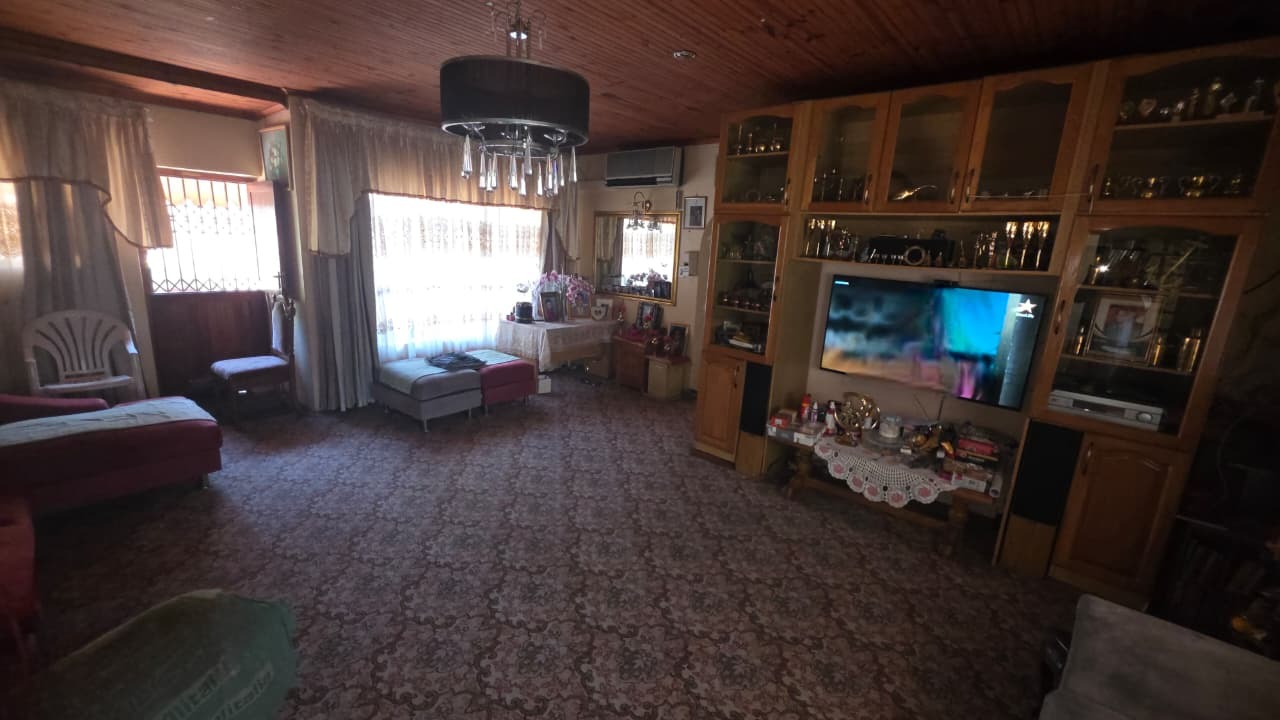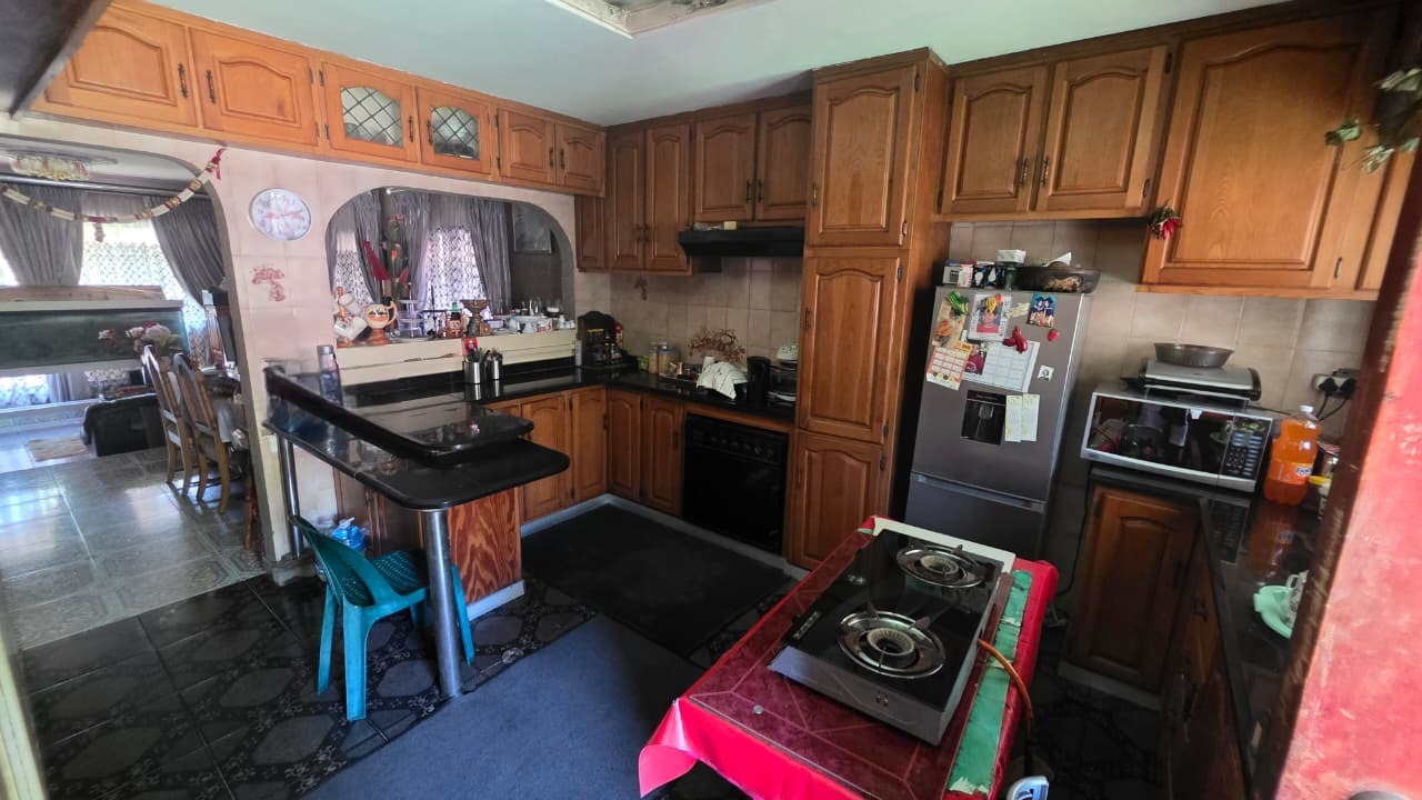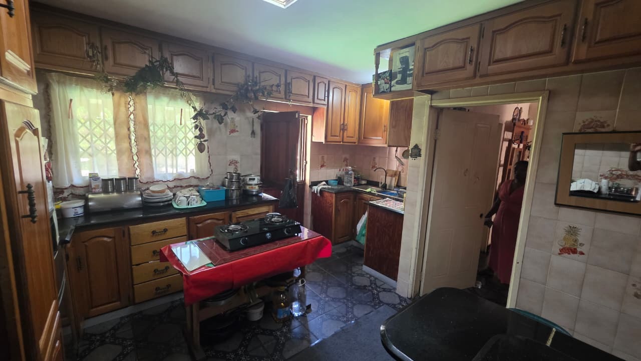 Inside, the home features two inviting lounges and a dedicated dining room, providing ample space for family gatherings and relaxation. Natural light fills the living areas, complemented by characterful wood-paneled ceilings and the comfort of air conditioning. The kitchen is equipped with extensive wooden cabinetry, offering plenty of storage for all your culinary needs.