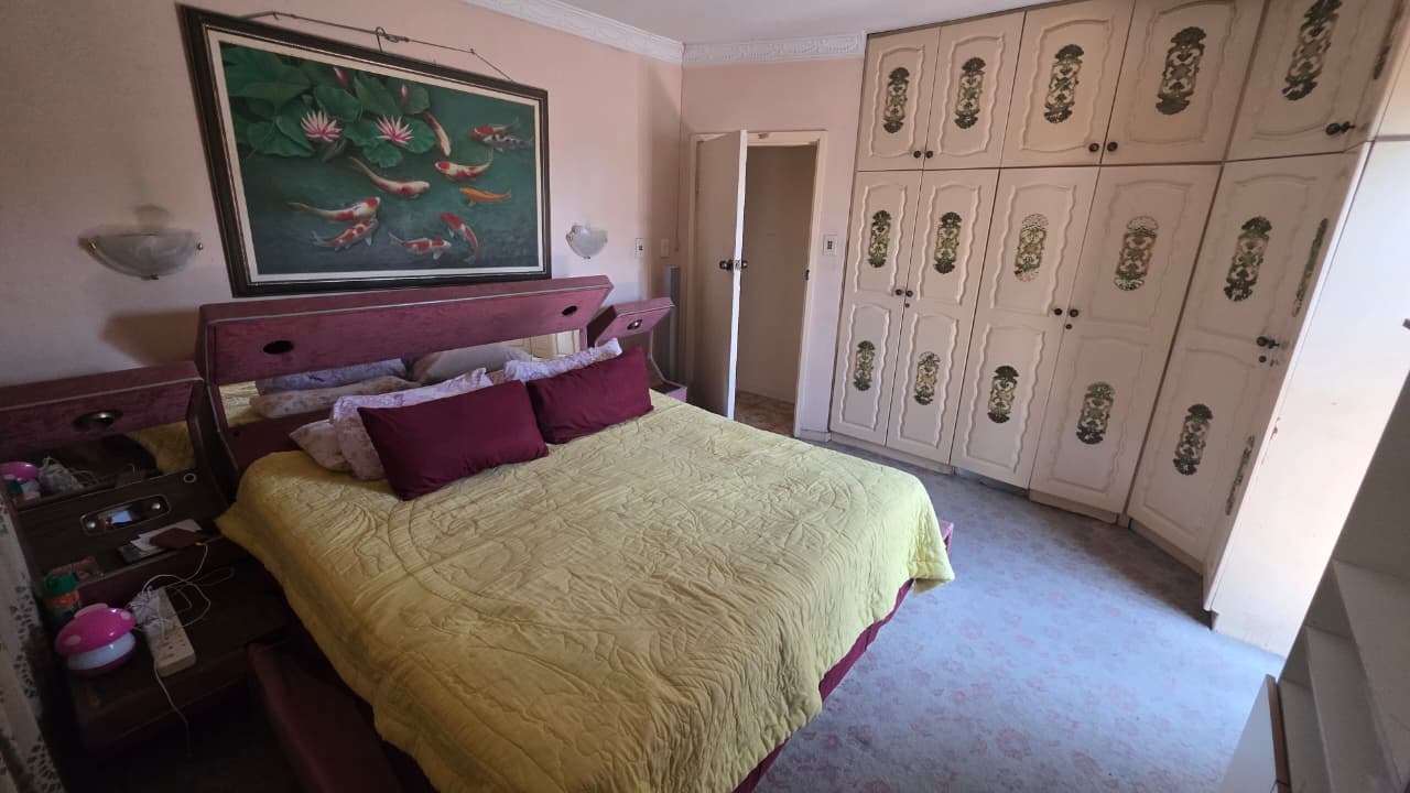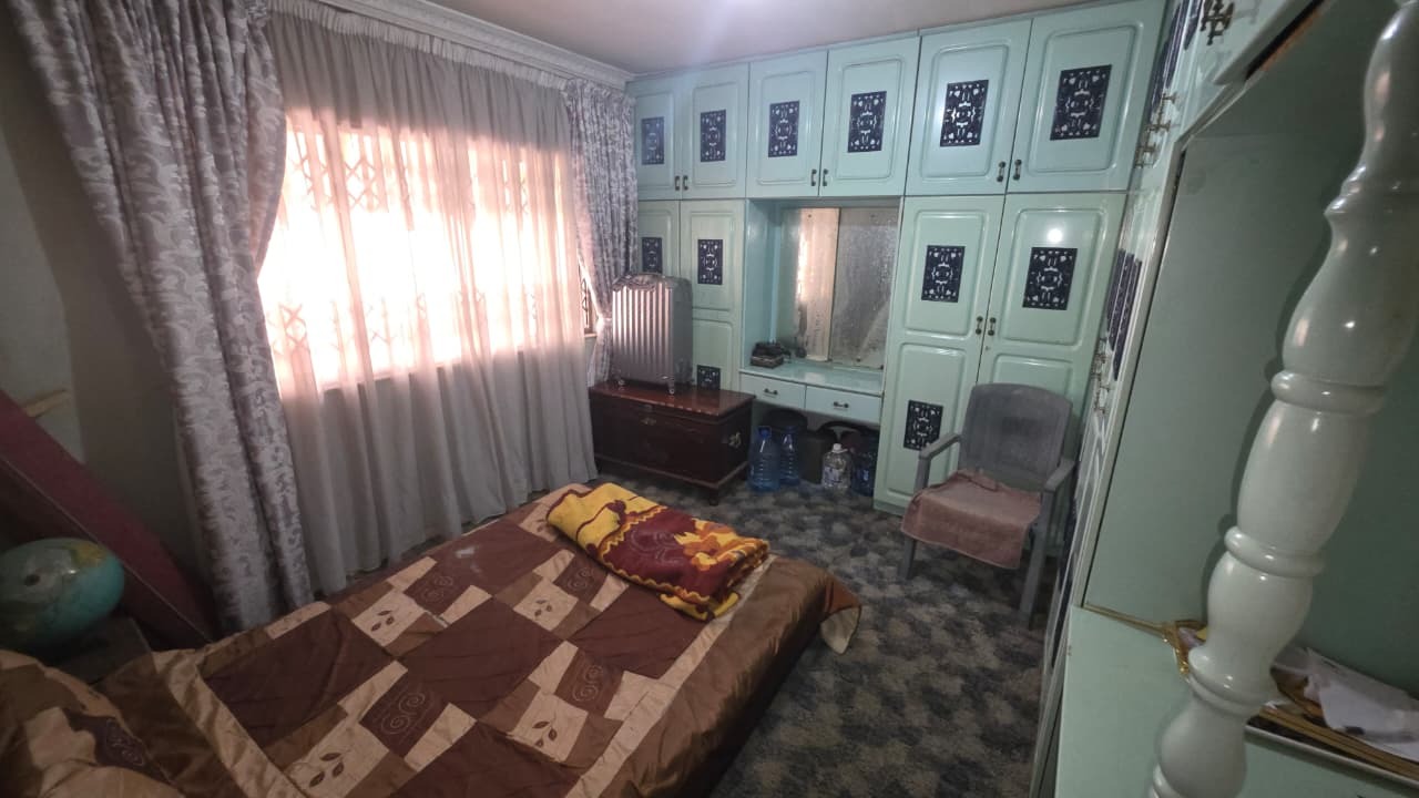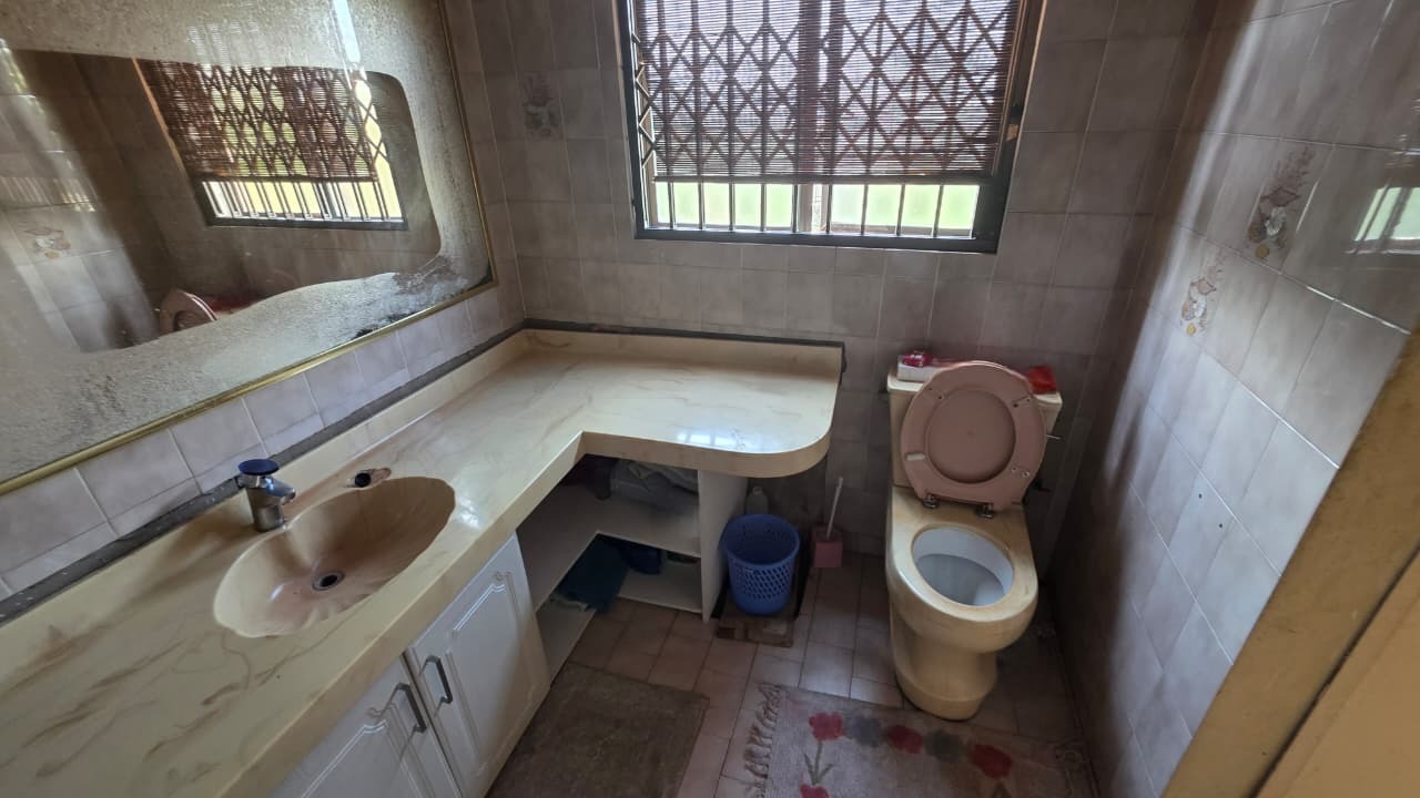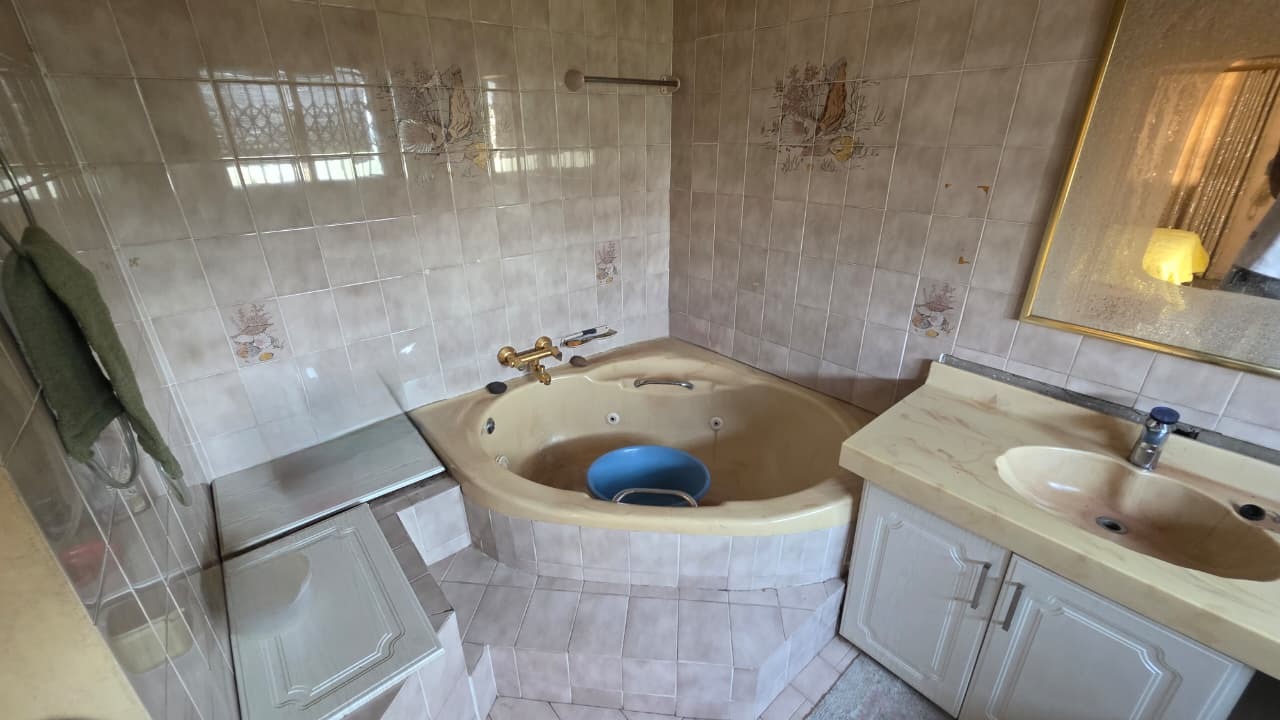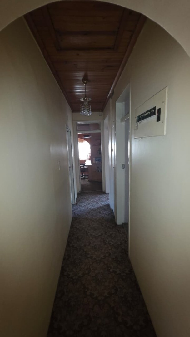 Inside, the home features two inviting lounges and a dedicated dining room, providing ample space for family gatherings and relaxation. Natural light fills the living areas, complemented by characterful wood-paneled ceilings and the comfort of air conditioning. The kitchen is equipped with extensive wooden cabinetry, offering plenty of storage for all your culinary needs.