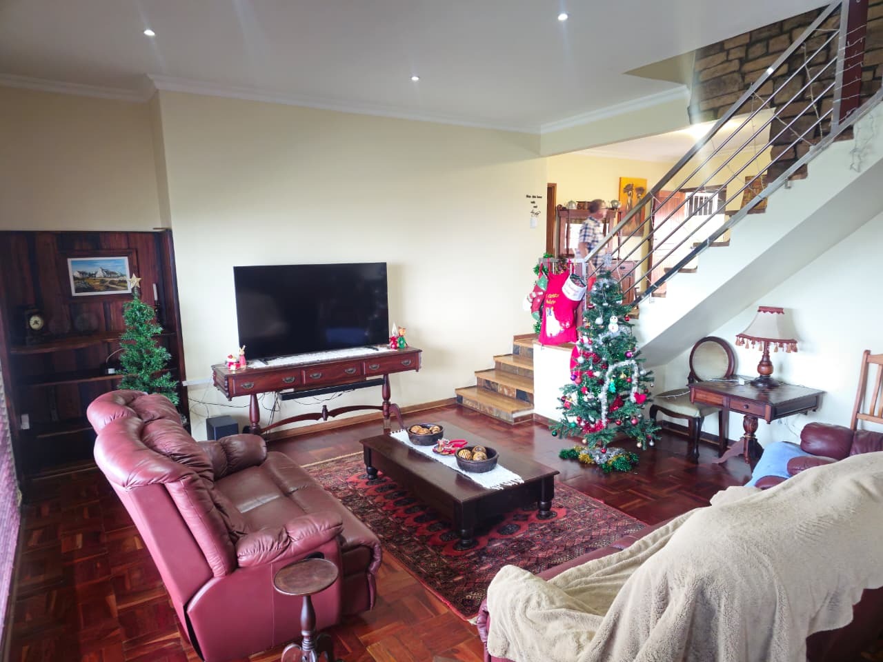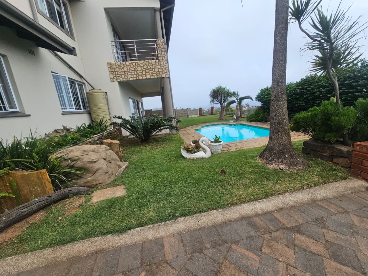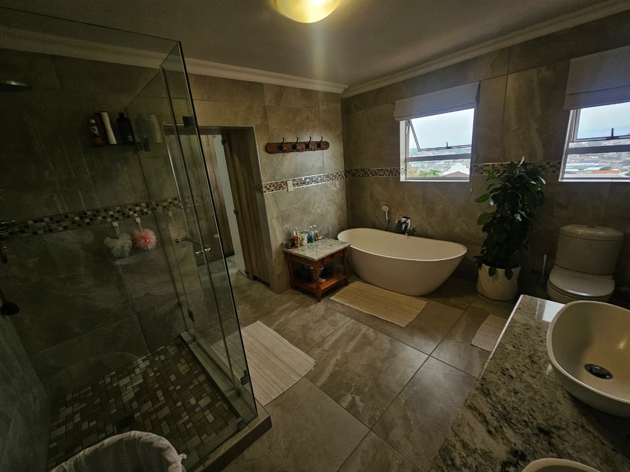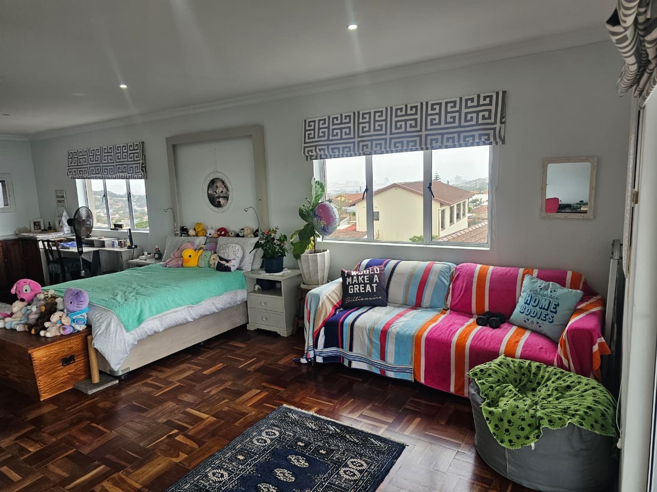 The ground floor features two relaxing lounges—one with a cosy built-in braai—opening onto a covered patio, manicured garden, and sparkling pool framed by lovely sea views. The dining area also opens outdoors, while the well-equipped kitchen with gas hob, oven, extractor, plenty of storage, and a scullery makes everyday living wonderfully convenient. Three bright bedrooms and a full family bathroom complete the downstairs.