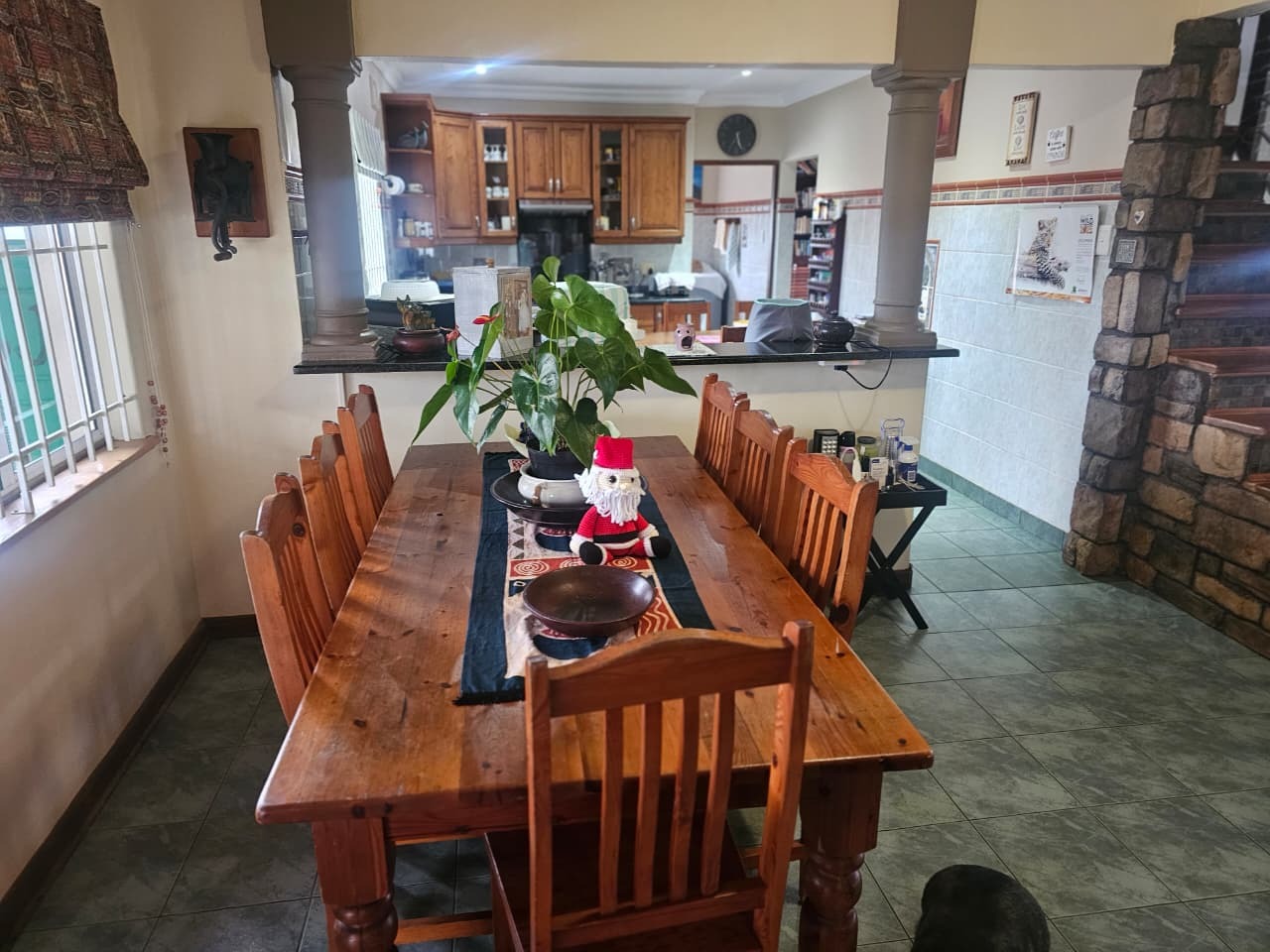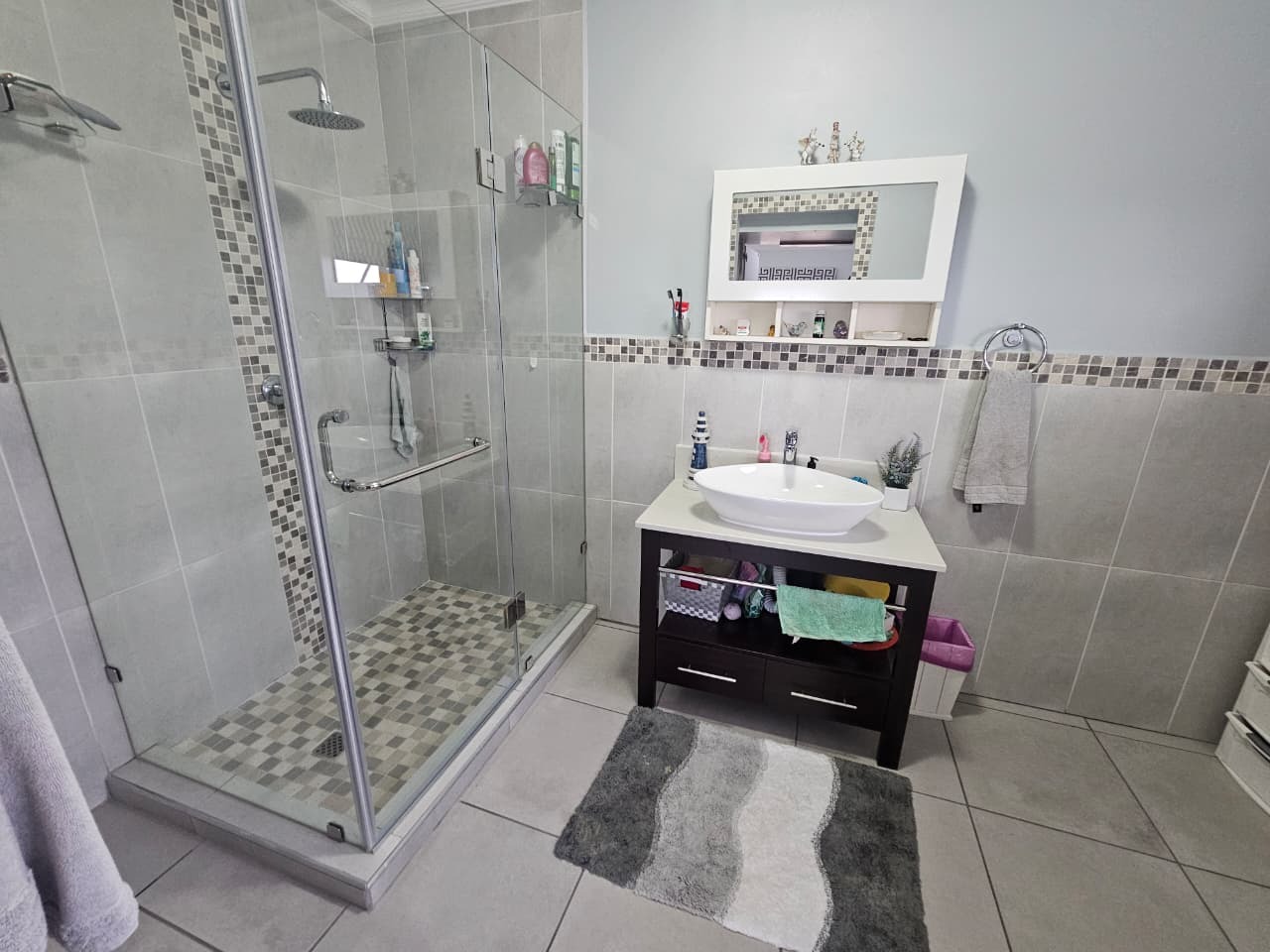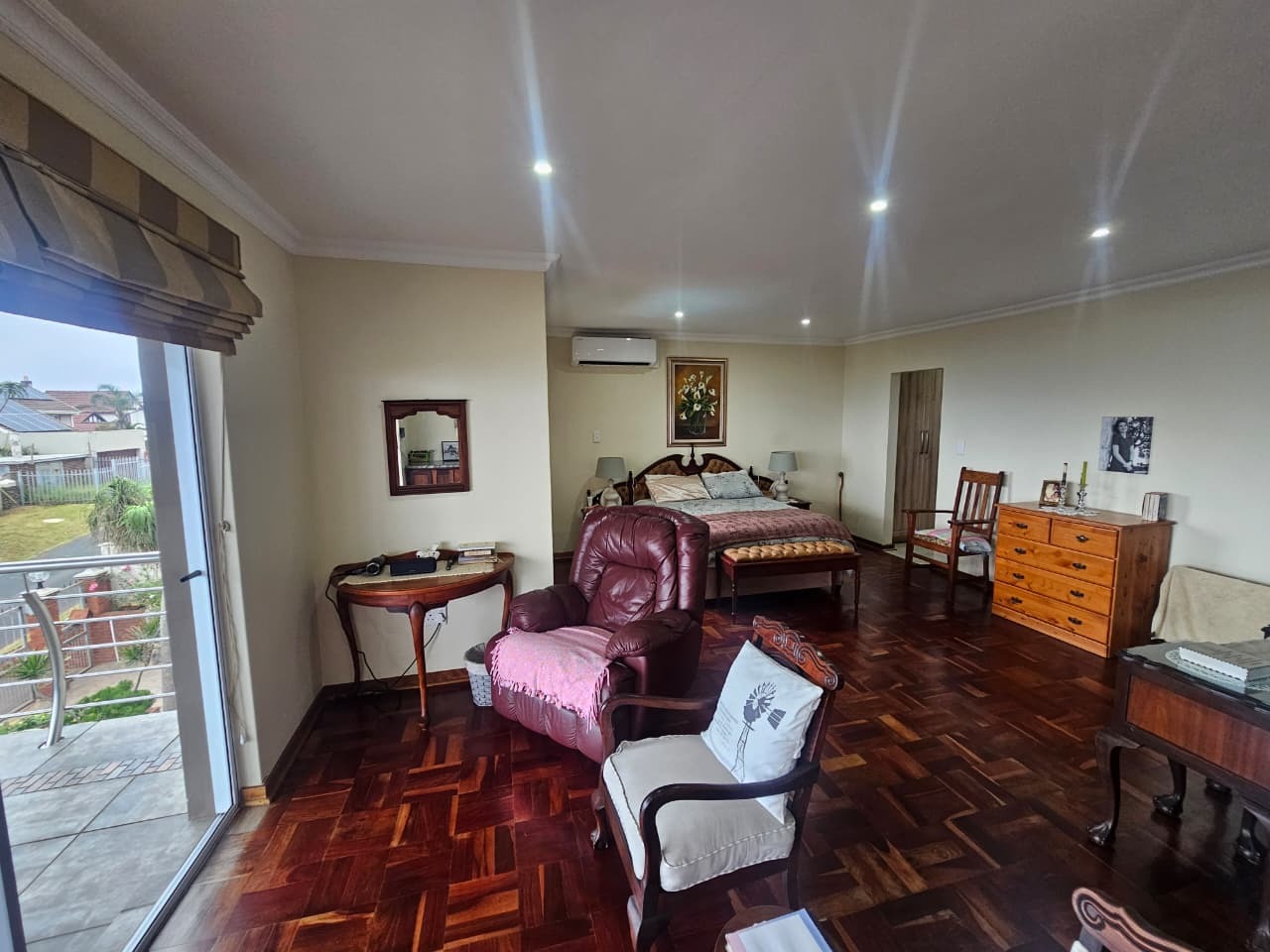 The ground floor features two relaxing lounges—one with a cosy built-in braai—opening onto a covered patio, manicured garden, and sparkling pool framed by lovely sea views. The dining area also opens outdoors, while the well-equipped kitchen with gas hob, oven, extractor, plenty of storage, and a scullery makes everyday living wonderfully convenient. Three bright bedrooms and a full family bathroom complete the downstairs.