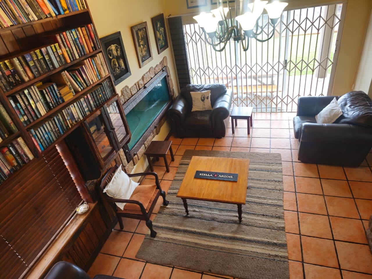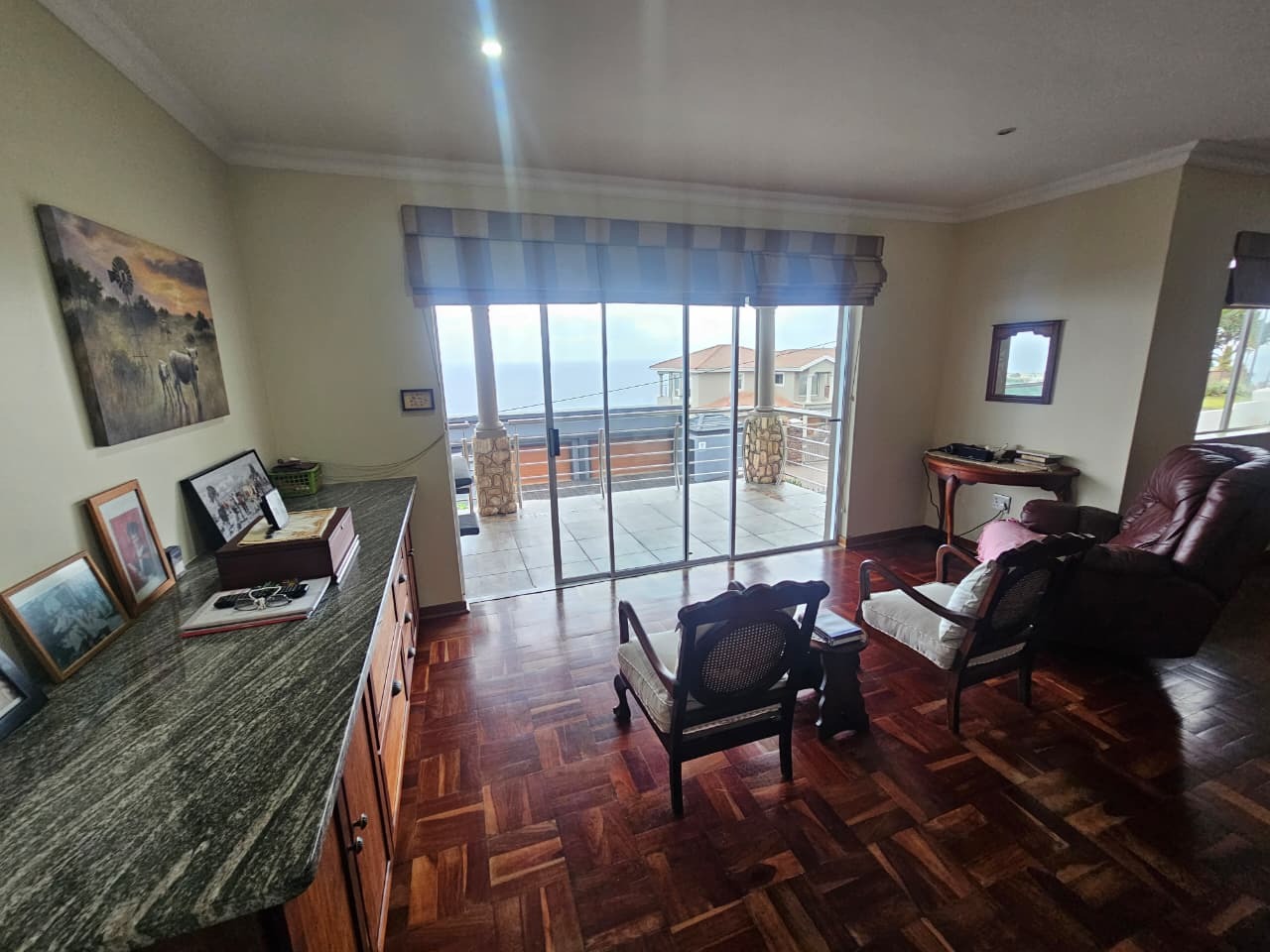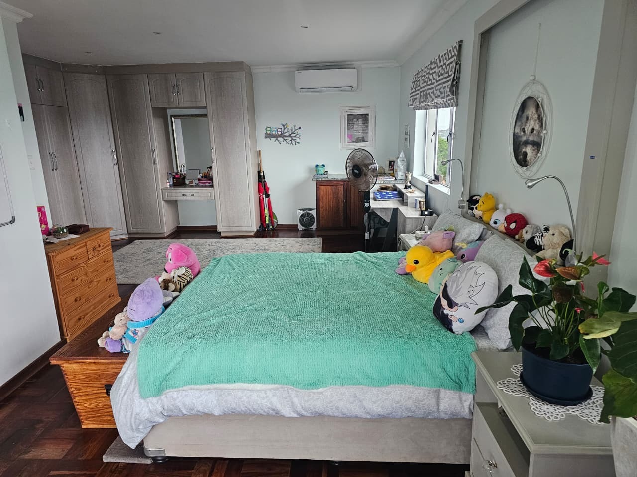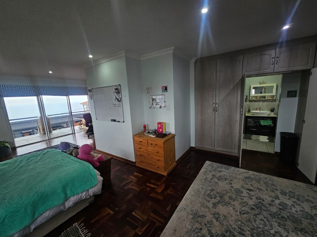 The ground floor features two relaxing lounges—one with a cosy built-in braai—opening onto a covered patio, manicured garden, and sparkling pool framed by lovely sea views. The dining area also opens outdoors, while the well-equipped kitchen with gas hob, oven, extractor, plenty of storage, and a scullery makes everyday living wonderfully convenient. Three bright bedrooms and a full family bathroom complete the downstairs.