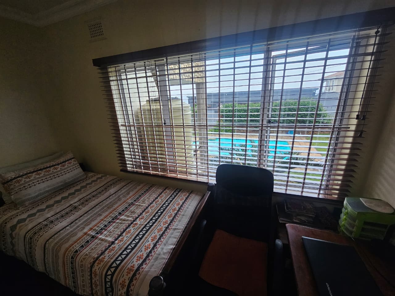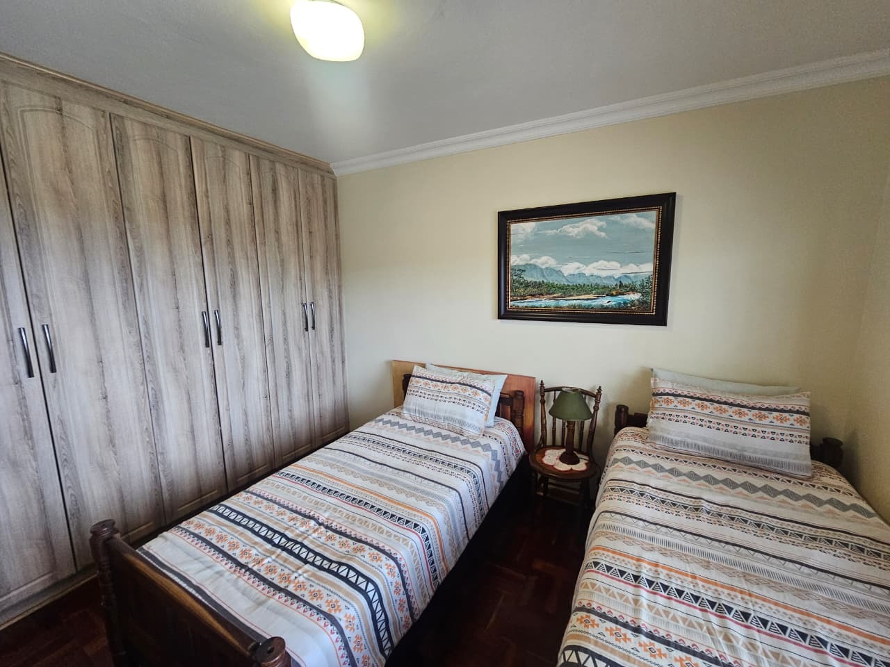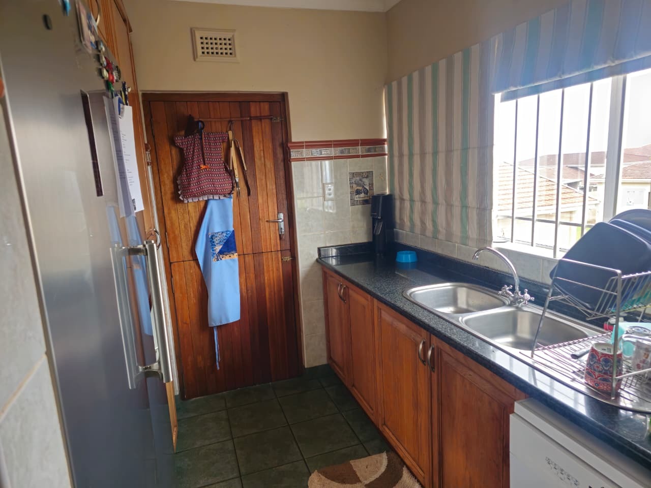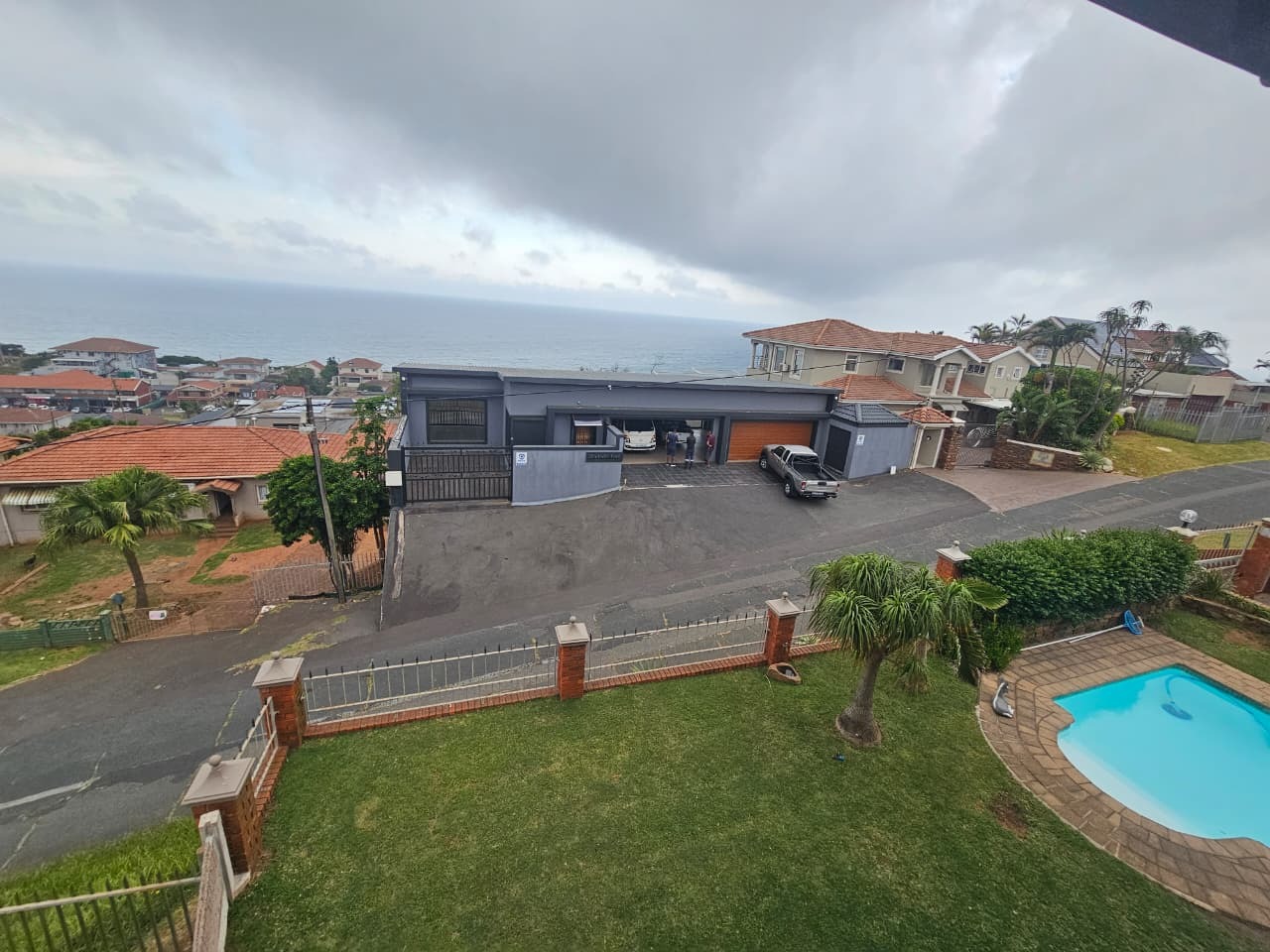 The ground floor features two relaxing lounges—one with a cosy built-in braai—opening onto a covered patio, manicured garden, and sparkling pool framed by lovely sea views. The dining area also opens outdoors, while the well-equipped kitchen with gas hob, oven, extractor, plenty of storage, and a scullery makes everyday living wonderfully convenient. Three bright bedrooms and a full family bathroom complete the downstairs.