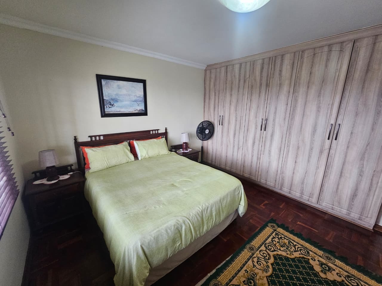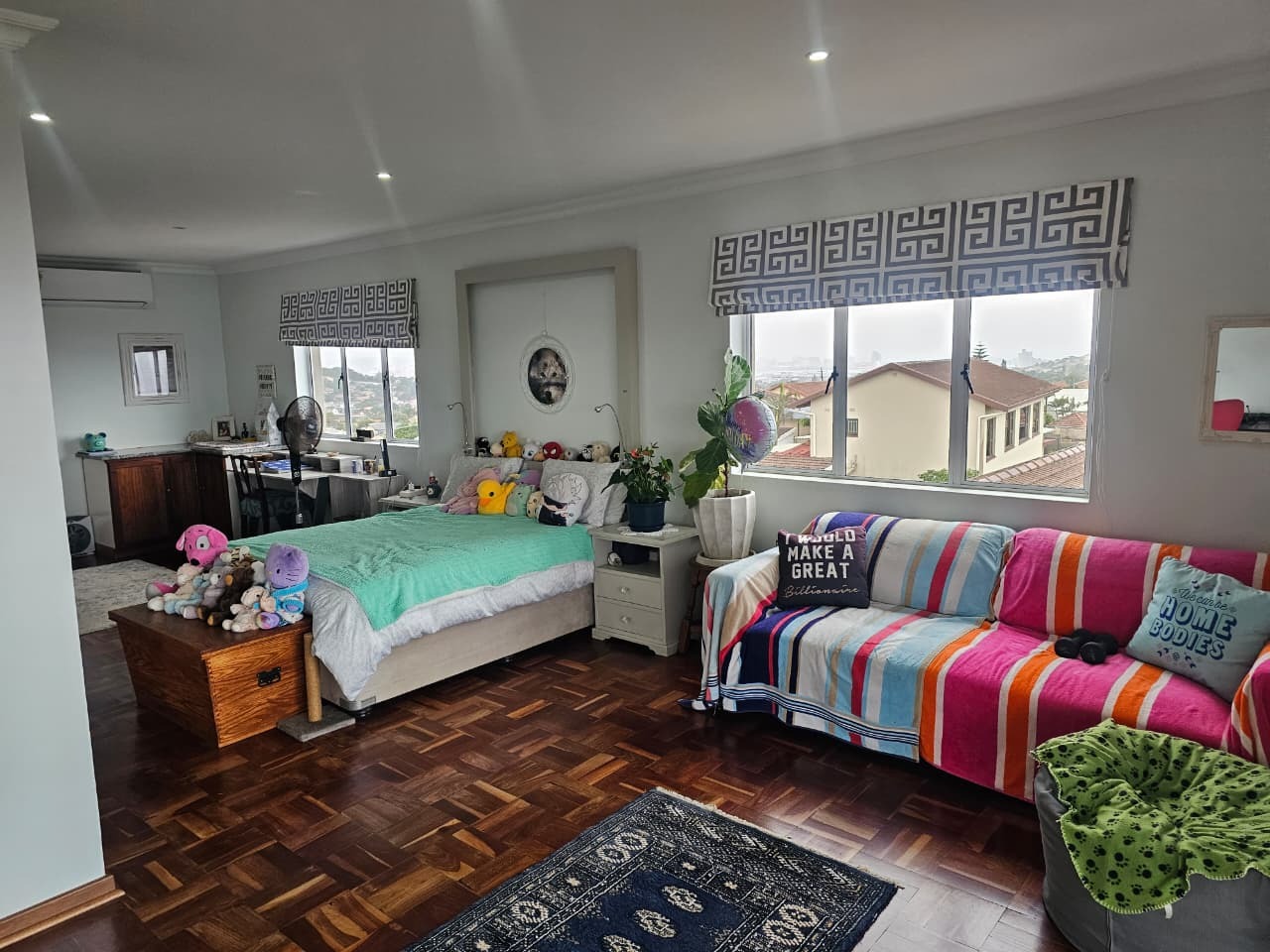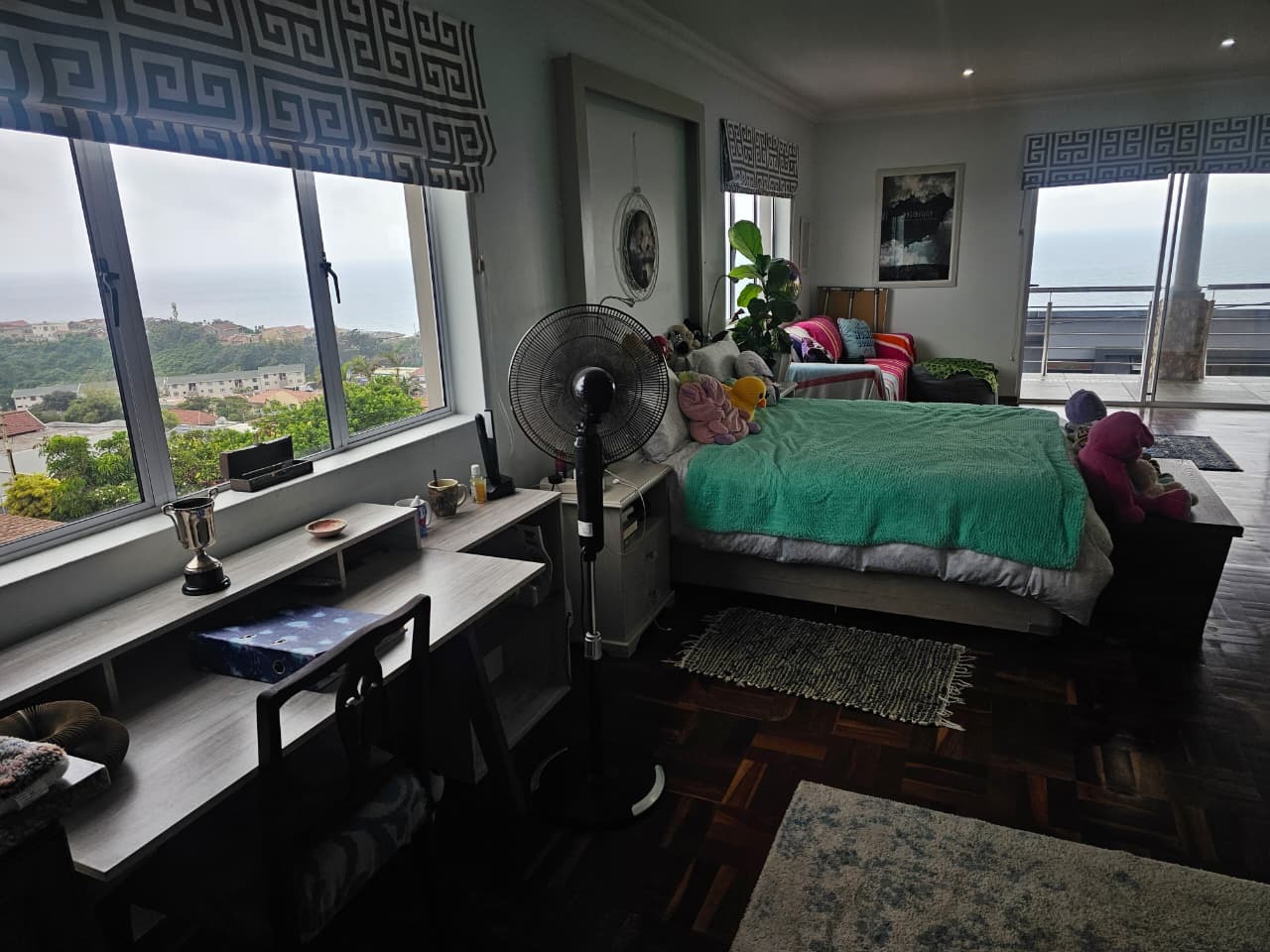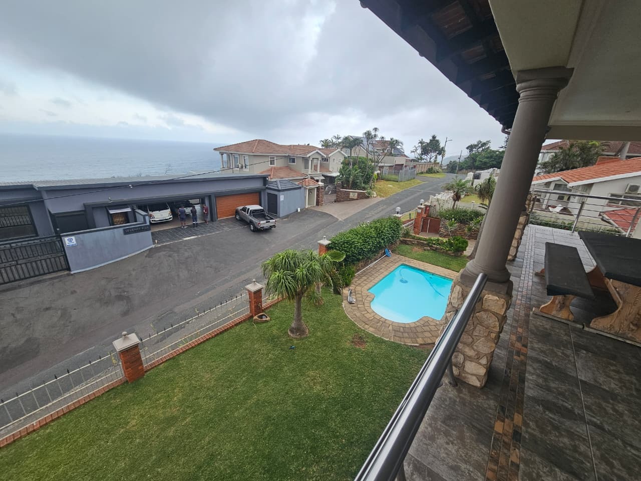 The ground floor features two relaxing lounges—one with a cosy built-in braai—opening onto a covered patio, manicured garden, and sparkling pool framed by lovely sea views. The dining area also opens outdoors, while the well-equipped kitchen with gas hob, oven, extractor, plenty of storage, and a scullery makes everyday living wonderfully convenient. Three bright bedrooms and a full family bathroom complete the downstairs.