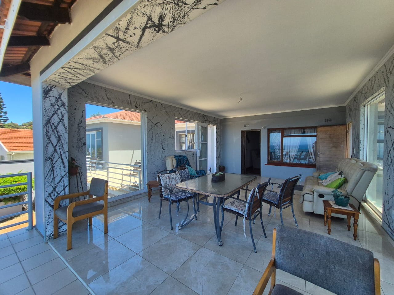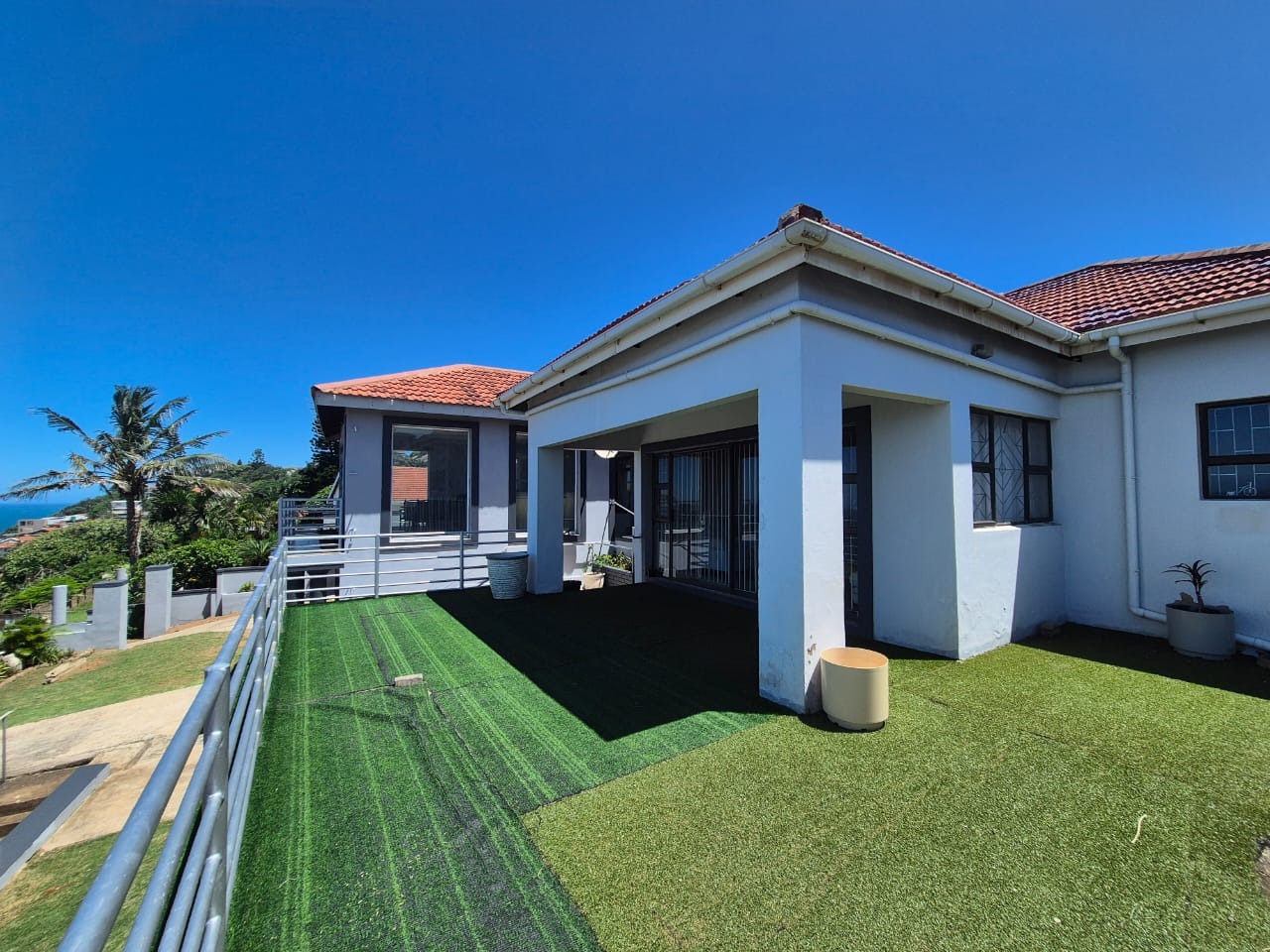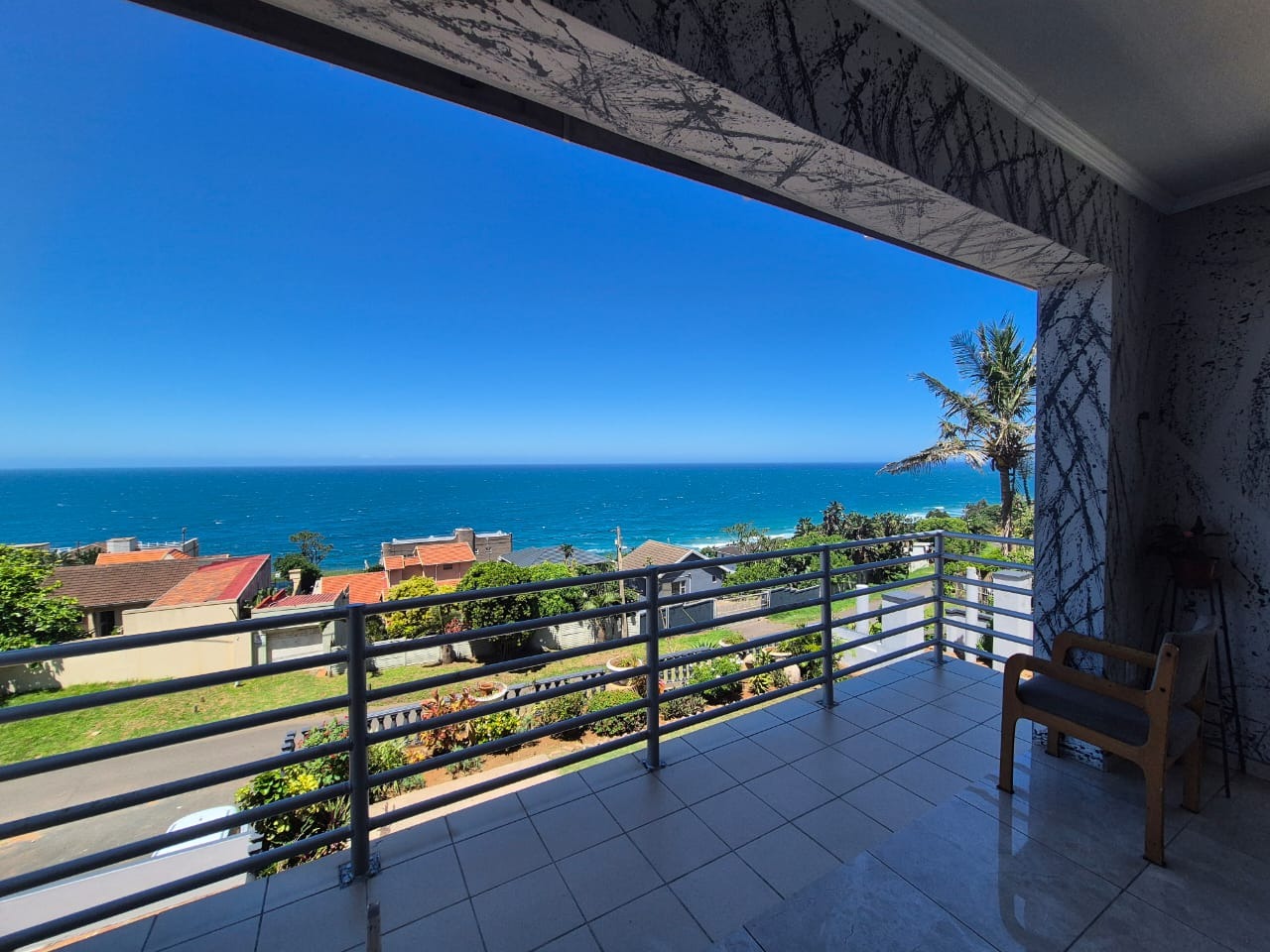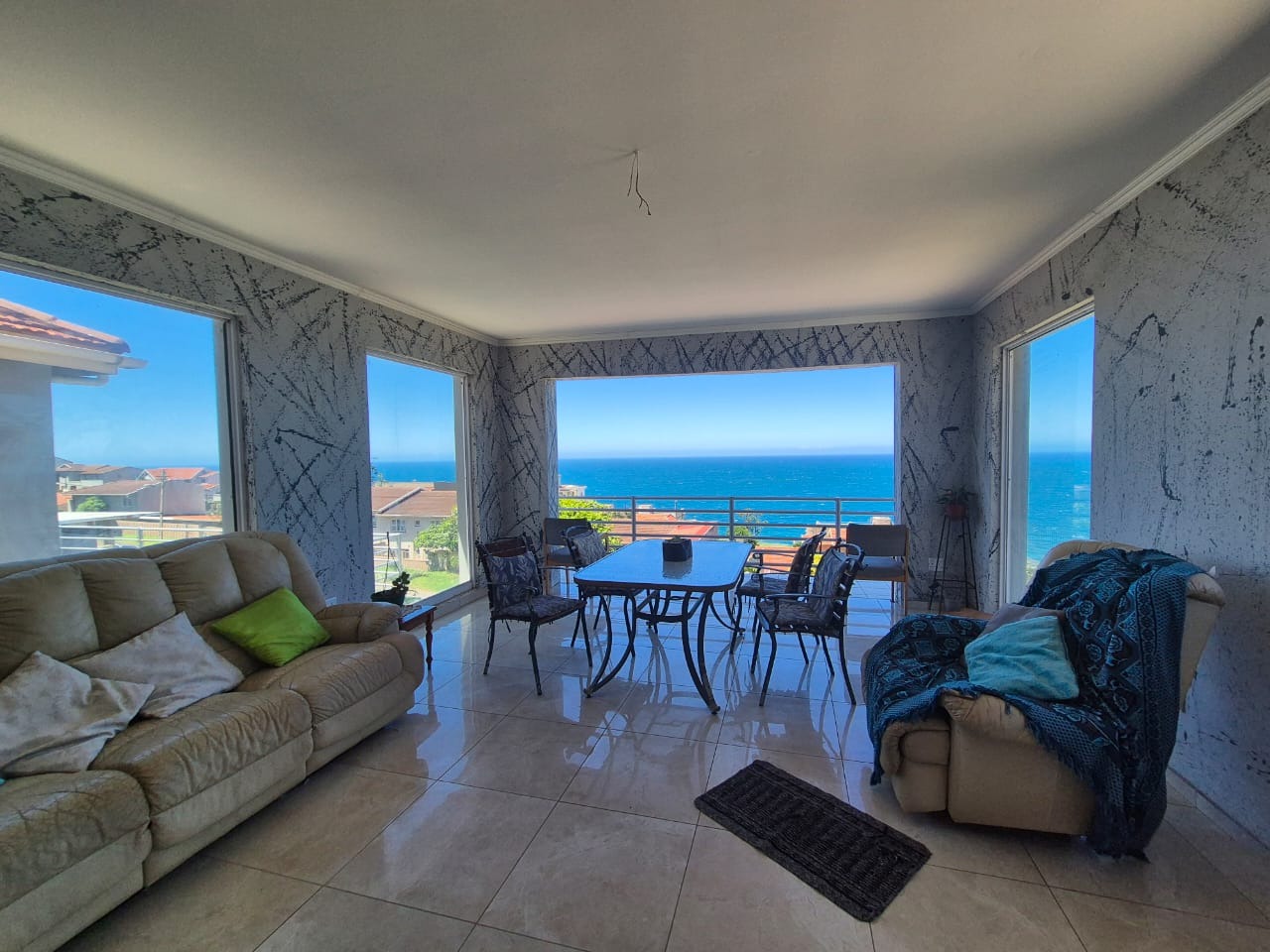 Bluff, a sought-after coastal suburb in Durban, South Africa, offers a desirable lifestyle with convenient access to amenities and the ocean. This property boasts a modern exterior with a fresh grey paint scheme and white trim. A bright tiled outdoor terrace, complete with a sturdy metal railing, provides an inviting space to enjoy clear skies and tropical landscaping. Step inside to discover a spacious lounge, bathed in natural light and offering breathtaking panoramic ocean views through expansive openings and large sliding glass doors. Tiled flooring flows throughout, leading to an open-plan dining area. The functional kitchen features ample wooden cabinetry, durable granite countertops, a built-in hob and oven, plus a modern stainless steel extractor fan, connecting seamlessly to adjacent living spaces. The residence comprises four comfortable bedrooms and two well-appointed bathrooms. Several bedrooms offer direct outdoor access via large glass sliding doors. Some feature open-plan en-suite bathrooms, complete with a corner bathtub or a luxurious jacuzzi tub and separate shower, providing private retreats. The expansive outdoor patio is ideal for entertaining or unwinding while soaking in stunning ocean vistas. With an impressive six garages, this property provides abundant secure parking and extensive storage on its generous 1141 sqm erf. Pets are allowed, and the property is fenced. Key Features: * 4 Bedrooms, 2 Bathrooms * Panoramic Ocean Views * Spacious Lounge and Dining Areas * Functional Kitchen with Granite Countertops * Expansive Outdoor Patio * Six Garages * Generous 1141 sqm Erf * Pet-Friendly and Fenced Property