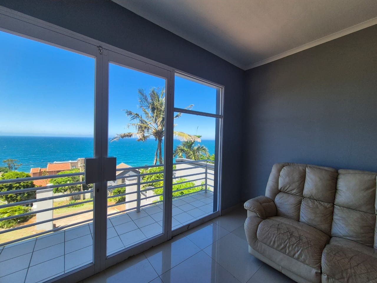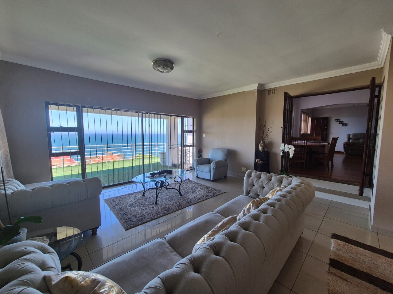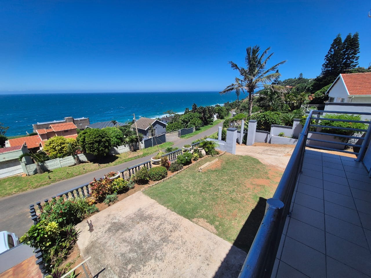 Bluff, a sought-after coastal suburb in Durban, South Africa, offers a desirable lifestyle with convenient access to amenities and the ocean. This property boasts a modern exterior with a fresh grey paint scheme and white trim. A bright tiled outdoor terrace, complete with a sturdy metal railing, provides an inviting space to enjoy clear skies and tropical landscaping. Step inside to discover a spacious lounge, bathed in natural light and offering breathtaking panoramic ocean views through expansive openings and large sliding glass doors. Tiled flooring flows throughout, leading to an open-plan dining area. The functional kitchen features ample wooden cabinetry, durable granite countertops, a built-in hob and oven, plus a modern stainless steel extractor fan, connecting seamlessly to adjacent living spaces. The residence comprises four comfortable bedrooms and two well-appointed bathrooms. Several bedrooms offer direct outdoor access via large glass sliding doors. Some feature open-plan en-suite bathrooms, complete with a corner bathtub or a luxurious jacuzzi tub and separate shower, providing private retreats. The expansive outdoor patio is ideal for entertaining or unwinding while soaking in stunning ocean vistas. With an impressive six garages, this property provides abundant secure parking and extensive storage on its generous 1141 sqm erf. Pets are allowed, and the property is fenced. Key Features: * 4 Bedrooms, 2 Bathrooms * Panoramic Ocean Views * Spacious Lounge and Dining Areas * Functional Kitchen with Granite Countertops * Expansive Outdoor Patio * Six Garages * Generous 1141 sqm Erf * Pet-Friendly and Fenced Property