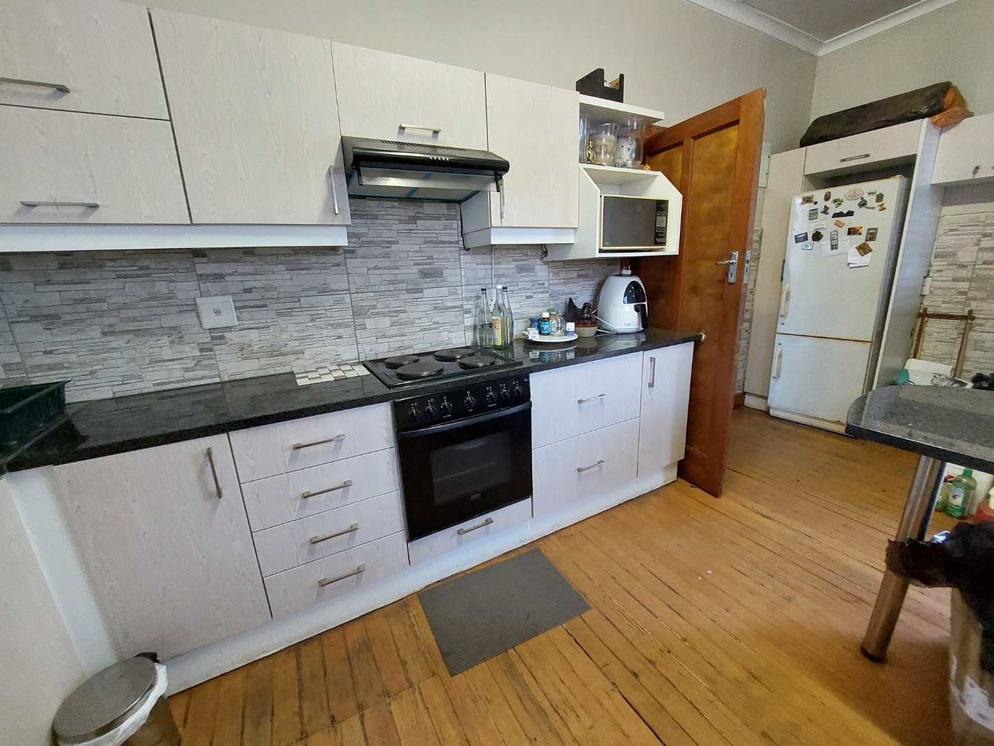 - Modern kitchen with sleek cupboards, ample counter space, hob, under-counter oven, and double sink — with room for a double fridge or pantry.