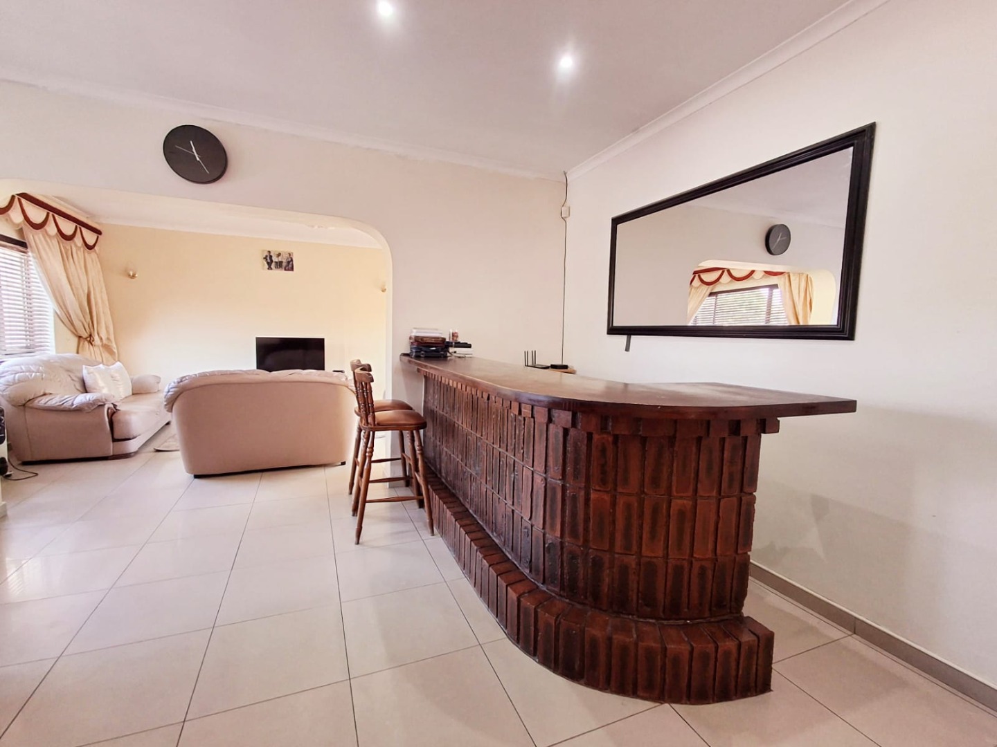 Enter through the front door into a mini entrance hall that opens up seamlessly into the bar area, a lounge and dining room. The lounge has sliding doors that open up into the back courtyard.