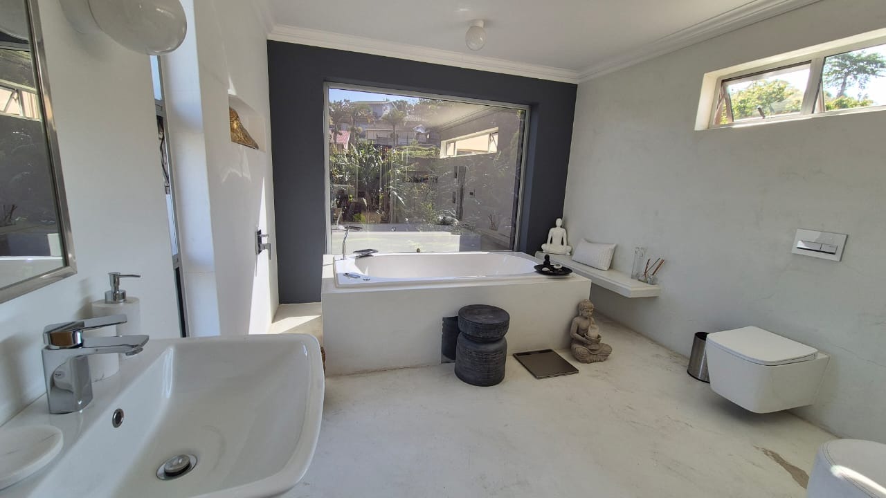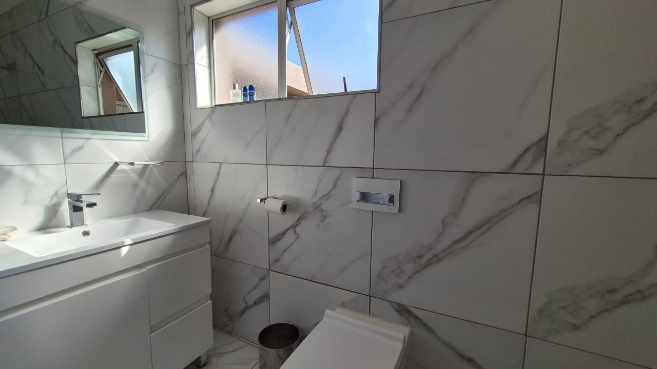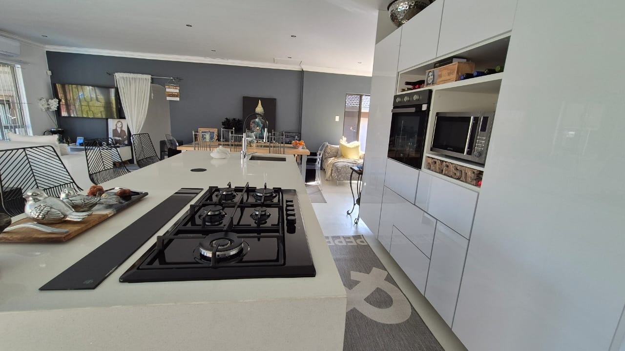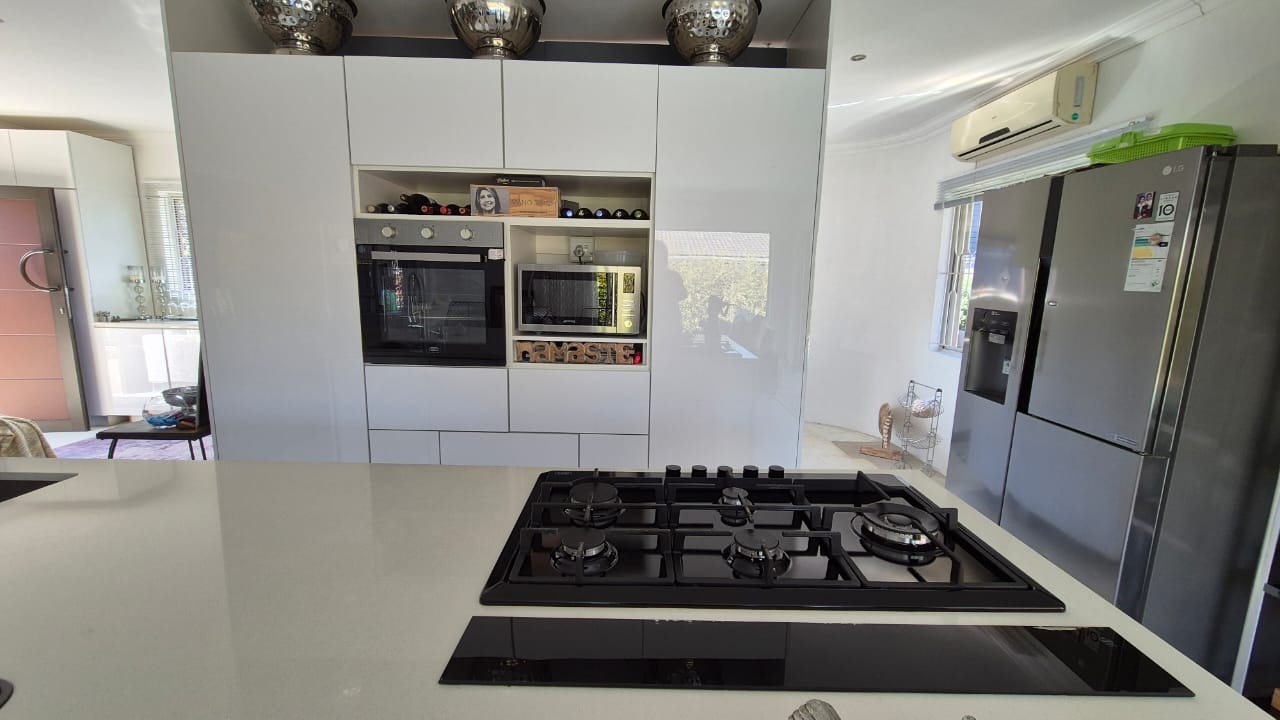 The kitchen is a showstopper in crisp white with white quartz tops and a sleek, modern layout. A chef’s dream with ample cupboards, a gas hob set into a generous worktop with prep bowl, eye-level oven. Plumbing for a dishwasher is already in place, making both everyday living and entertaining a pleasure.