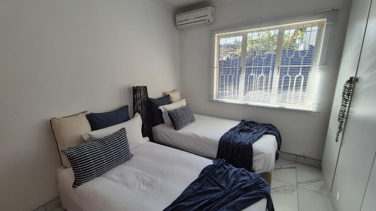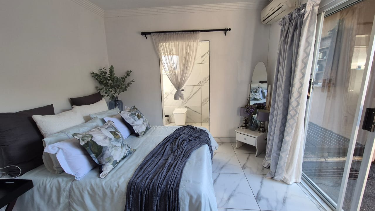 The kitchen is a showstopper in crisp white with white quartz tops and a sleek, modern layout. A chef’s dream with ample cupboards, a gas hob set into a generous worktop with prep bowl, eye-level oven. Plumbing for a dishwasher is already in place, making both everyday living and entertaining a pleasure.