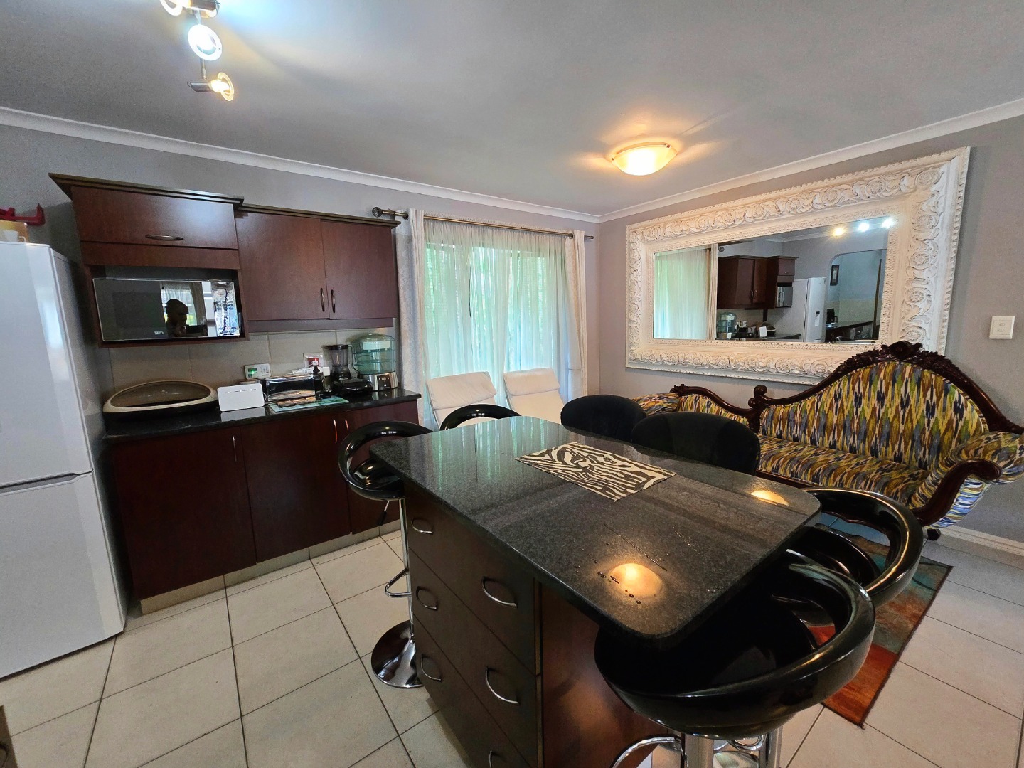 Step inside and you’ll find a welcoming open-plan living space that effortlessly connects the lounge, dining, and kitchen areas. It’s super bright thanks to large windows, and the tiled flooring throughout makes cleaning a breeze. The kitchen is a real highlight, boasting stylish dark wood cabinets, sleek granite countertops, and a handy island with bar seating – ideal for casual meals or entertaining friends. Plus, it comes with an integrated gas hob and oven, making cooking a joy. This open layout also gives you direct access to an outdoor patio, perfect for enjoying the fresh air.