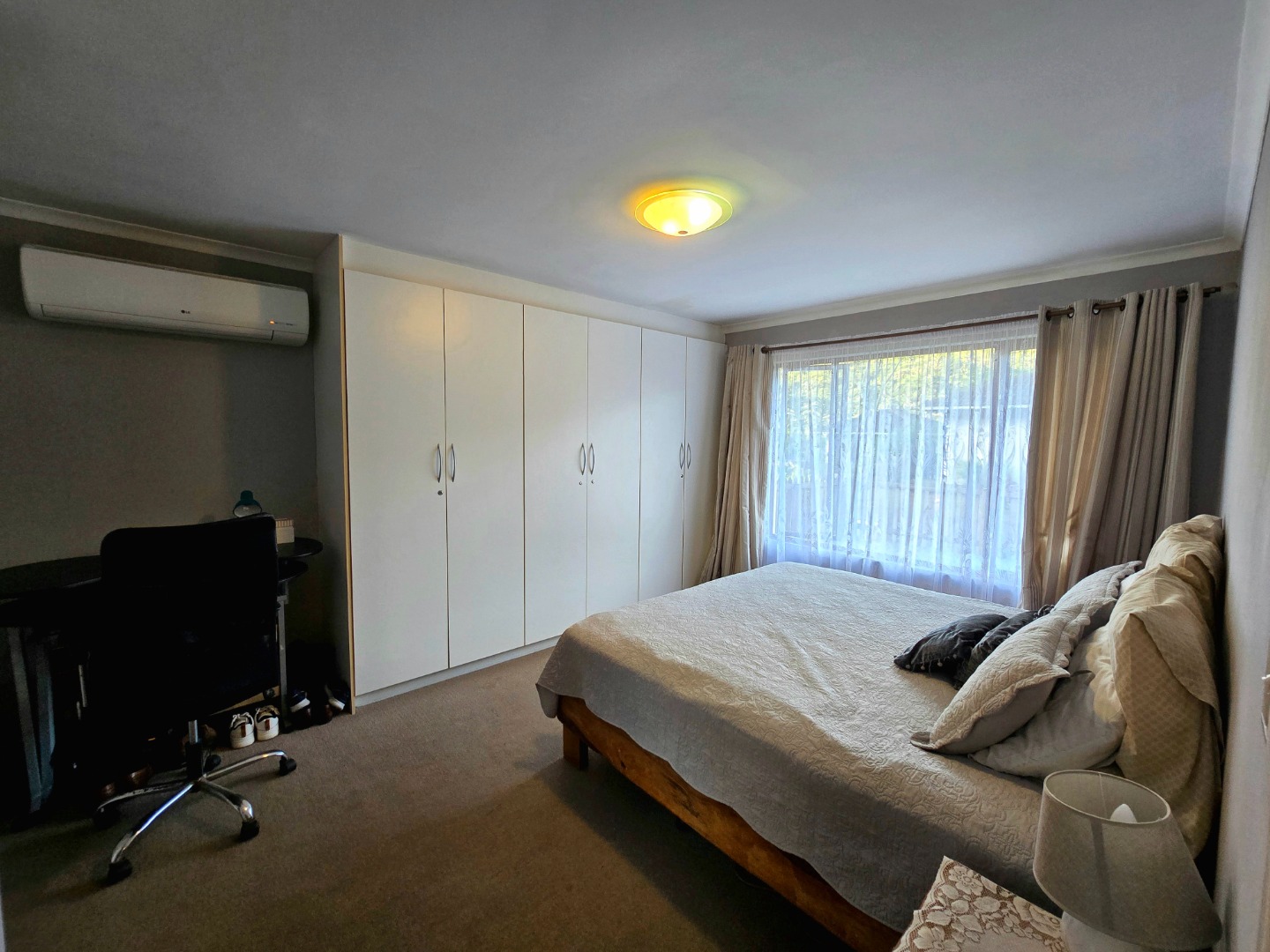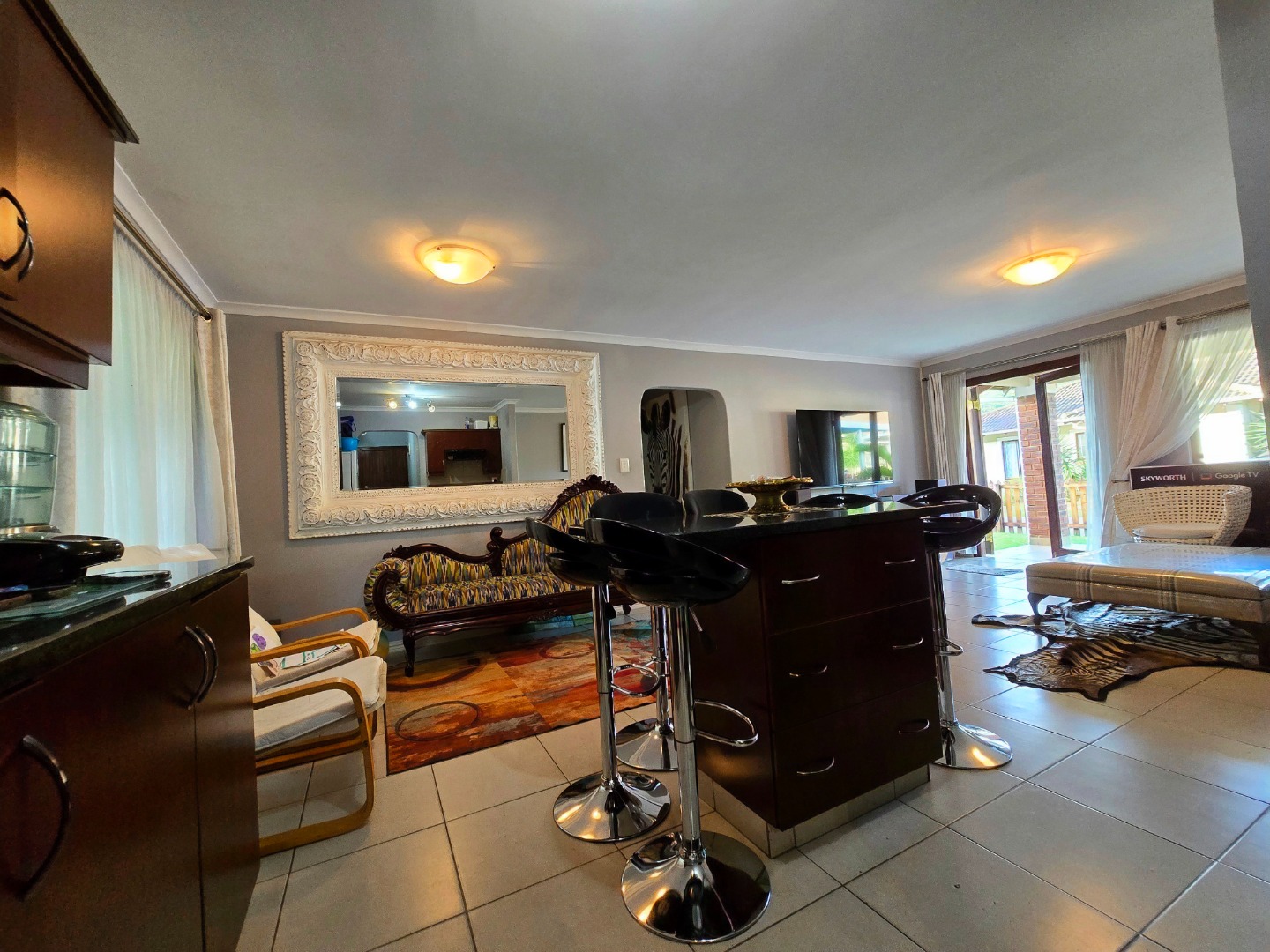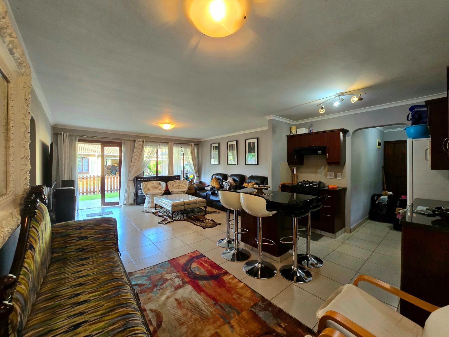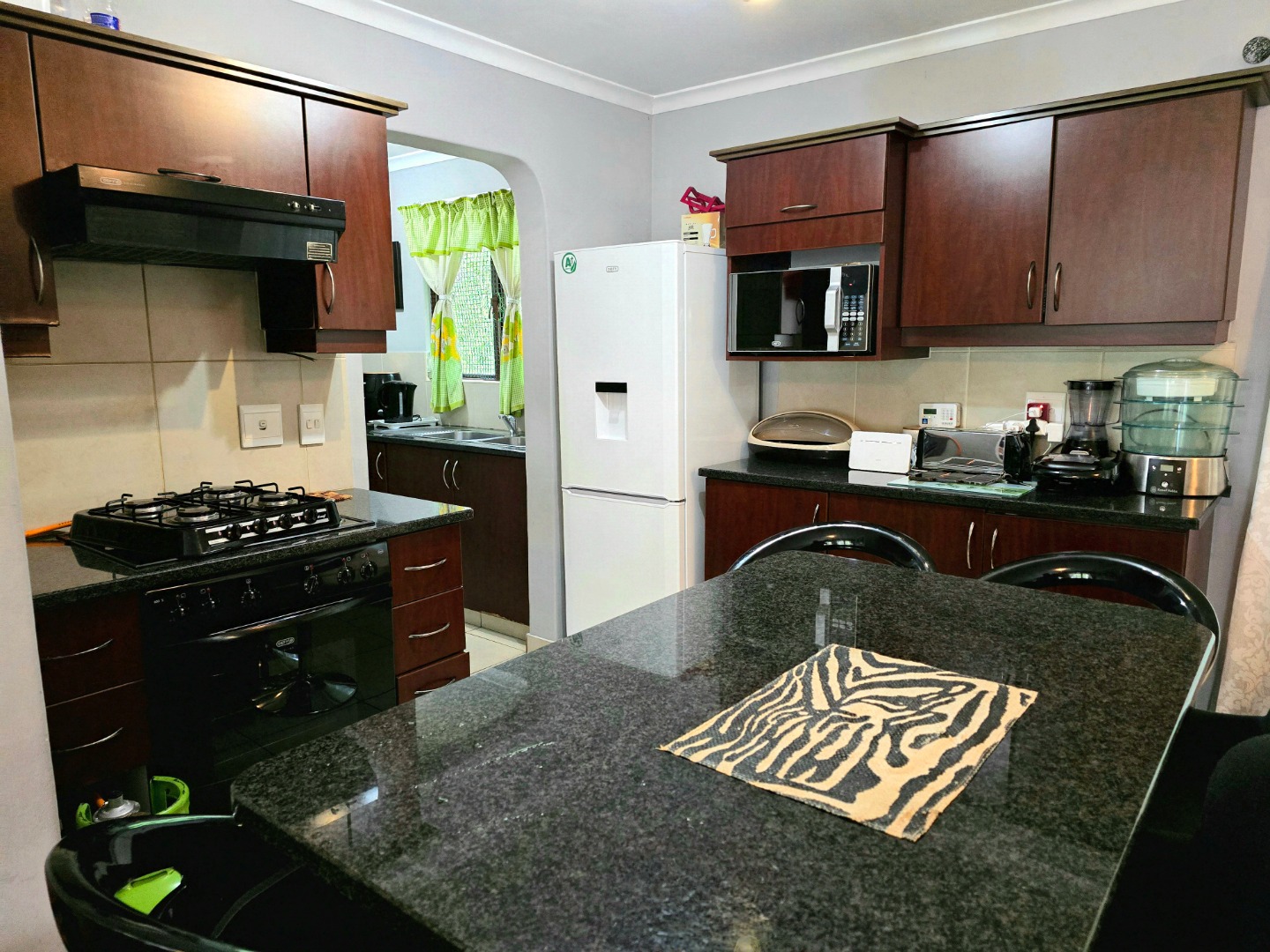 Step inside and you’ll find a welcoming open-plan living space that effortlessly connects the lounge, dining, and kitchen areas. It’s super bright thanks to large windows, and the tiled flooring throughout makes cleaning a breeze. The kitchen is a real highlight, boasting stylish dark wood cabinets, sleek granite countertops, and a handy island with bar seating – ideal for casual meals or entertaining friends. Plus, it comes with an integrated gas hob and oven, making cooking a joy. This open layout also gives you direct access to an outdoor patio, perfect for enjoying the fresh air.