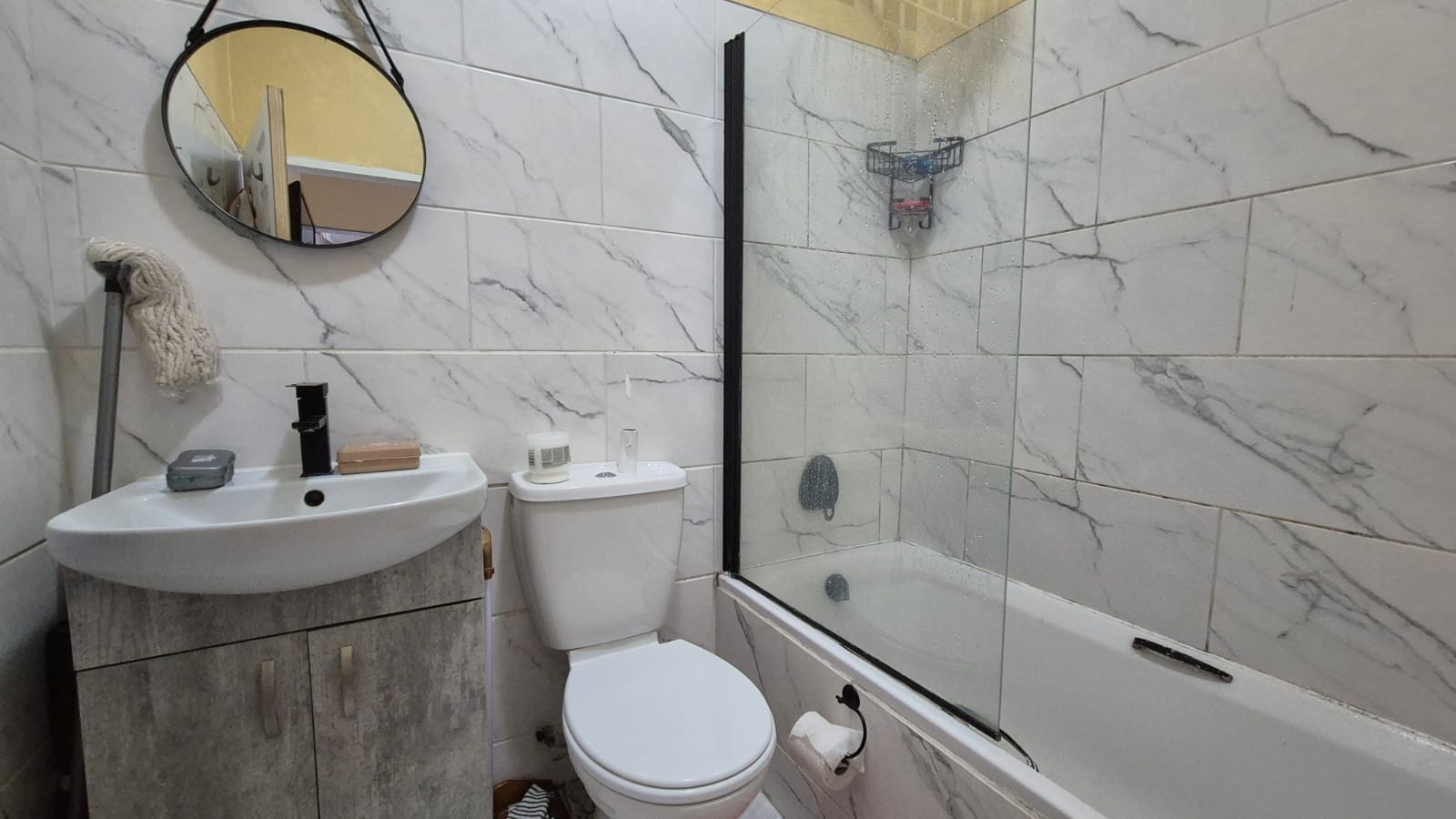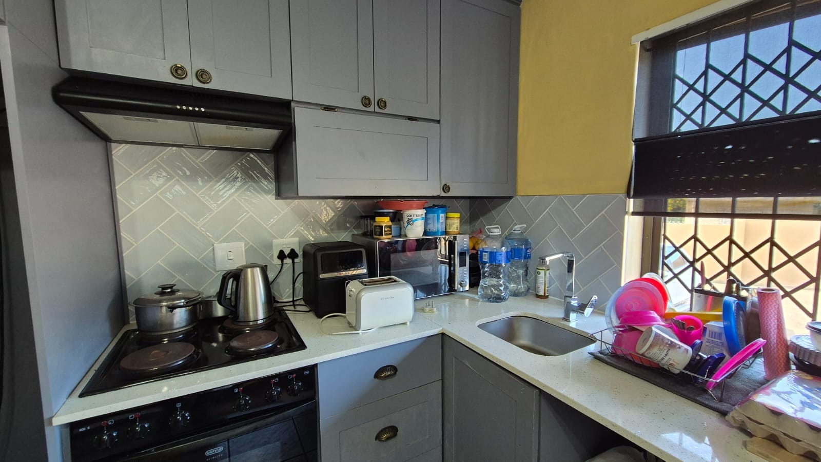 This neat 1-bedroom unit offers an open-plan lounge and kitchen, with quartz countertops, an undercounter oven, hob, and extractor fan. Tiled throughout and fitted with blinds and curtains – all of which stay – this home is move-in ready.