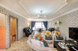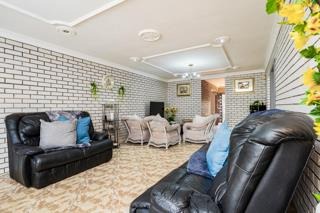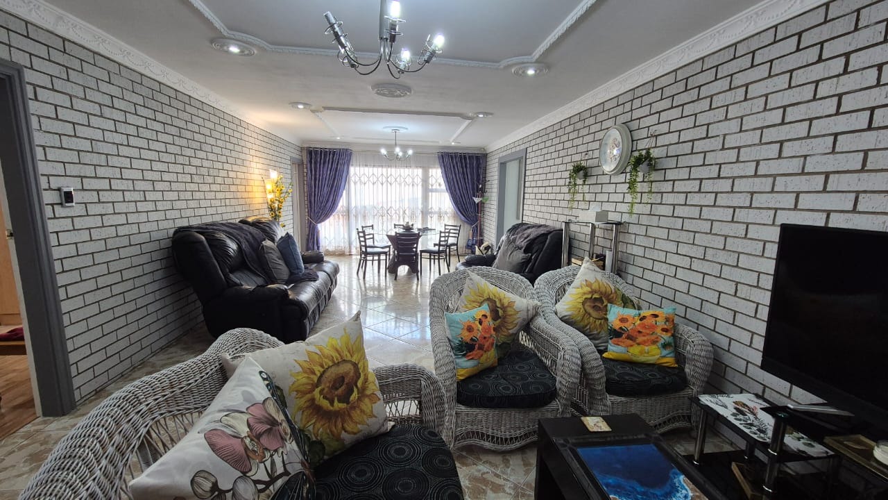 Spanning an impressive 420 square metres, the interior is designed for spacious living. The open-plan layout seamlessly connects the dining area with two distinct lounges, one serving as a dedicated family TV room. These communal spaces feature practical tiled flooring, decorative ceilings with recessed lighting, and a unique white brick-look accent wall. Large windows invite natural light, and air conditioning ensures year-round comfort. Sliding doors facilitate an effortless indoor-outdoor flow.