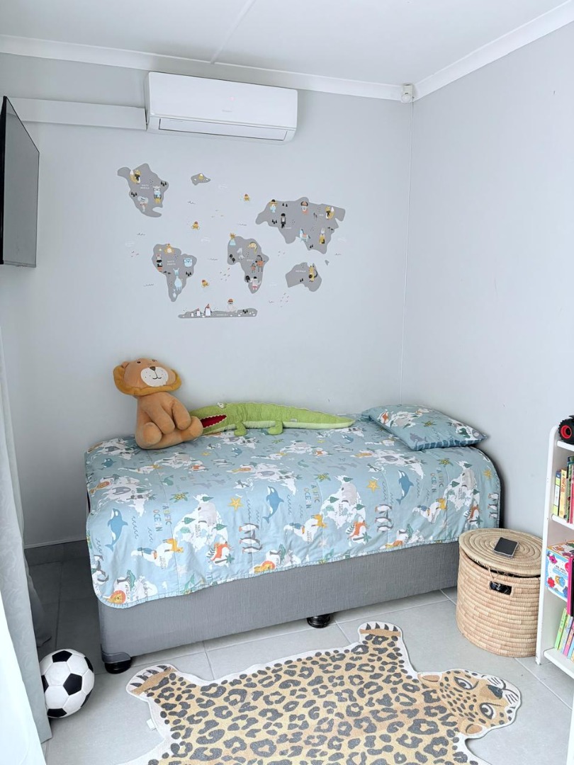 The home offers three comfy bedrooms and two bathrooms, including a convenient en-suite. Each bedroom is designed for relaxation, with built-in wardrobes for all your storage needs and durable tiled flooring. You'll appreciate the natural light streaming in, and the air conditioning units ensure you stay cool and comfortable all year round. Security is also well taken care of with an alarm system, access gate, and security bars on windows and sliding doors, giving you peace of mind.