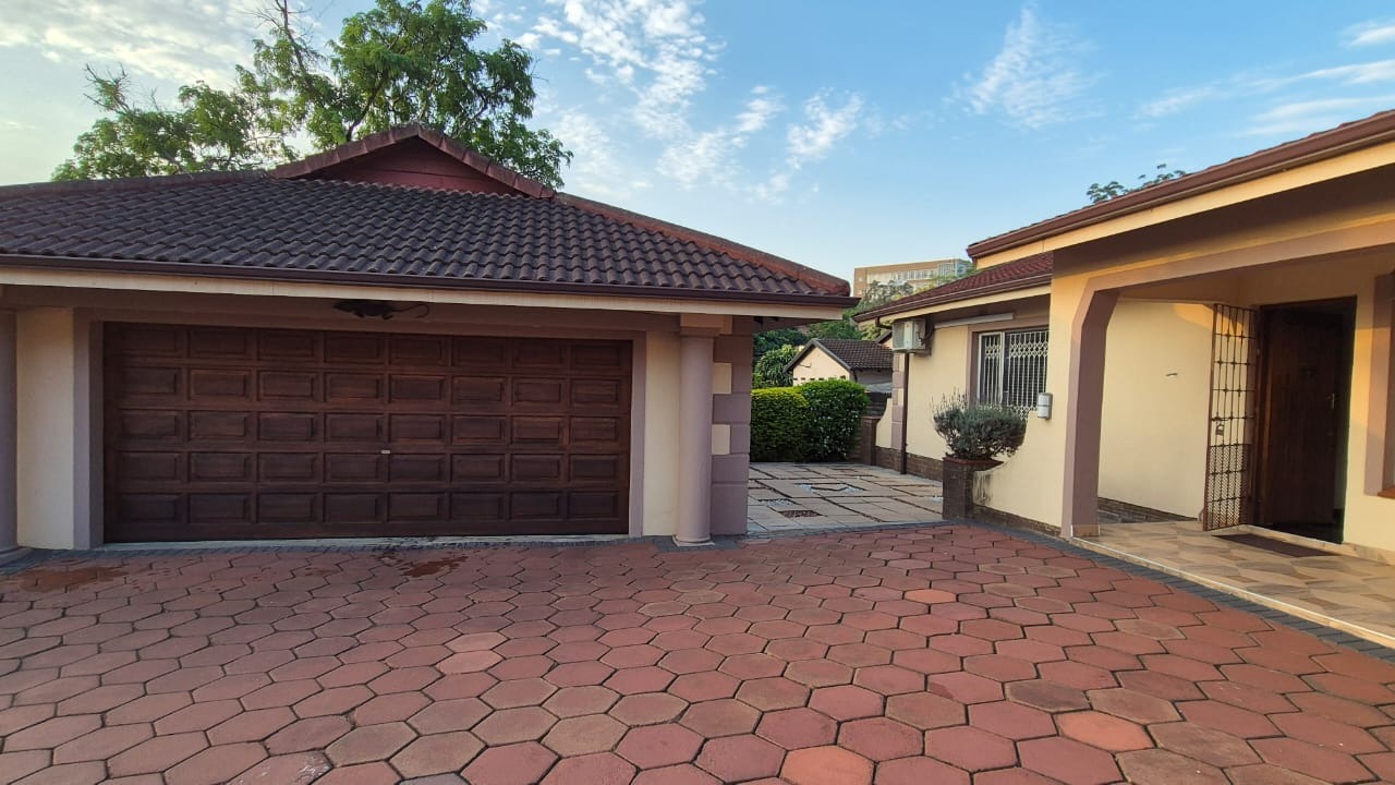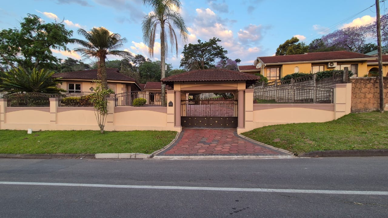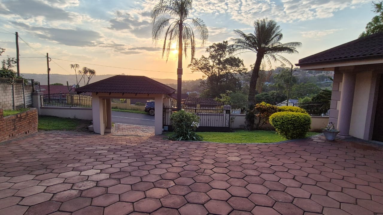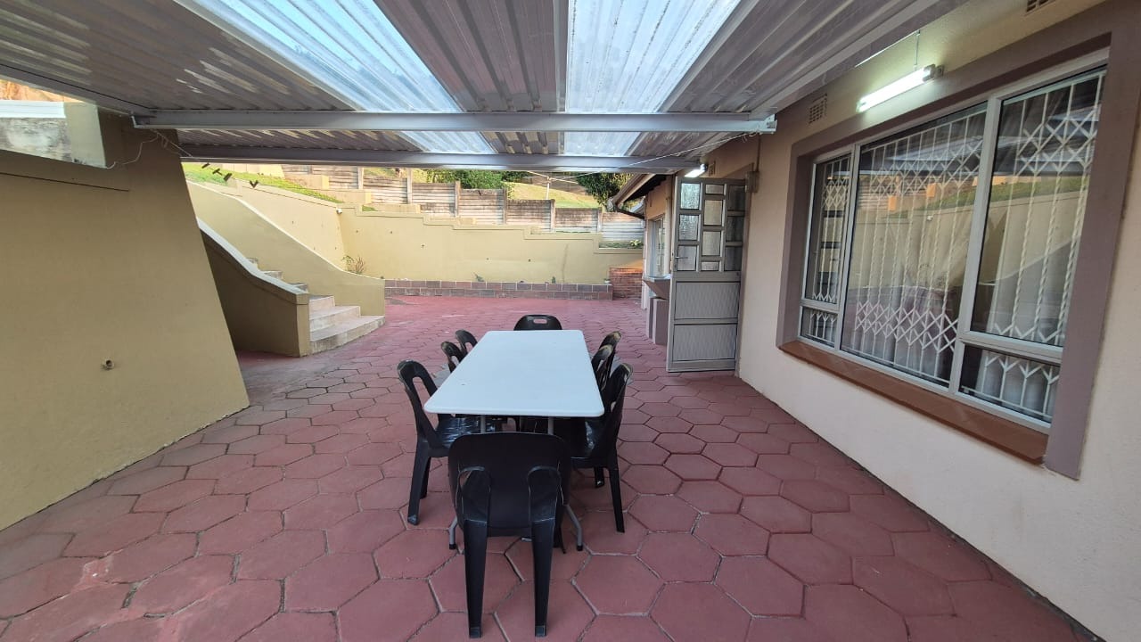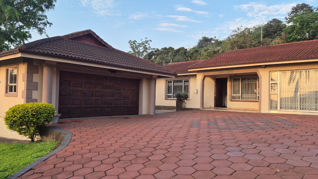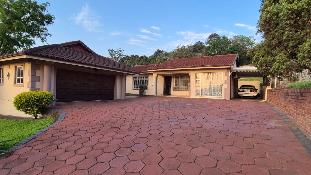 This move-in-ready single-story residence in Escombe, Queensburgh, presents an impressive kerb appeal, characterised by a prominent red tiled roof and a meticulously maintained hexagonal paved driveway. The property offers extensive parking solutions, including an attached double garage and an additional covered double carport, accommodating up to seven vehicles. Surrounded by trees and lush greenery, the exterior exudes a tranquil ambiance, complemented by robust security features such as security gates and window bars.