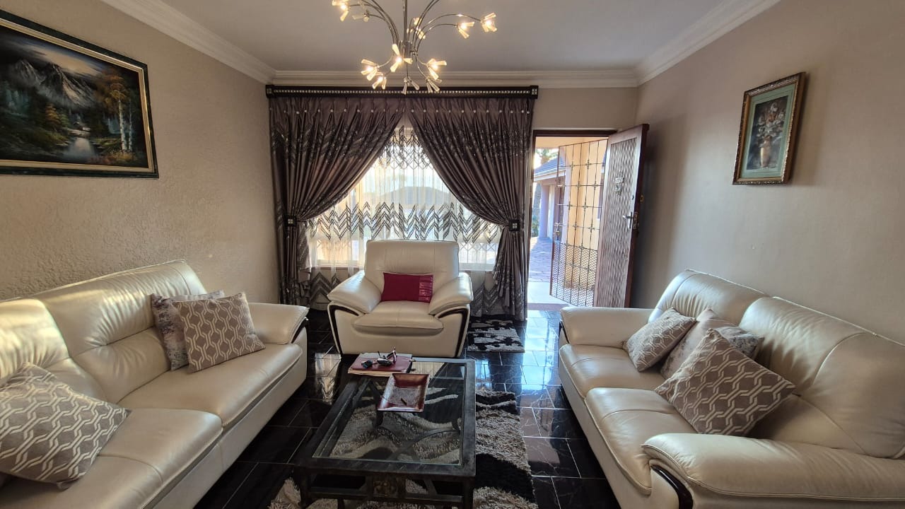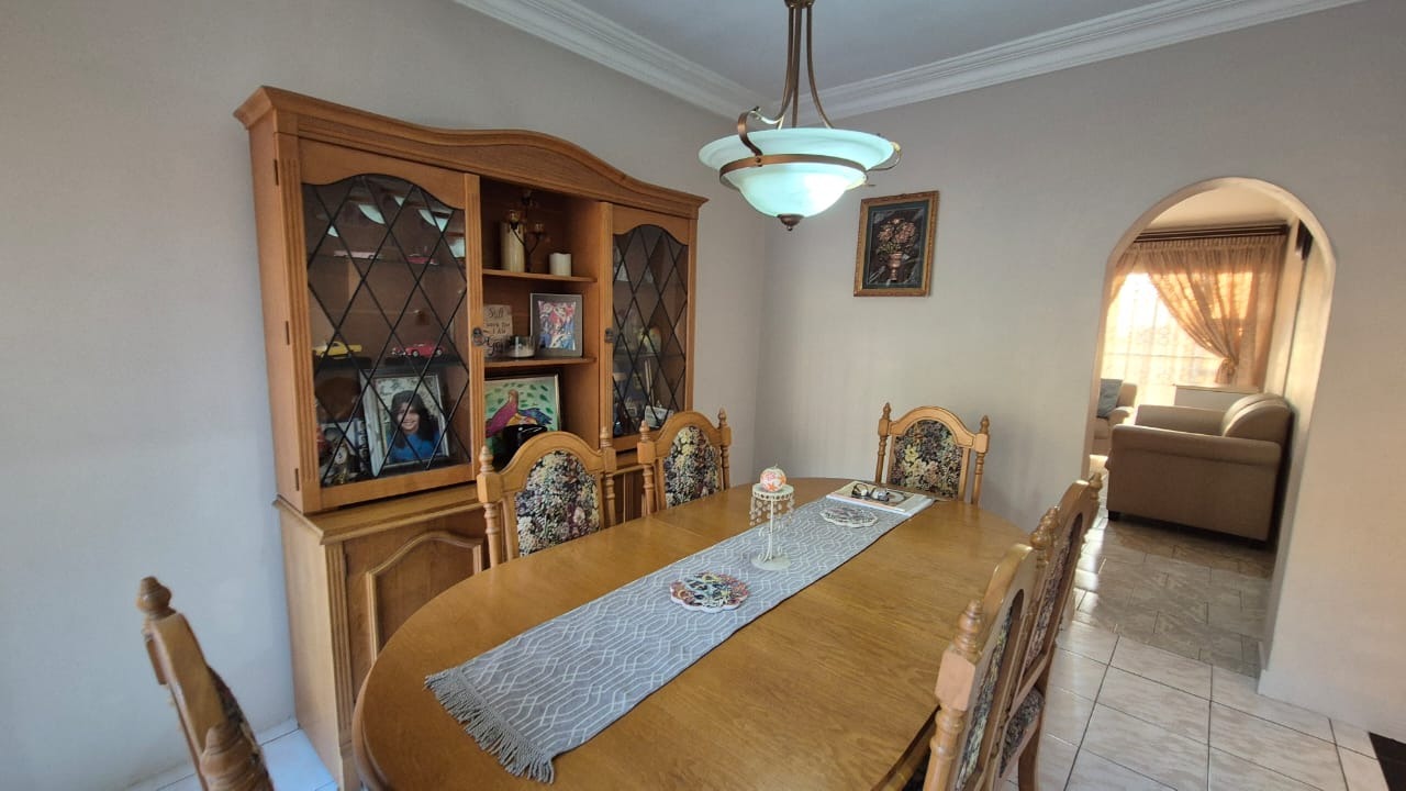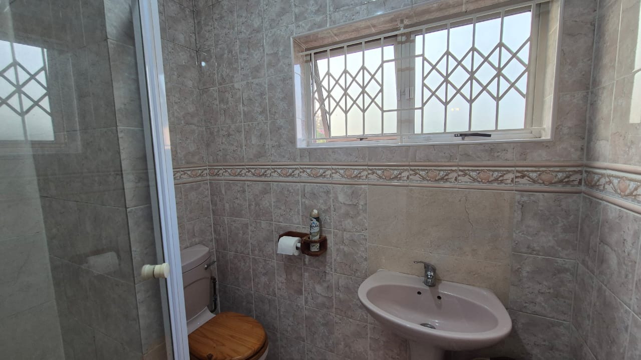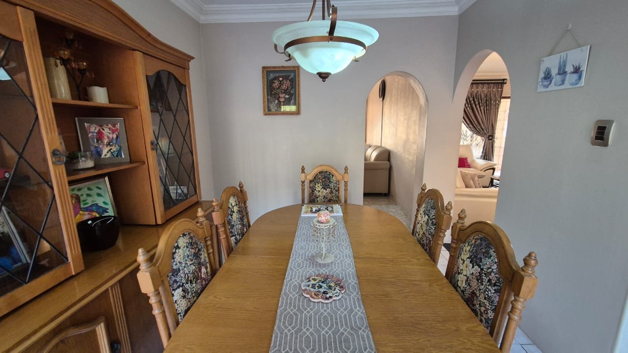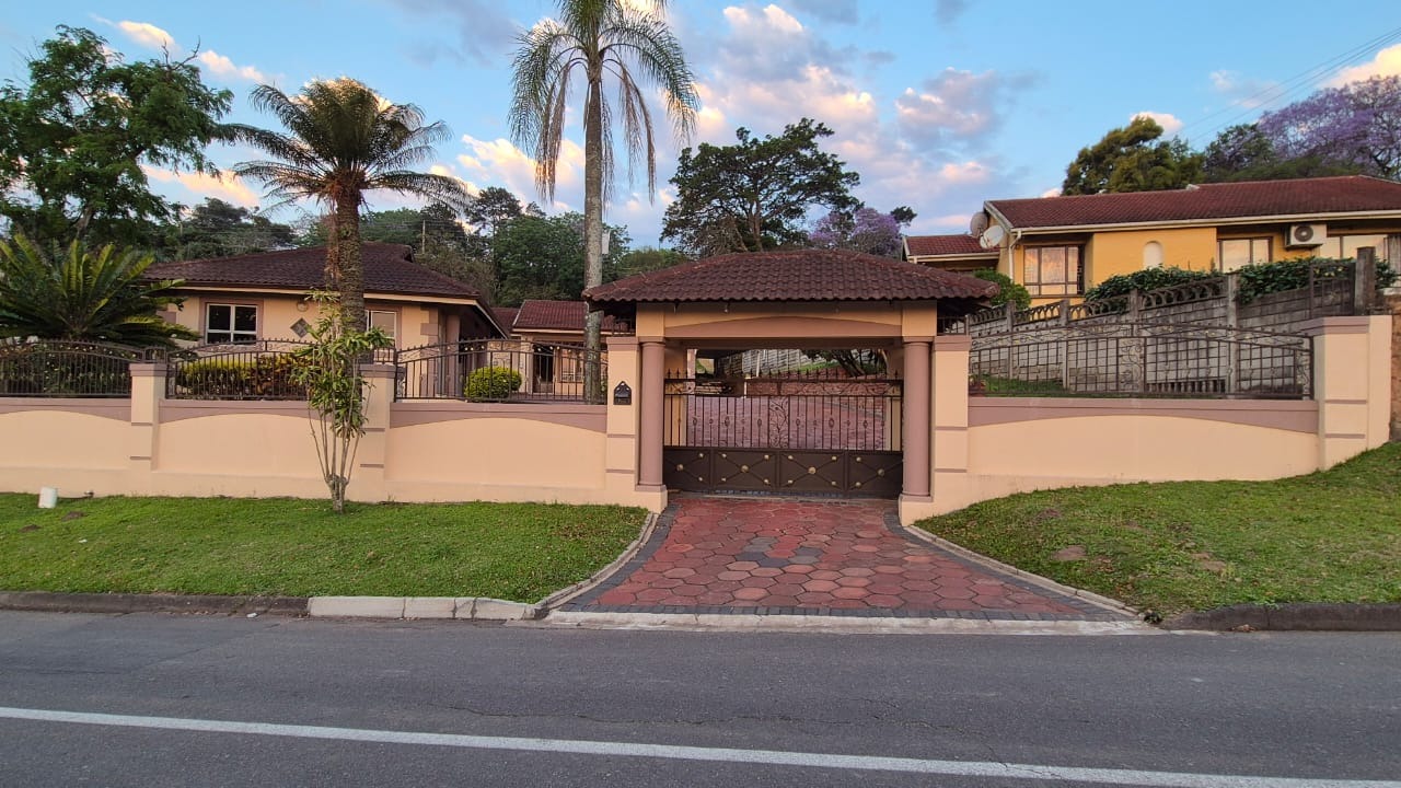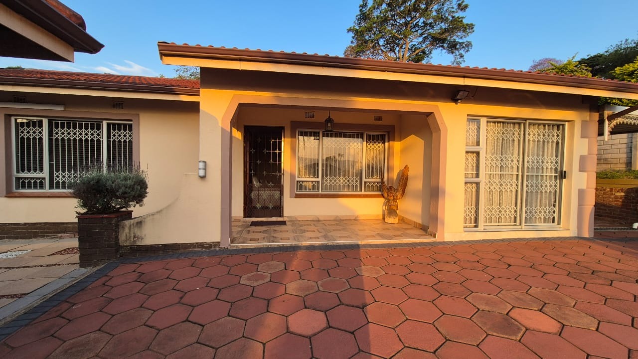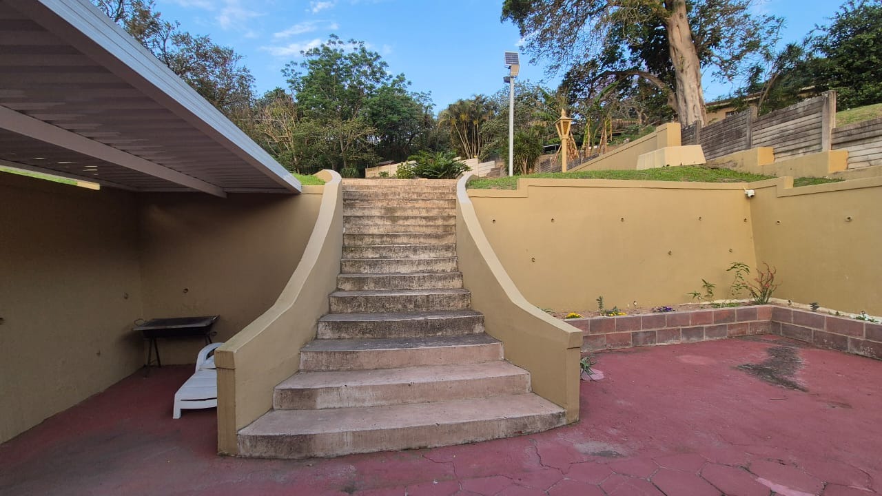 This move-in-ready single-story residence in Escombe, Queensburgh, presents an impressive kerb appeal, characterised by a prominent red tiled roof and a meticulously maintained hexagonal paved driveway. The property offers extensive parking solutions, including an attached double garage and an additional covered double carport, accommodating up to seven vehicles. Surrounded by trees and lush greenery, the exterior exudes a tranquil ambiance, complemented by robust security features such as security gates and window bars.