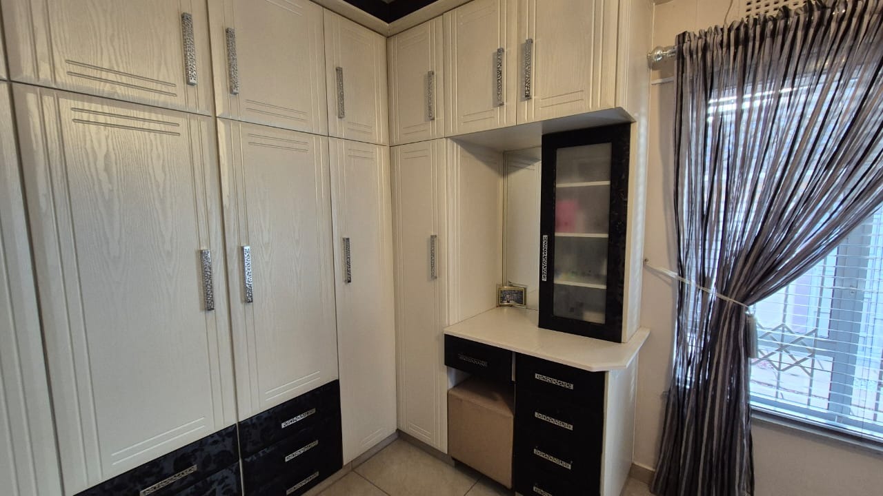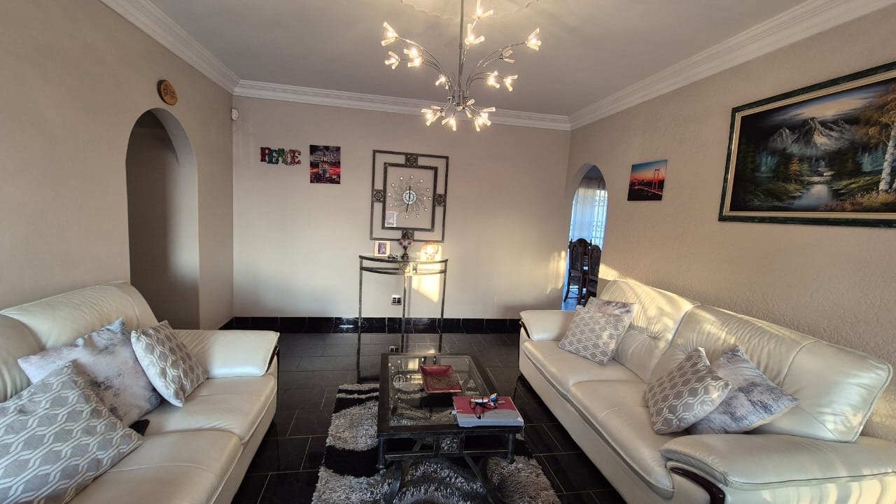 Upon entry, the interior reveals a spacious and well-lit living area, distinguished by decorative archways, elegant crown moulding, and a contemporary chandelier, all set against durable black tiled flooring. The dedicated dining room, ideal for entertaining, benefits from abundant natural light through sliding glass doors, secured with a sliding gate. The functional kitchen is equipped with an integrated electric hob, oven, stainless steel extractor hood, mixed cabinetry, and granite-look countertops.