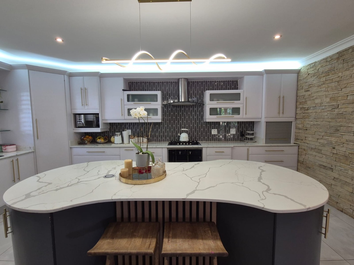 quartz countertops, a stylish curved breakfast nook and additional worktop