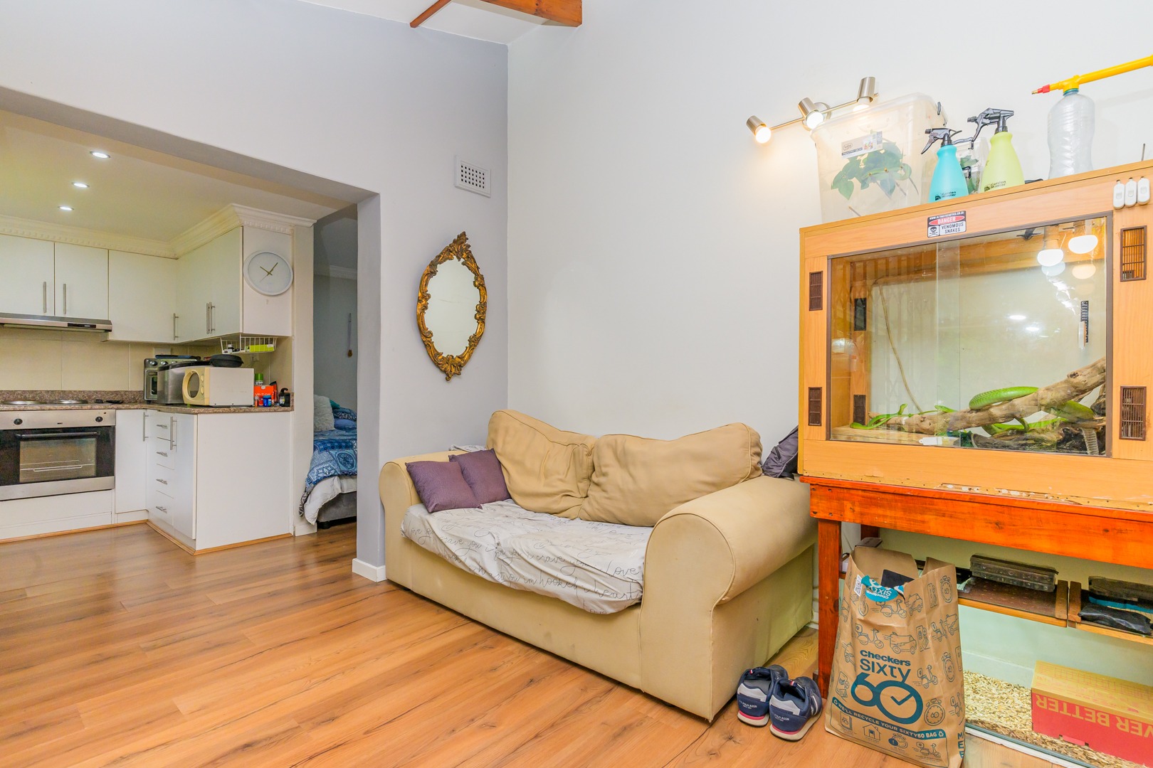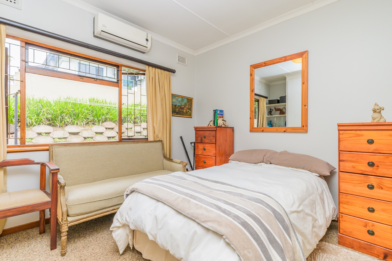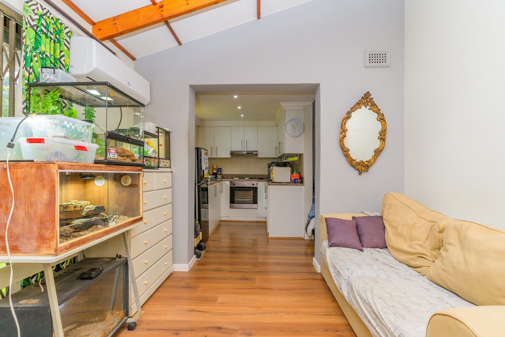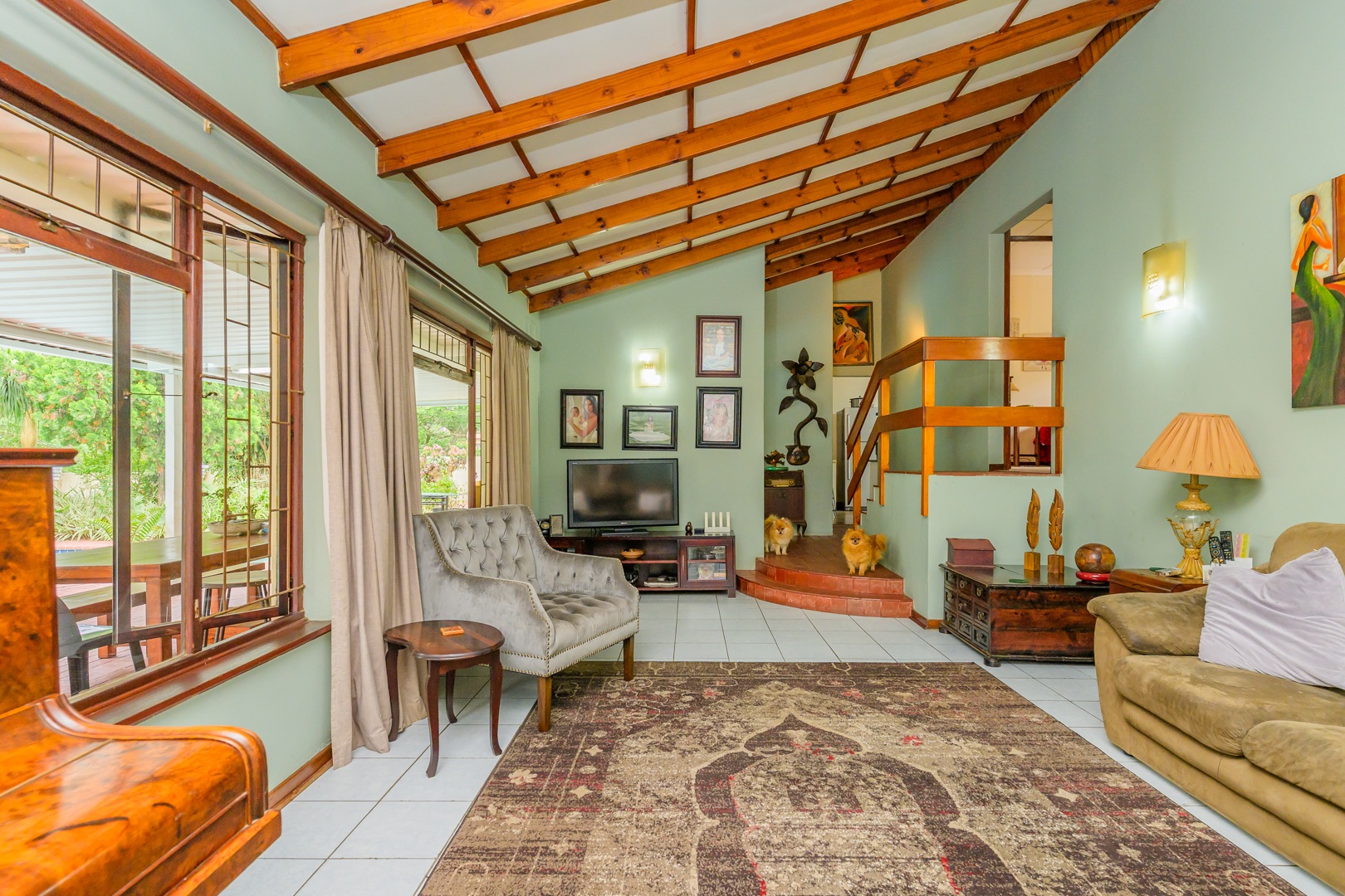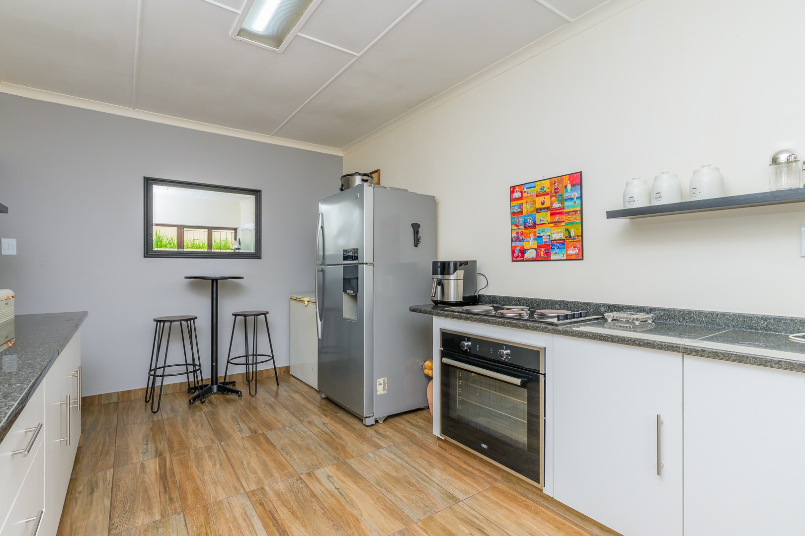 Added to this is an air conditioned flatlet consisting of a kitchen with built in cupboards and downlights, a lounge and a bedroom with an en suite. It can easily be accessed to be a fourth bedroom, a second lounge and a second kitchen by simply opening up a door.