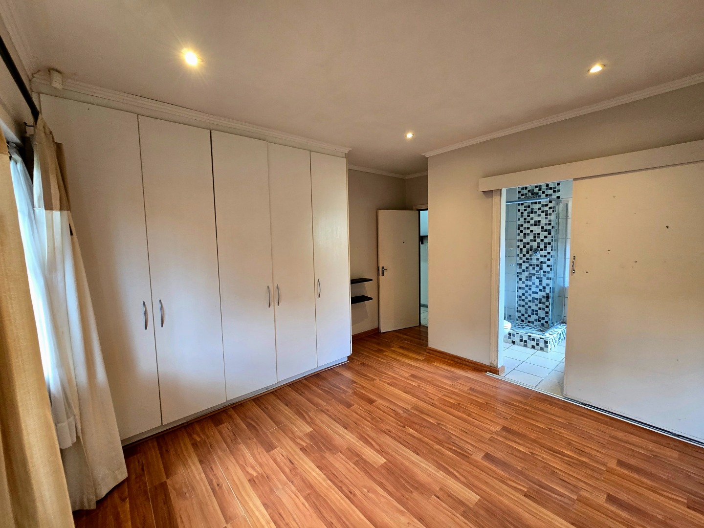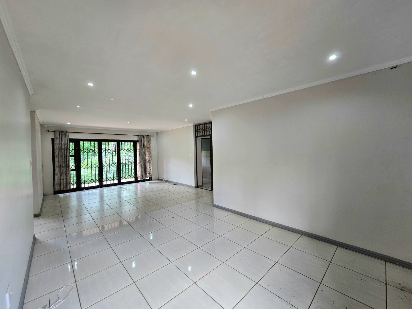 Step inside and you'll find a spacious, open-plan lounge area that's just waiting for your personal touch. It's bright and airy thanks to large glass doors, which also come with security gates for your peace of mind. The tiled flooring throughout the living spaces makes for easy cleaning and a fresh look. The kitchen is super functional with an L-shaped layout, featuring warm wood cabinetry, black countertops, and built-in appliances like an oven, stovetop, and extractor fan. There's also ample storage, including a handy pantry-like unit, and a double sink, making meal prep a breeze.