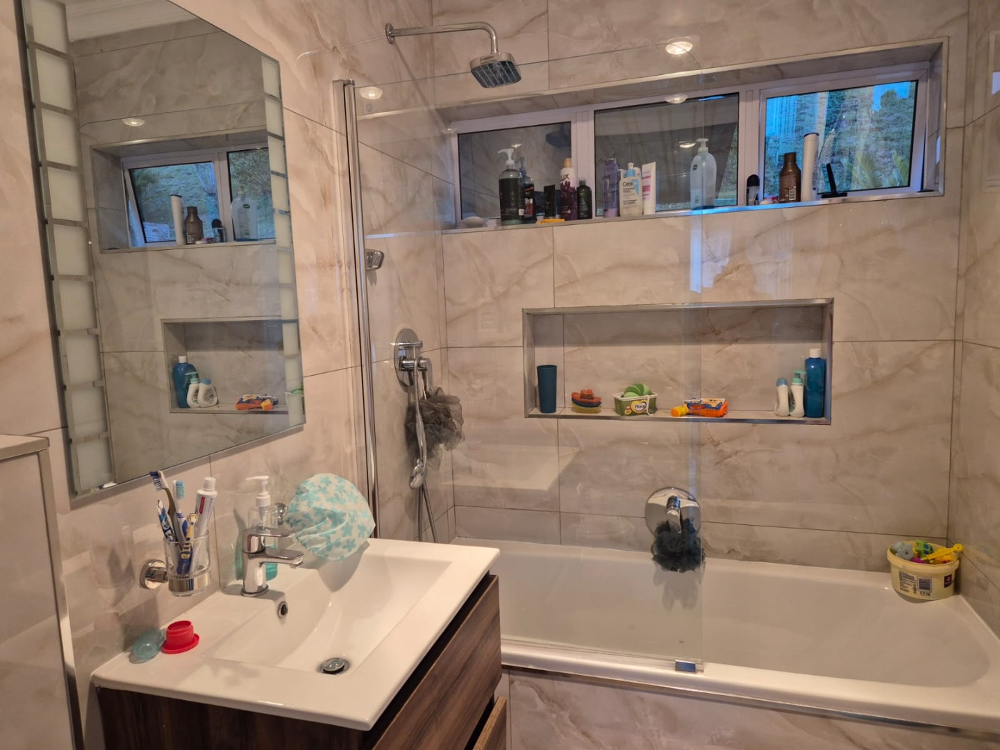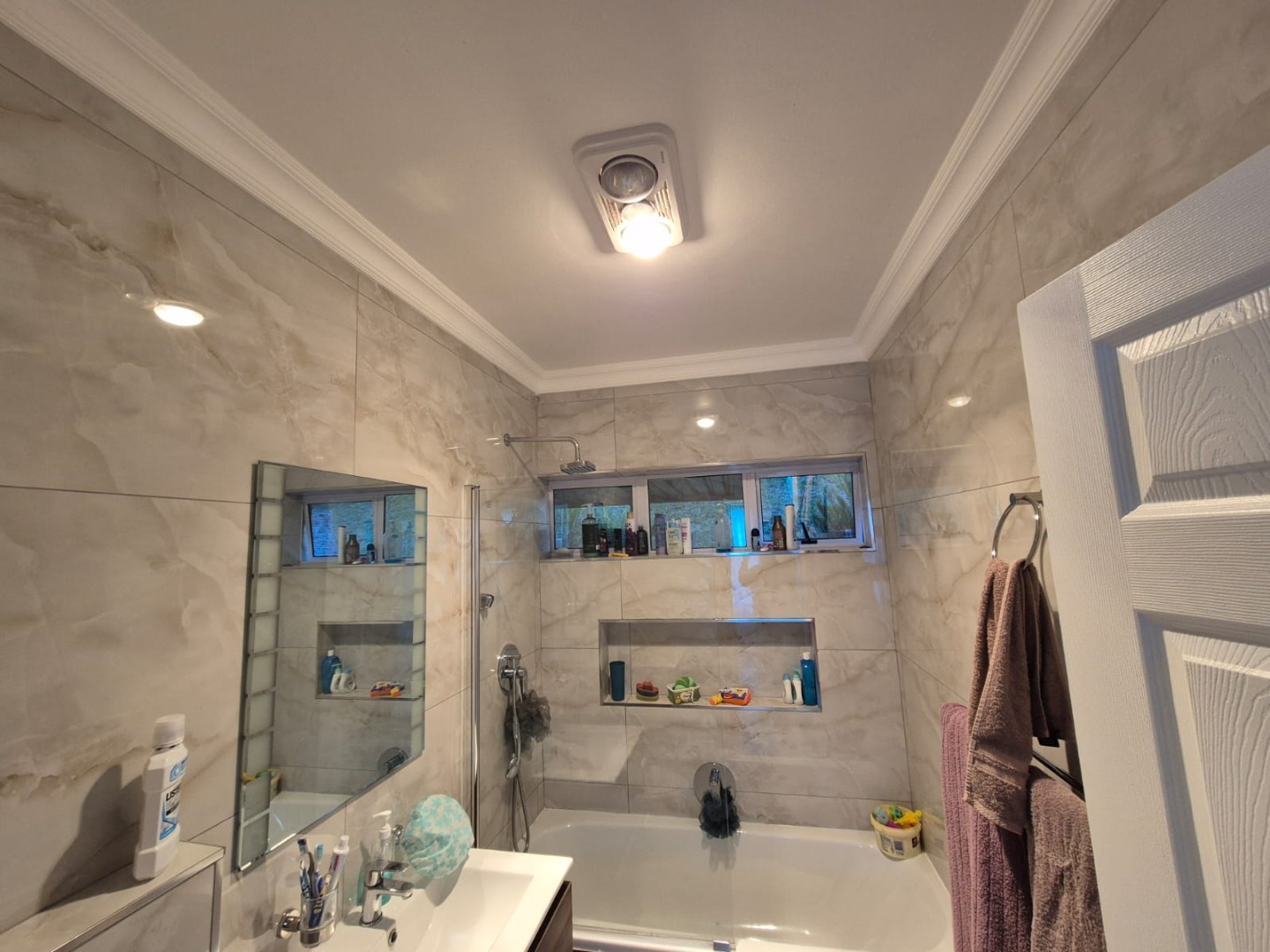 All three bedrooms are well-sized, with two featuring modern white cupboards with soft-close mechanisms, and the home is finished with a combination of tiles and laminate flooring for a clean, modern feel. The recently renovated bathroom is thoughtfully designed with both a bathtub and a built-in shower, making it ideal for families and adults alike.