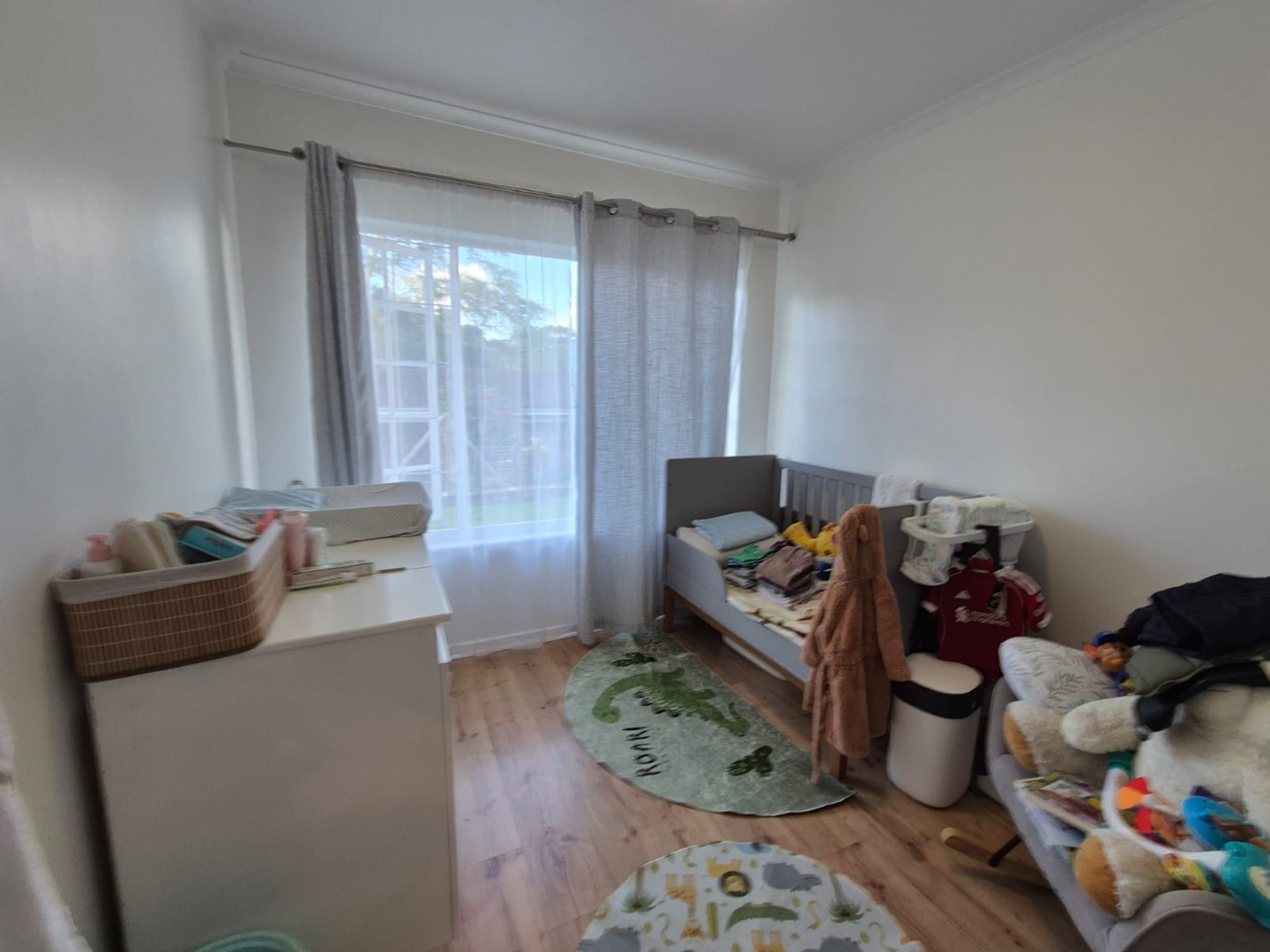All three bedrooms are well-sized, with two featuring modern white cupboards with soft-close mechanisms, and the home is finished with a combination of tiles and laminate flooring for a clean, modern feel. The recently renovated bathroom is thoughtfully designed with both a bathtub and a built-in shower, making it ideal for families and adults alike.
