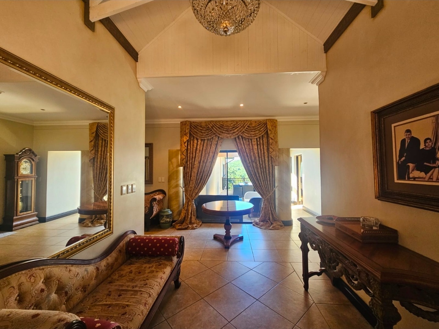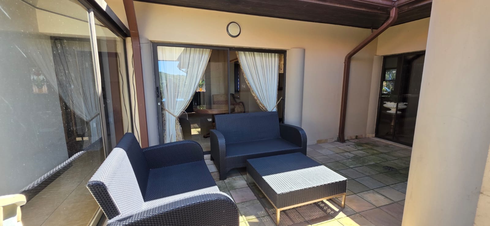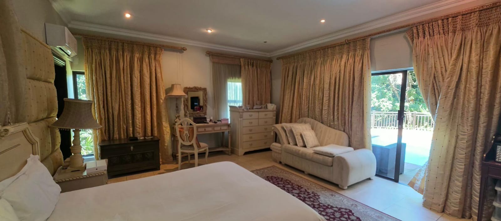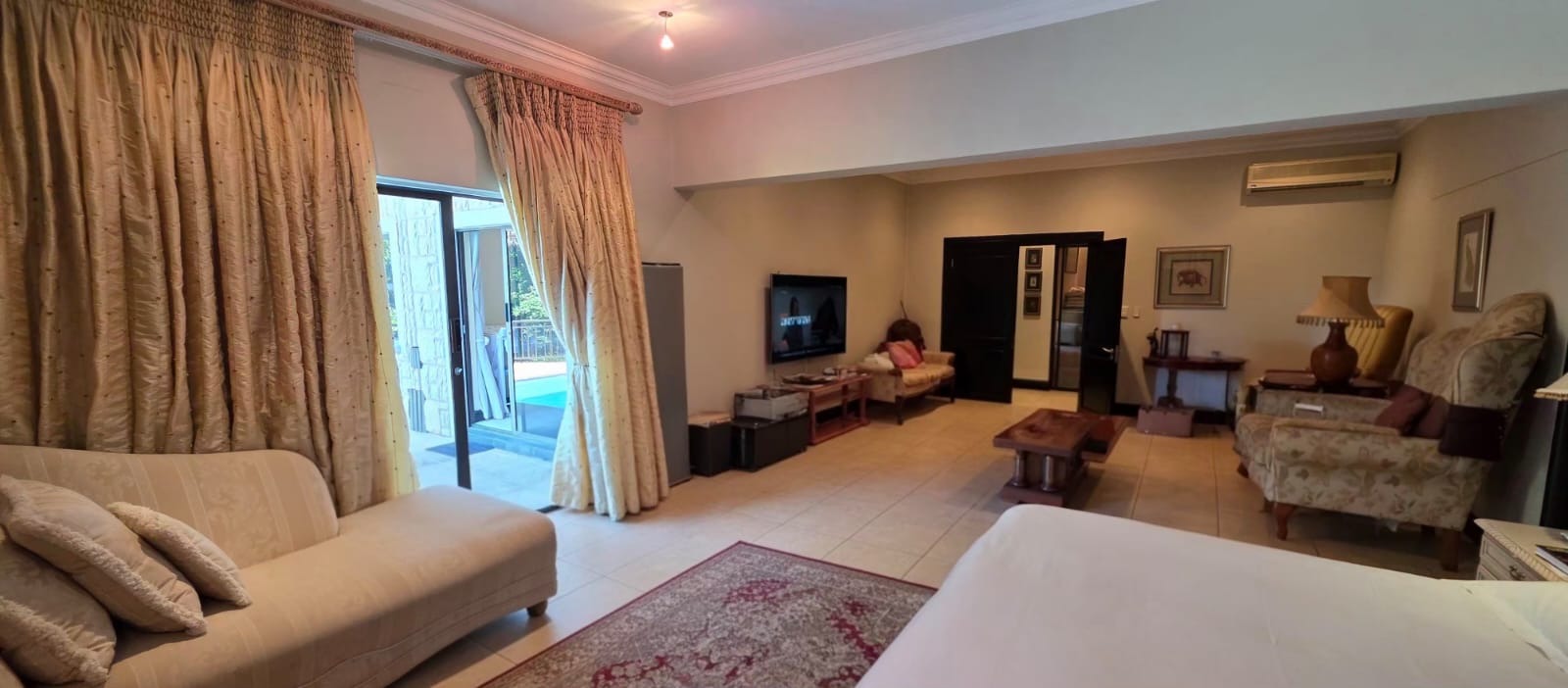 Large doors open onto the garden and pool area, blending indoor comfort with outdoor living.