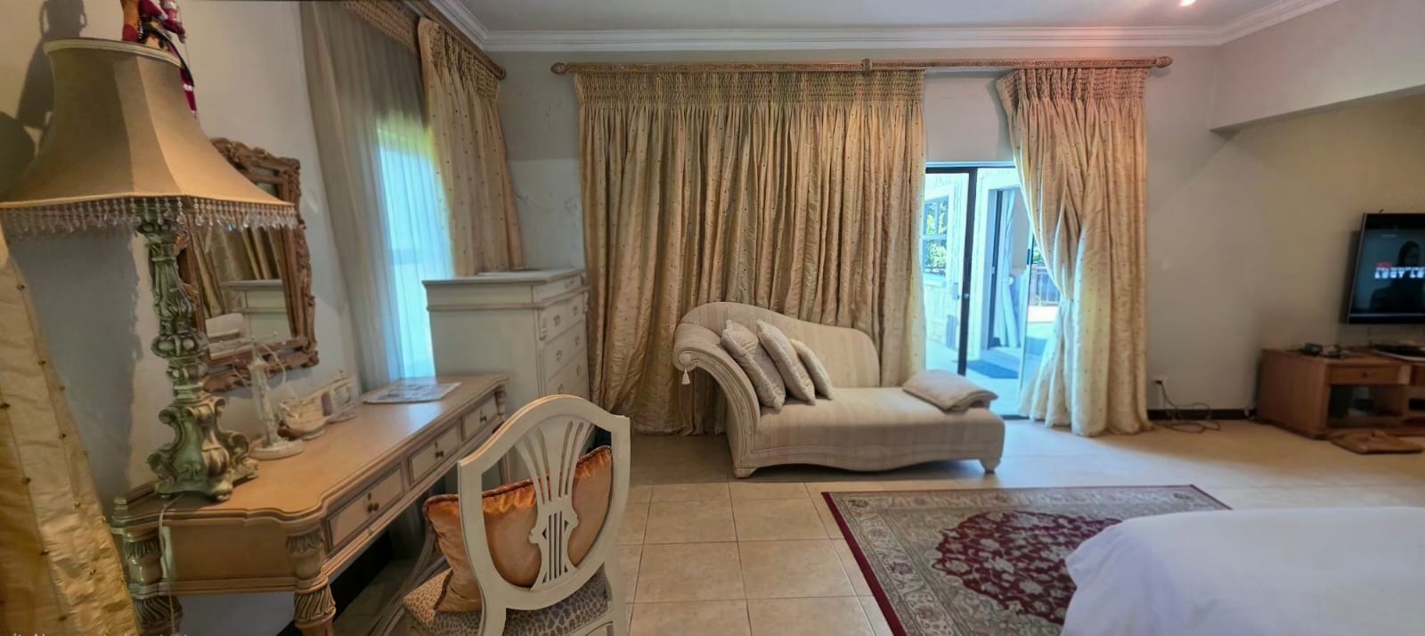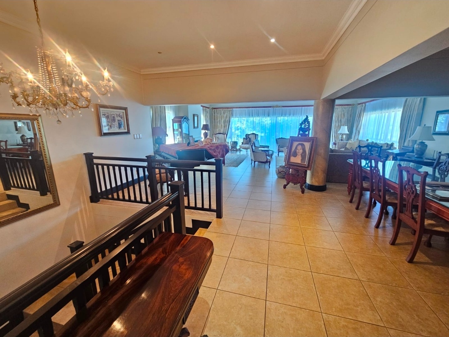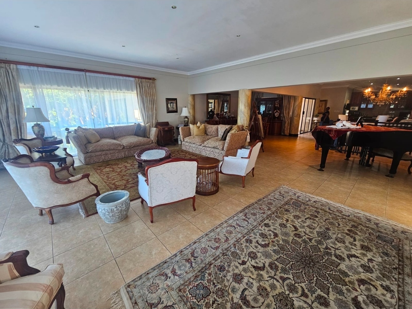 Large doors open onto the garden and pool area, blending indoor comfort with outdoor living.