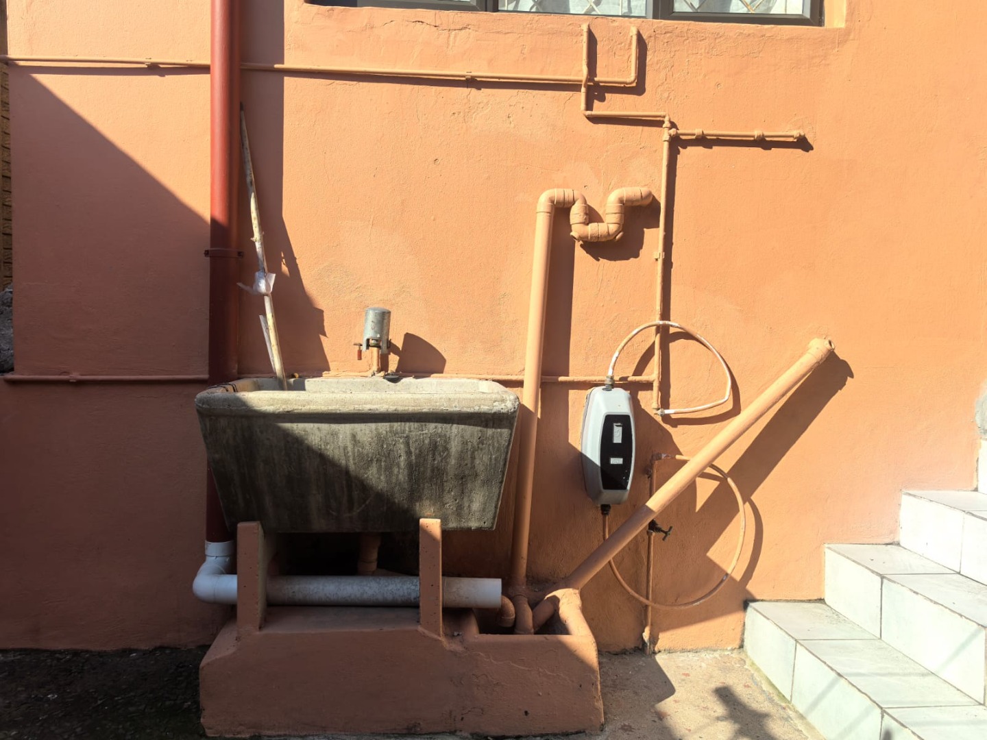 The single bathroom is fully tiled, featuring a shower, toilet, and sink, designed for practicality and easy maintenance. While functional, the space is clean and well-kept. The exterior of the property presents a neat, recently painted orange facade with tiled entrance steps, contributing to its kerb appeal. Despite some visible exterior plumbing, the overall impression is one of a well-maintained rental opportunity.