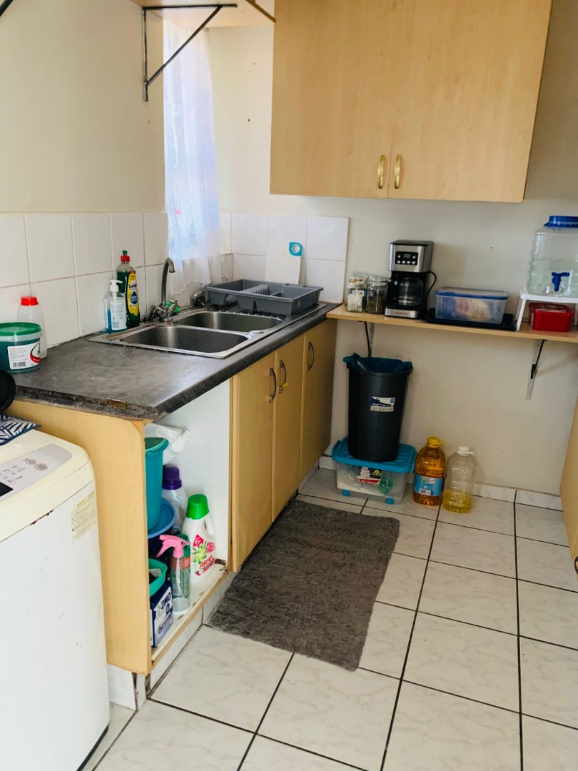 This practical 2-bedroom, 1-bathroom rental property in Bluff, Durban offers a comfortable living environment. The main living area is bright, with neutral walls and ample space for relaxation. The functional kitchen is equipped with a double sink, wood-look cabinetry for storage, and a dedicated space for a washing machine, catering to everyday needs. A classic wooden staircase connects the levels, adding a touch of traditional charm.