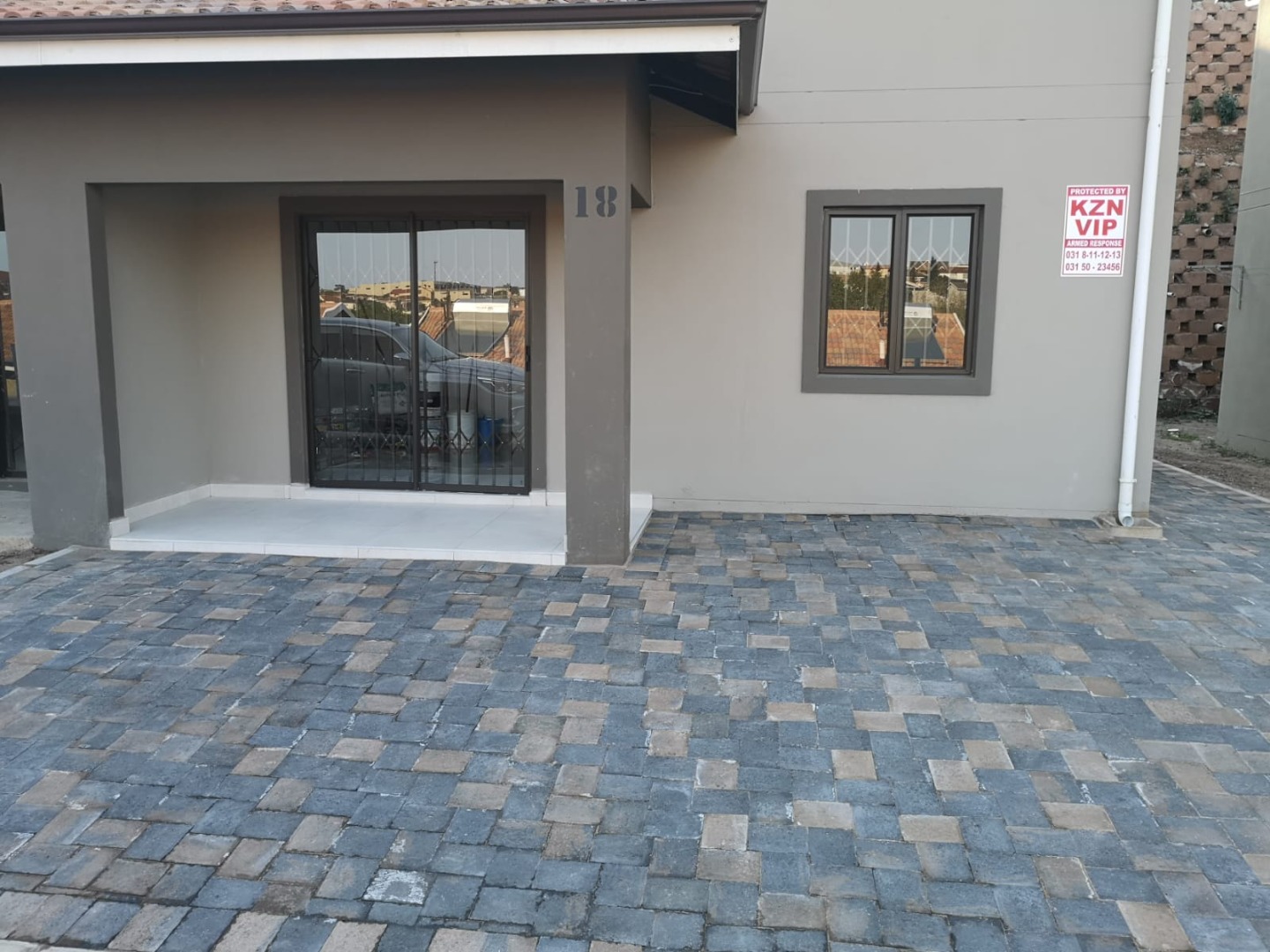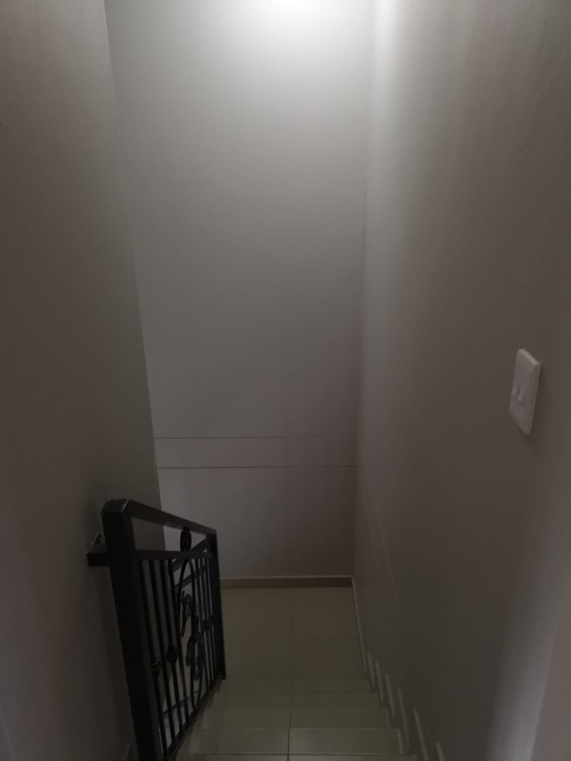 Downstairs has modern fully fitted kitchen with granite tops, large lounge and dining room with sliding door, all with burglar bars. Back yard is enclosed parking for 2 cars.