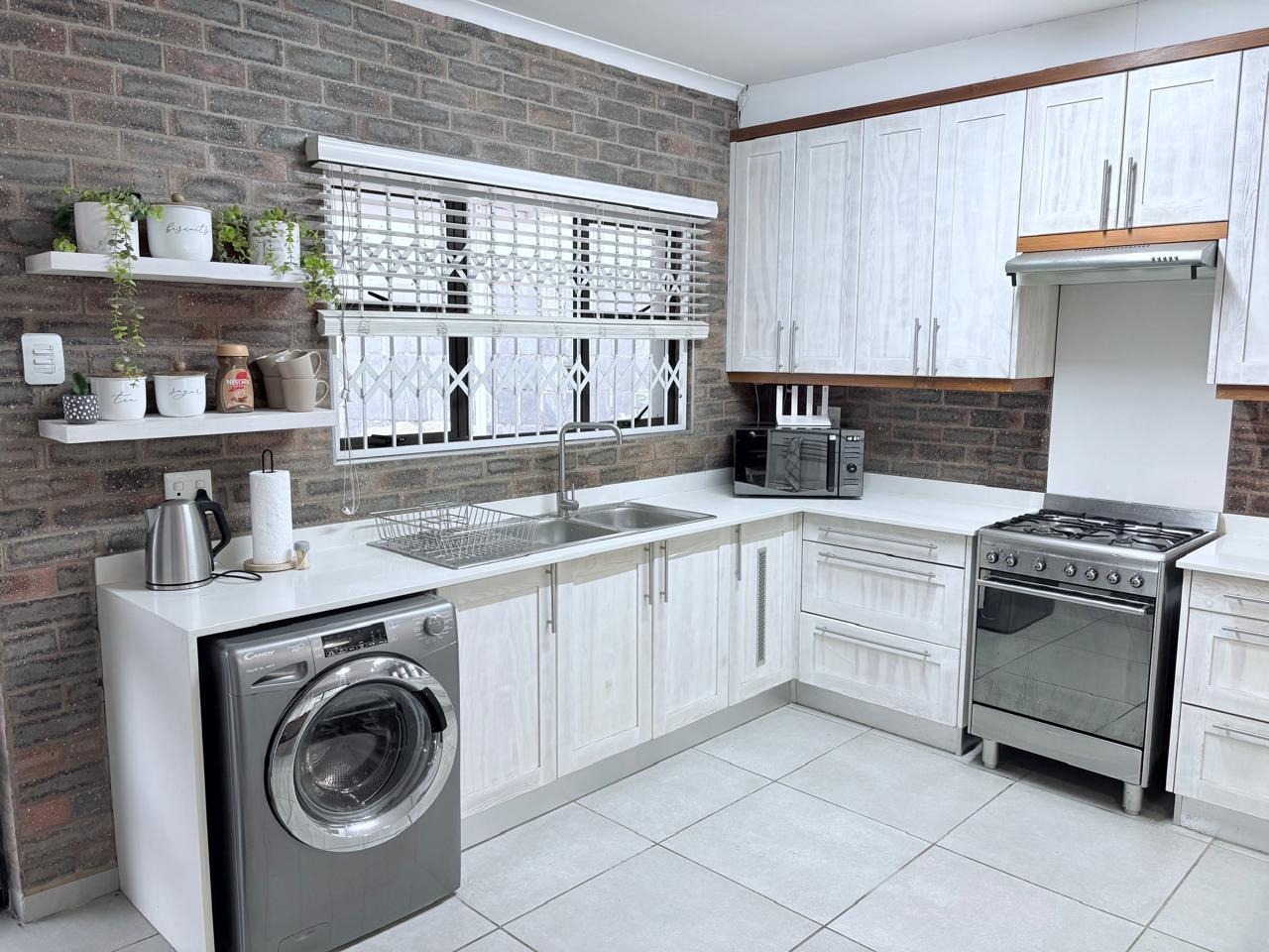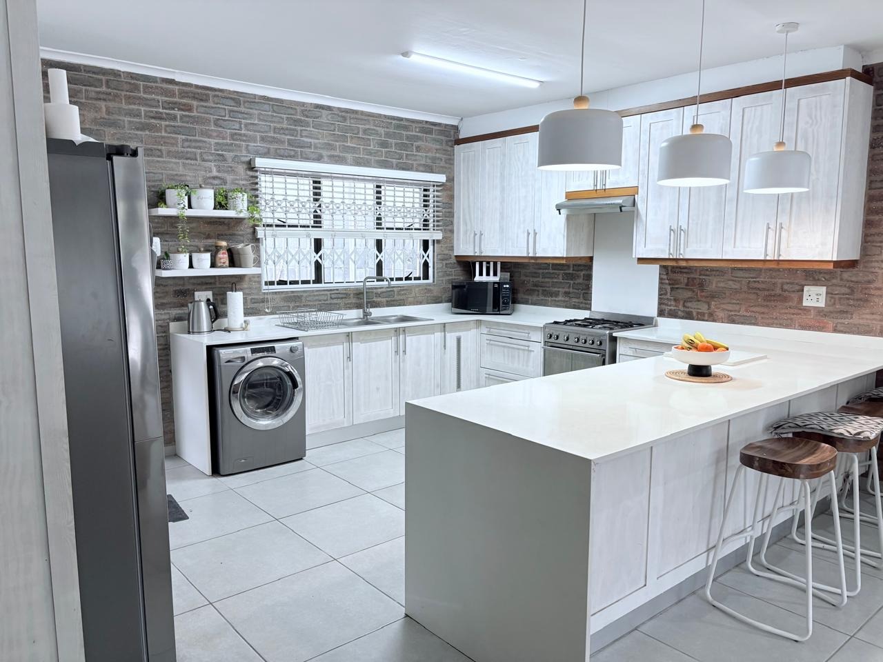 Looking for a comfy family home to rent in Queensburgh? This lovely 3-bedroom, 2-bathroom house in Malvern offers a fantastic lifestyle with plenty of space for everyone. You'll find a welcoming open-plan layout that connects the modern kitchen, dining area, and lounge, making it super easy to spend time together. The kitchen is a real highlight with its sleek white cabinetry, a handy island for casual meals, and cool exposed brick accent walls. Plus, it comes with a gas stovetop for your convenience. The lounge area is spacious and perfect for relaxing, complete with a large sectional sofa and a great entertainment setup.